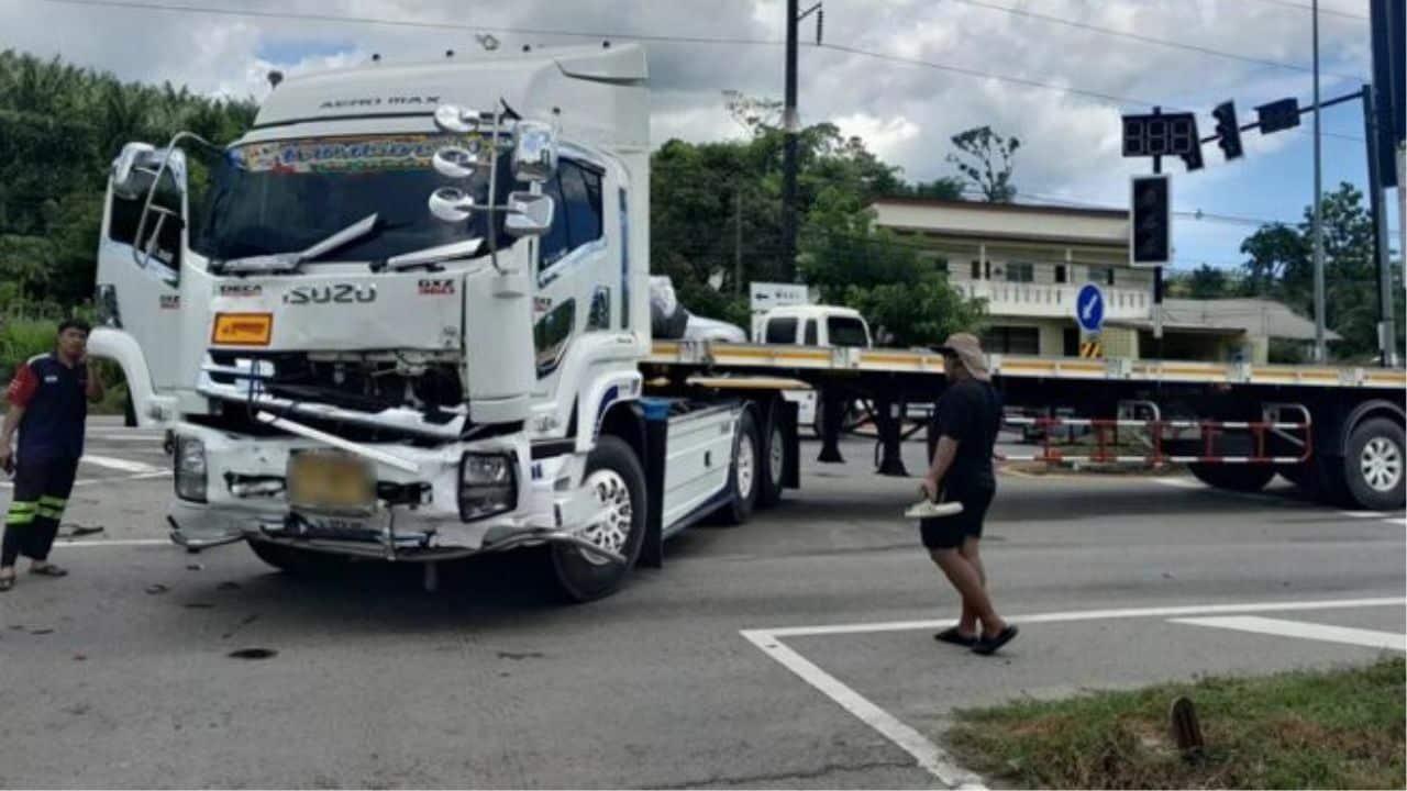 An 18-wheel truck driver reportedly fell asleep at the wheel yesterday and collided with a Nissan March, which was stationary at a red light. The incident occurred yesterday, May 19, on Phetkasem Road in Phang Nga province. This accident resulted in one death and three serious injuries.