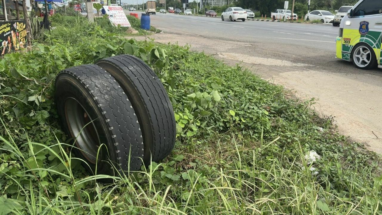 On the same day, a similar incident occurred in Khao Chakan district, Sa Kaeo province. In that case, a wheel from a 10-wheel lorry detached and struck a sidecar motorcycle parked outside a local grocery shop.