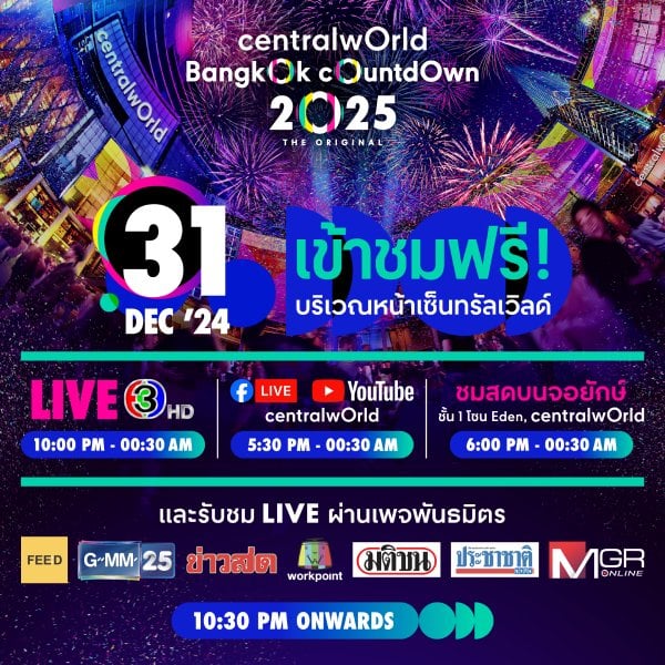 นอกจากนี้ ทุกท่านยังสามารถรับชมการถ่ายทอดสดเคาท์ดาวน์ 2025 เซ็นทรัลเวิลด์ ได้ที่เพจพันธมิตรต่าง ๆ อาทิ FEE D, GMM 25, ข่าวสด, workpoint, มติชน, ประชาชาติ, MGR Online ตั้งแต่เวลา 22.30 น.เป็นต้นไป