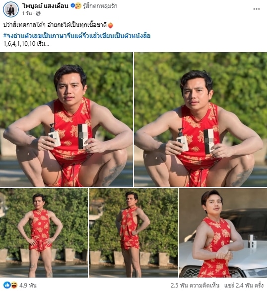 เมื่อวันที่ 27 ม.ค.ที่ผ่านมา ครูไพบูลย์ ได้โพสต์ภาพที่ตัวเองกำลังแต่งตัวด้วยชุดเซ็ตสีแดงลายมังกรทองเฉลิมฉลองวันตรุษจีน 2568 โดยสวมเป็นเสื้อกล้าม และกางเกงขาสั้นขนาดพอดีตัว เผยให้เห็นกล้ามแขนแน่น ๆ ที่เจ้าตัวพยายามอดทนออกกำลังมาอย่างหนัก แต่สิ่งที่ทำให้ภาพเซ็ตนี้ได้รับความสนใจมากเป็นพิเศษนั่นก็เพราะ กางเกงที่อาจจะพอดีจนเกินไป ทำให้มันรัดและเน้นไปตรงเป้า กลายเป็นจุดเด่นที่สุดของรูปไปเลย