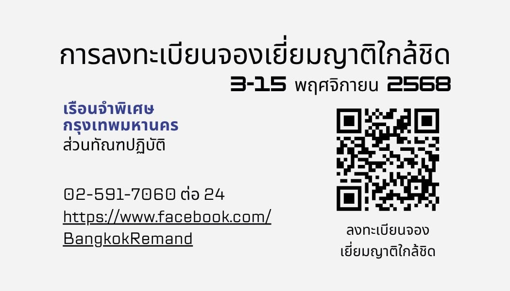 เพื่ออำนวยความสะดวกในการจองระบบ QR code ในการจองเยี่ยมญาติใกล้ชิดจะเปิดให้กรอกข้อมูลจองเยี่ยมได้ตั้งแต่วันที่ 3 – 15 พฤศจิกายน 2568 เป็นต้นไป ระหว่างเวลา 08.45 – 15.45น. จนกว่ารอบเยี่ยมจะเต็ม โดยมีรอบการเยี่ยมญาติใกล้ชิด วันละ 2 รอบ