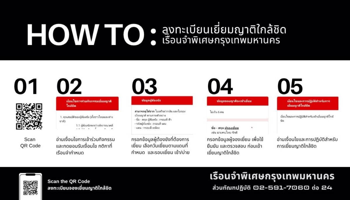 ต่อมา เรือนจำพิเศษกรุงเทพฯ เปิดเผยรายละเอียดประชาสัมพันธ์ – วิธีการลงทะเบียนเยี่ยมญาติใกล้ชิดด้วยเรือนจำพิเศษกรุงเทพมหานคร จะดำเนินการจัดกิจกรรมเยี่ยมญาติใกล้ชิด และจะเปิดให้จองเยี่ยมญาติใกล้ชิด ผ่านทางออนไลน์ด้วยระบบ