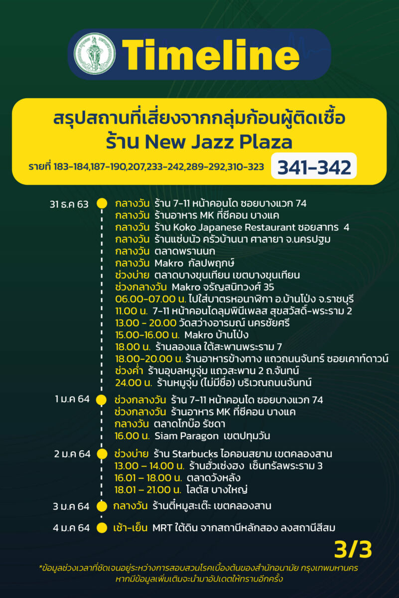 ร.ต.อ.พงศกร ขวัญเมือง โฆษกกรุงเทพมหานคร อัพเดตสถานการณ์การระบาดของโควิด-19 ใน กรุงเทพ โดยเปิดเผย ไทม์ไลน์ ผู้ป่วยโควิด-19 รายที่ 324-342 ระบาดระลอกใหม่ และพบว่าผู้ป่วยส่วนใหญ่เป็นพนักงานบริษัท
