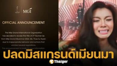 ประกาศด่วน! มิสแกรนด์อินเตอร์เนชั่นแนล (MGI) ปลด แธ ซู เญียน มิสแกรนด์เมียนมา หลุดจากตำแหน่งรองชนะเลิศอันดับ 2 มิสแกรนด์อินเตอร์ฯ 2024 อย่างเป็นทางการแล้ว ดูเหมือนว่าประเด็นร้อนบนเวทีประกวดสาวงามอย่าง
