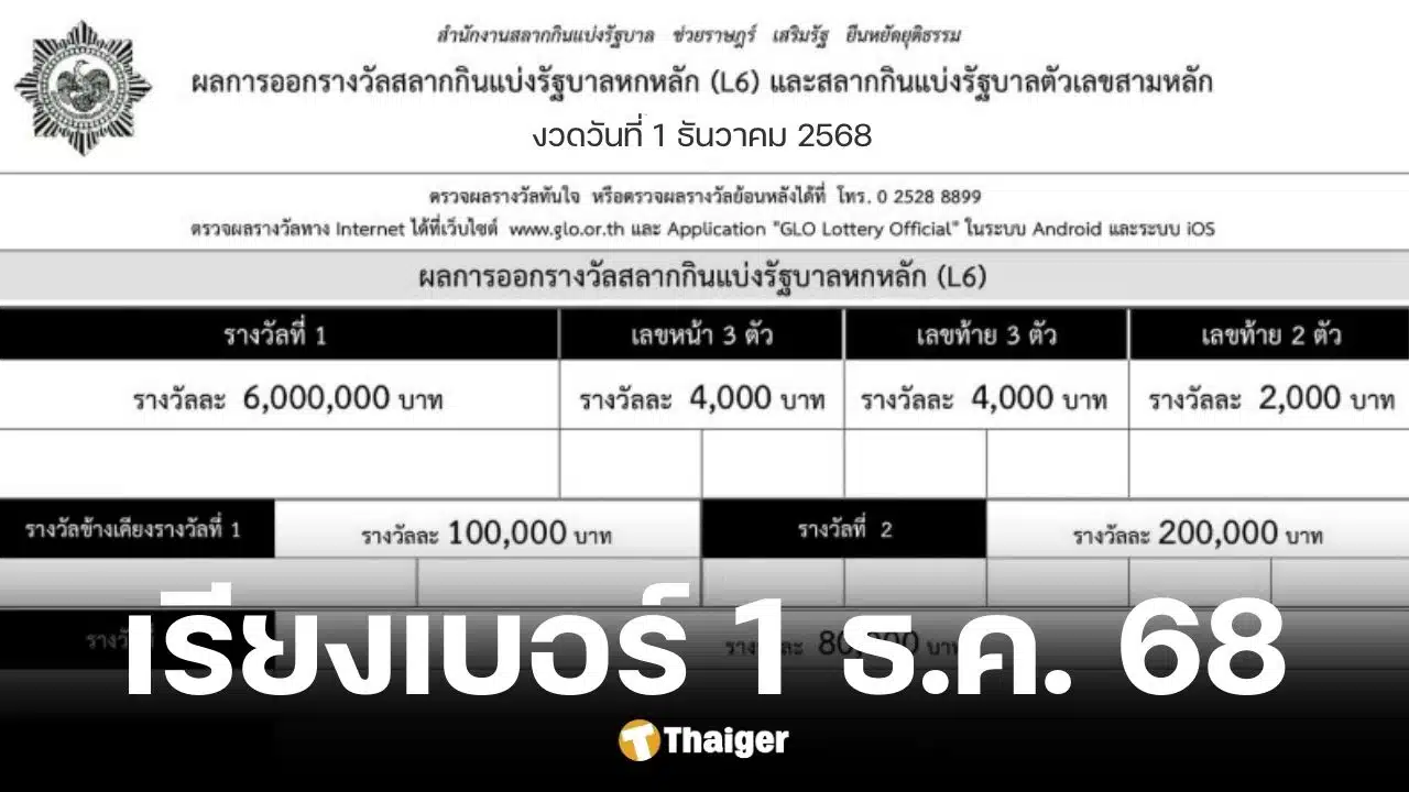 ผลสลากกินแบ่งรัฐบาล 01 ธันวาคม 2568