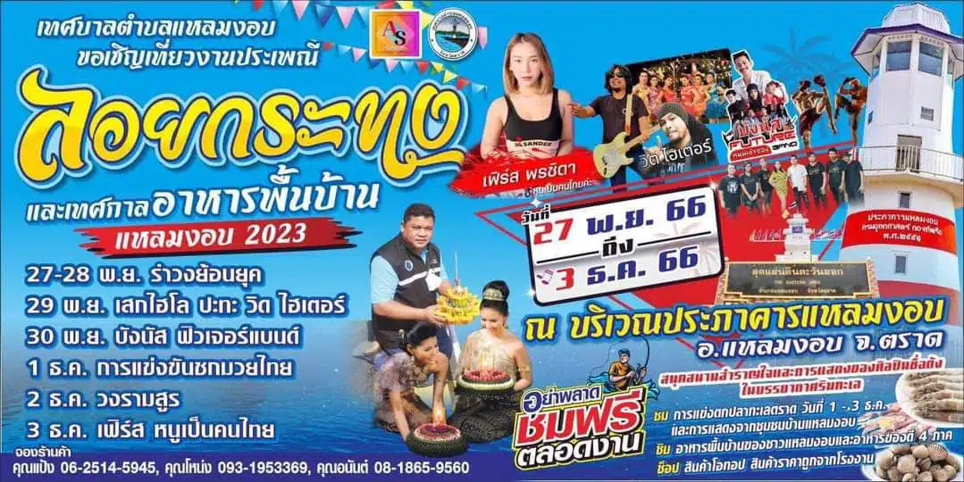 ประภาคารแหลมงอบ ตั้งอยู่ที่ตำบลแหลมงอบ อำเภอแหลมงอบ จังหวัดตราด นับได้ว่า ที่นี่เป็นแลนด์มาร์คของคนจังหวัดตราดเลยก็ว่าได้ เพราะเป็นที่ได้รับความนิยมทั้งคนไทย และนักท่องเที่ยว ที่ต่างพากันมาที่นี่เพื่อเช็กอินถ่ายรูป และมาเสพบรรยากาศที่สวยงาม อีกทั้งในชุมชนแหลมงอบ ยังเป็นชุมชนที่รวมหลากหลายถึง 3 วัฒนธรรม มีทั้ง ไทยพุทธ ไทยมุสลิม และไทยจีน ด้วยสถานที่ที่สวย และบรรยากาศดี ประภาคารแหลมงอบ จึงเป็นสถานที่จัดงานลอยกระทงในวันที่ 27 พฤศจิกายน ถึง 3 ธันวาคม 2566 หากใครสนใจ สามารถเดินทางไปที่งานตามวันเวลาข้างต้นได้เลย เพราะภายในงาน ยังมีอีกหลายกิจกรรมให้เราได้ทำ ดังนี้