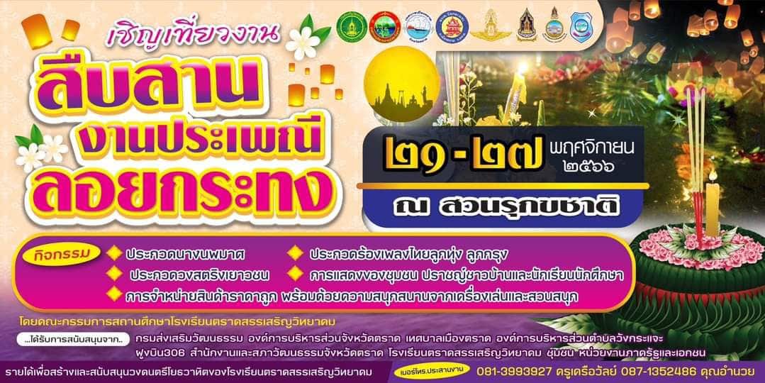 รวมสถานที่วันลอยกระทง จังหวัดตราด ตั้งแต่วันที่ 21-27 พฤศจิกายน 2566 บอกเลยว่า…แต่ละที่มีสิ่งที่น่าสนใจ รวมถึงกิจกรรมต่าง ๆ อีกมากมายภายในงาน จะมีที่ไหนให้เราไปลอยกระทงกันบ้าง ไปดูกัน