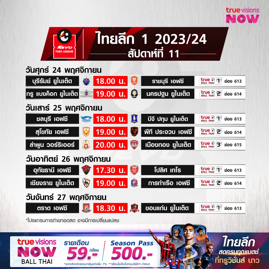 ตารางแข่งขัน รีโว่ 2023/24 ไทยลีก โปรแกรมฟุตบอลไทยลีก สัปดาห์ที่ 11 ทุกคู่ถ่ายทอดสดทาง AIS Play และ True Ball Thai