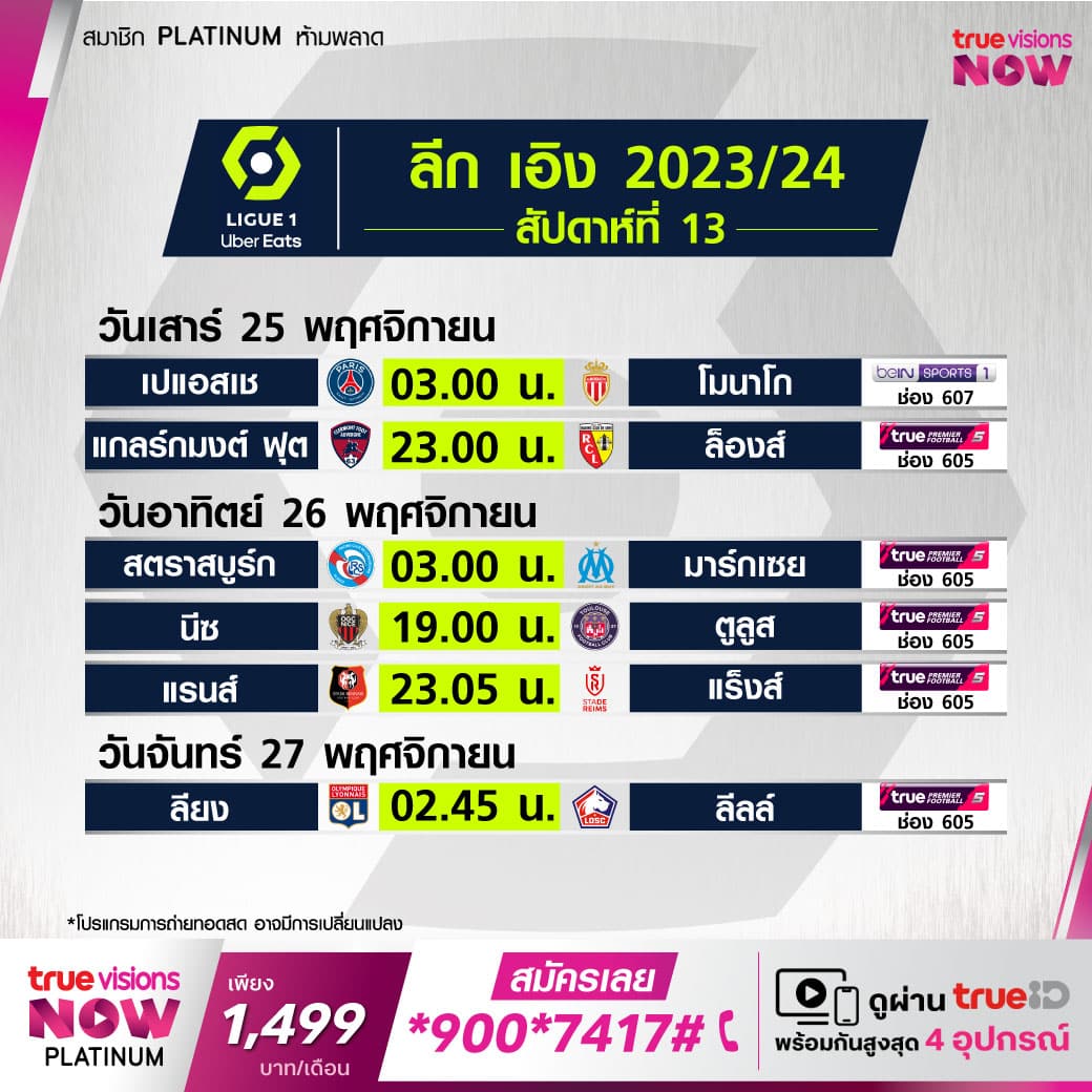 ตารางแข่งขัน ลีกเอิง ฝรั่งเศส โปรแกรมฟุตบอล ลีกเอิง 2023/24 สัปดาห์ที่ 13 ถ่ายทอดสดทาง beIN Sports และ True Sports