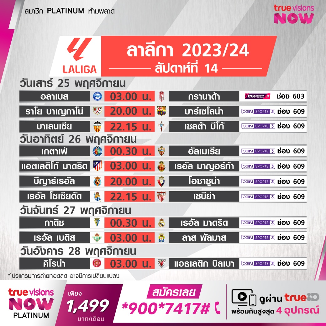 โปรแกรม ลาลีกา สเปน ประจำฤดูกาล 2023/24 สัปดาห์ที่ 14 ถ่ายทอดสดทางช่อง beIN Sport