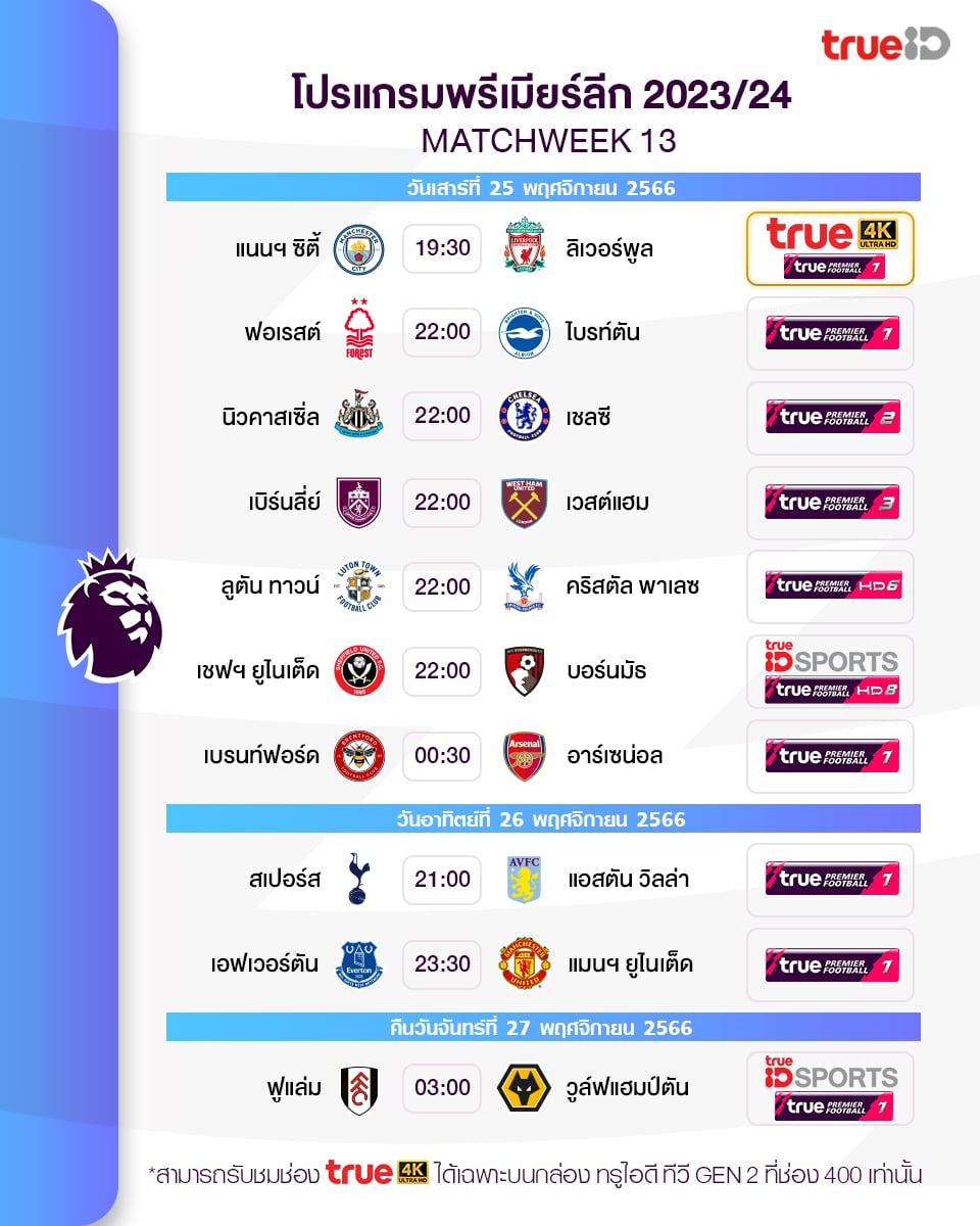 โปรแกรมพรีเมียร์ลีก 2023/24 สัปดาห์ที่ 13 แข่งวันที่ 25-27 พ.ย. นี้ เช็คตารางแข่งพร้อมช่องดูบอลสด
