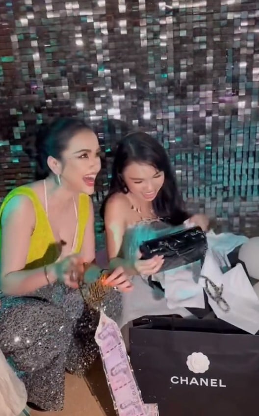 ซึ่งไฮไลท์อยู่ชิ้นที่สองนี่แหละ จากปกคลิปที่ขึ้นคำว่า “เจนนี่เปย์ของขวัญ 2xx,xxx ให้ลิลลี่” สรุปแล้วมันคือกระเป๋าแบรนด์เนมยี่ห้อหรูอย่าง Chanel นั่นเอง พอลิลลี่แกะเสร็จยิ้มกว้างกว่าเดิมทันที พร้อมหันไปจุ๊บแก้มพี่สาวเป็นการขอบคุณด้วย