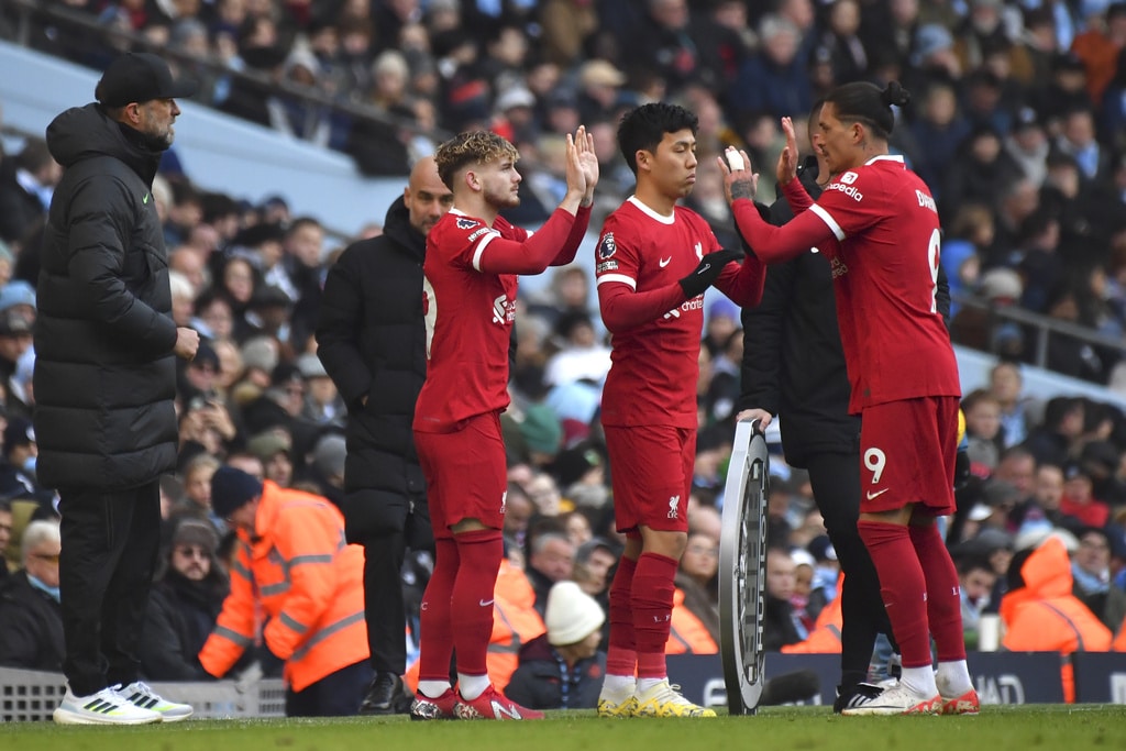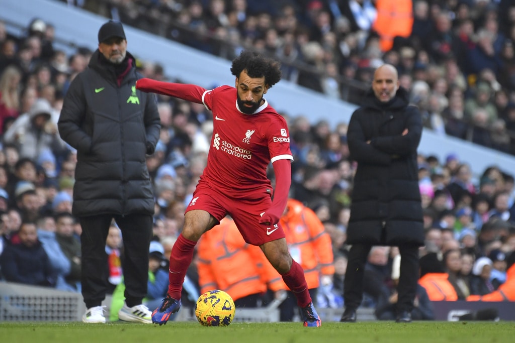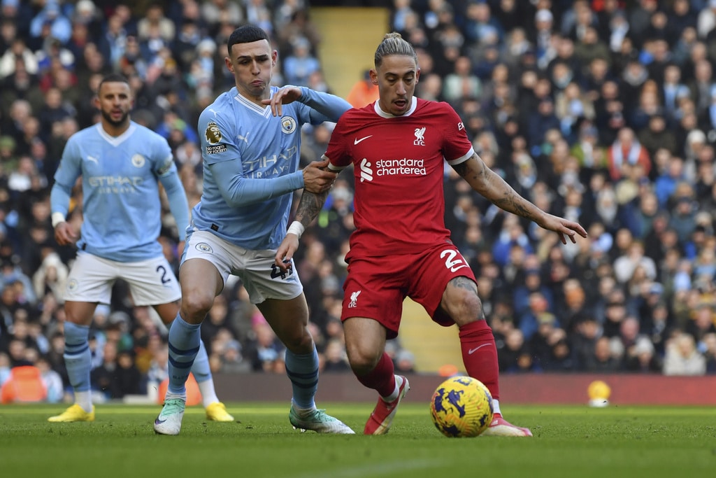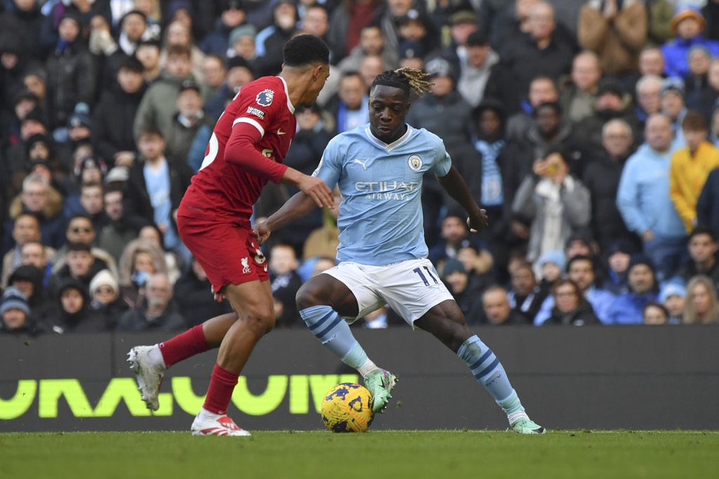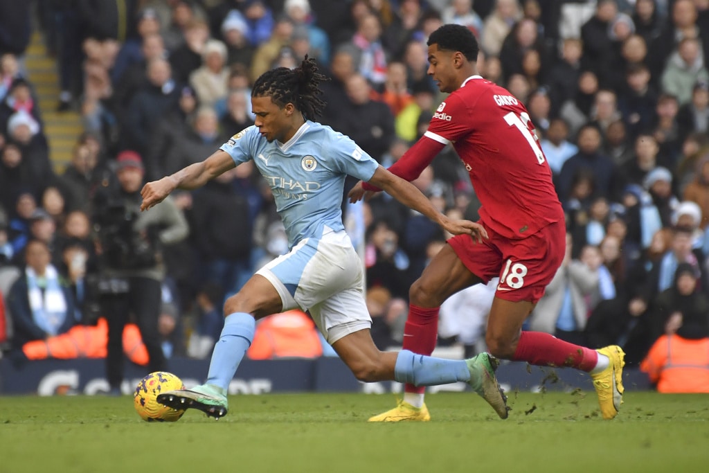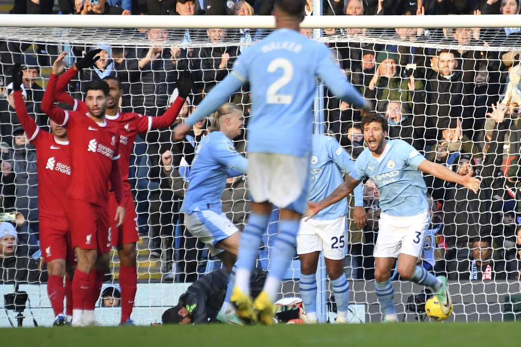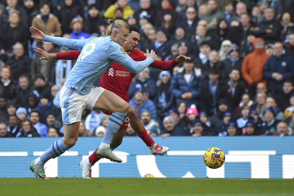 Manchester City’s Erling Haaland, left, challenges for the ball with Liverpool’s Trent Alexander-Arnold during the English Premier League soccer match between Manchester City and Liverpool at Etihad stadium in Manchester, England, Saturday, Nov. 25, 2023. (AP Photo/Rui Vieira)Manchester City’s head coach Pep Guardiola reacts during the English Premier League soccer match between Manchester City and Liverpool at Etihad stadium in Manchester, England, Saturday, Nov. 25, 2023. (AP Photo/Rui Vieira)Liverpool’s Darwin Nunez, right, is replaced by teammate Liverpool’s Harvey Elliott, centre, during the English Premier League soccer match between Manchester City and Liverpool at Etihad stadium in Manchester, England, Saturday, Nov. 25, 2023. (AP Photo/Rui Vieira)Manchester City’s Nathan Ake, left, challenges for the ball with Liverpool’s Cody Gakpo during the English Premier League soccer match between Manchester City and Liverpool at Etihad stadium in Manchester, England, Saturday, Nov. 25, 2023. (AP Photo/Rui Vieira)Liverpool’s Trent Alexander-Arnold celebrates after scoring his side’s opening goal during the English Premier League soccer match between Manchester City and Liverpool at Etihad stadium in Manchester, England, Saturday, Nov. 25, 2023. (AP Photo/Rui Vieira)Manchester City players celebrate Manchester City’s Ruben Dias, right, goal that was later disallowed by a VAR decision during the English Premier League soccer match between Manchester City and Liverpool at Etihad stadium in Manchester, England, Saturday, Nov. 25, 2023. (AP Photo/Rui Vieira)Liverpool’s Mohamed Salah, left, challenges for the ball with Manchester City’s Nathan Ake during the English Premier League soccer match between Manchester City and Liverpool at Etihad stadium in Manchester, England, Saturday, Nov. 25, 2023. (AP Photo/Rui Vieira)Liverpool’s Mohamed Salah in action during the English Premier League soccer match between Manchester City and Liverpool at Etihad stadium in Manchester, England, Saturday, Nov. 25, 2023. (AP Photo/Rui Vieira)Manchester City’s Julian Alvarez in action during the English Premier League soccer match between Manchester City and Liverpool at Etihad stadium in Manchester, England, Saturday, Nov. 25, 2023. (AP Photo/Rui Vieira)Liverpool’s Trent Alexander-Arnold, left, challenges for the ball with Manchester City’s Jeremy Doku during the English Premier League soccer match between Manchester City and Liverpool at Etihad stadium in Manchester, England, Saturday, Nov. 25, 2023. (AP Photo/Rui Vieira)Manchester City’s Erling Haaland celebrates scoring the opening goal, during the English Premier League soccer match between Manchester City and Liverpool, at the Etihad Stadium, in Manchester, England, Saturday, Nov. 25, 2023. (Martin Rickett/PA via AP)Manchester City’s Erling Haaland scores his side’s opening goal during the English Premier League soccer match between Manchester City and Liverpool at Etihad stadium in Manchester, England, Saturday, Nov. 25, 2023. (AP Photo/Rui Vieira)Manchester City’s Erling Haaland, centre, celebrates with teammates after scoring his side’s opening goal during the English Premier League soccer match between Manchester City and Liverpool at Etihad stadium in Manchester, England, Saturday, Nov. 25, 2023. (AP Photo/Rui Vieira)Liverpool’s Kostas Tsimikas, right, challenges for the ball with Manchester City’s Phil Foden during the English Premier League soccer match between Manchester City and Liverpool at Etihad stadium in Manchester, England, Saturday, Nov. 25, 2023. (AP Photo/Rui Vieira)