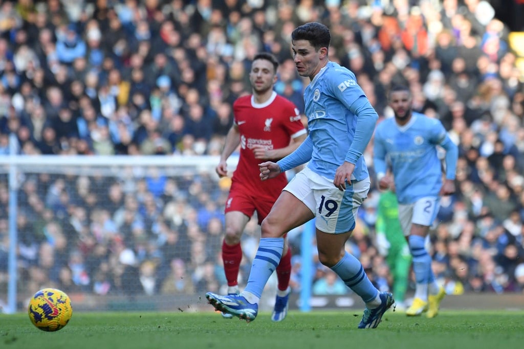 Manchester City’s Julian Alvarez in action during the English Premier League soccer match between Manchester City and Liverpool at Etihad stadium in Manchester, England, Saturday, Nov. 25, 2023. (AP Photo/Rui Vieira)