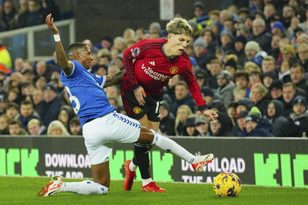 Manchester United’s Alejandro Garnacho scores his side’s first goal during the English Premier League soccer match between Everton and Manchester United, at Goodison Park Stadium, in Liverpool, England, Sunday , Nov. 26, 2023. (AP Photo/Jon Super)