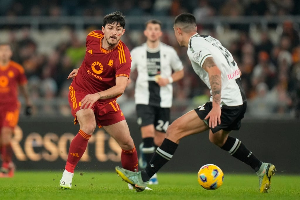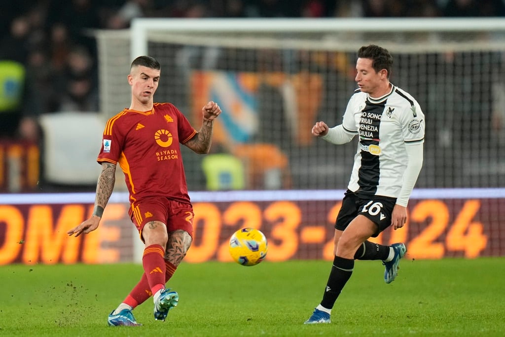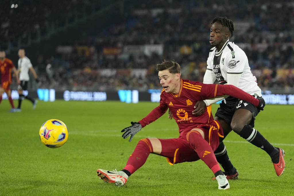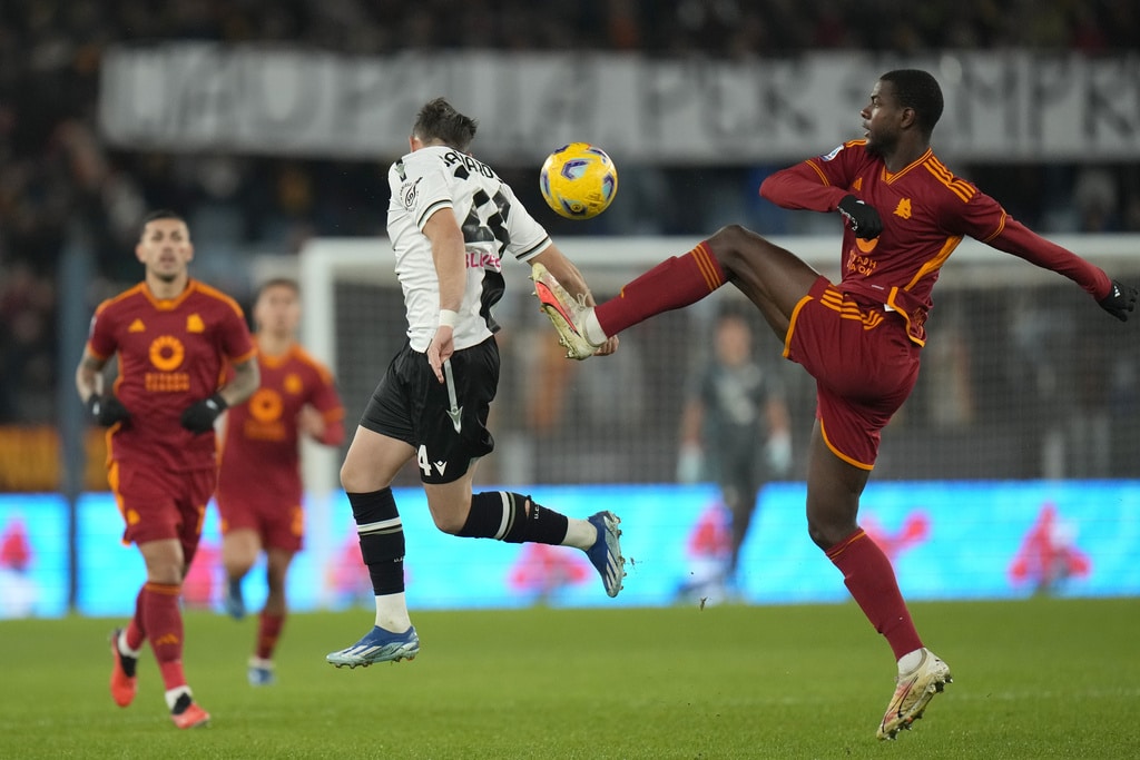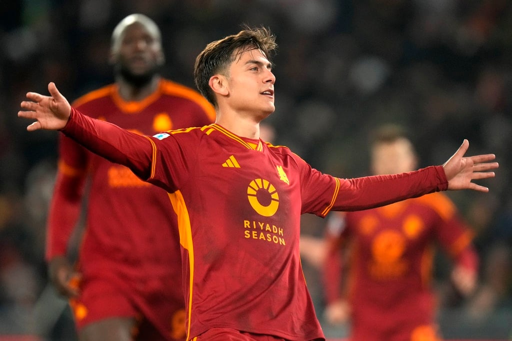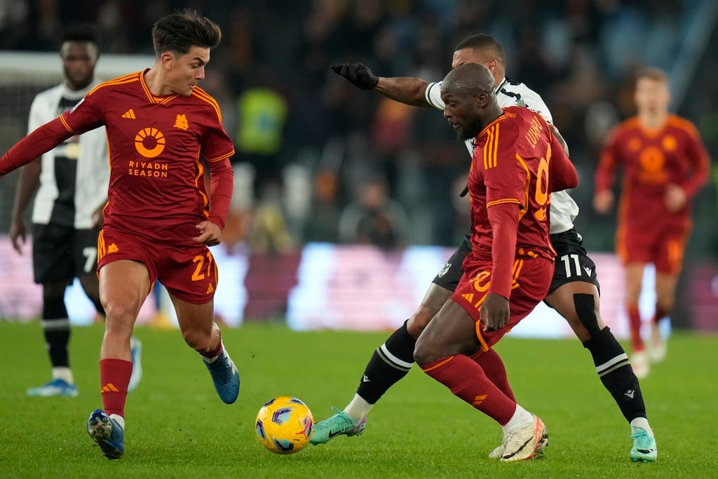 Roma’s Paulo Dybala, left, celebrates with Roma’s Romelu Lukaku after scoring his sides second goal during the Italian Serie A soccer match between Roma and Udinese at Rome’s Olympic Stadium, Italy, Sunday, Nov. 26, 2023. (Alfredo Falcone/LaPresse via AP)Roma’s head coach Jose Mourinho gestures during the Italian Serie A soccer match between Roma and Udinese at Rome’s Olympic Stadium, Italy, Sunday, Nov. 26, 2023. (AP Photo/Alessandra Tarantino)Udinese’s Martin Payero, right, challenges Roma’s Nicola Zalewski during the Italian Serie A soccer match between Roma and Udinese at Rome’s Olympic Stadium, Italy, Sunday, Nov. 26, 2023. (AP Photo/Alessandra Tarantino)Udinese’s Hassane Kamara, right, watches as Roma’s Romelu Lukaku heads the ball during the Italian Serie A soccer match between Roma and Udinese at Rome’s Olympic Stadium, Italy, Sunday, Nov. 26, 2023. (AP Photo/Alessandra Tarantino)Roma’s Paulo Dybala celebrates after scoring his sides second goal during the Italian Serie A soccer match between Roma and Udinese at Rome’s Olympic Stadium, Italy, Sunday, Nov. 26, 2023. (AP Photo/Alessandra Tarantino)Udinese’s Nehuen Perez, right, challenges Roma’s Sardar Azmoun during the Italian Serie A soccer match between Roma and Udinese at Rome’s Olympic Stadium, Italy, Sunday, Nov. 26, 2023. (AP Photo/Alessandra Tarantino)Udinese’s Florian Thauvin, right, challenges Roma’s Gianluca Mancini during the Italian Serie A soccer match between Roma and Udinese at Rome’s Olympic Stadium, Italy, Sunday, Nov. 26, 2023. (AP Photo/Alessandra Tarantino)Roma’s Romelu Lukaku controls the ball during the Italian Serie A soccer match between Roma and Udinese at Rome’s Olympic Stadium, Italy, Sunday, Nov. 26, 2023. (AP Photo/Alessandra Tarantino)Roma’s Paulo Dybala, left, watches as Udinese’s Walace, right, challenges Roma’s Romelu Lukaku during the Italian Serie A soccer match between Roma and Udinese at Rome’s Olympic Stadium, Italy, Sunday, Nov. 26, 2023. (AP Photo/Alessandra Tarantino)Roma’s Evan Ndicka, right, challenges Udinese’s Lazar Samardzic during the Italian Serie A soccer match between Roma and Udinese at Rome’s Olympic Stadium, Italy, Sunday, Nov. 26, 2023. (AP Photo/Alessandra Tarantino)Roma’s players line up for the Italian Serie A soccer match between Roma and Udinese at Rome’s Olympic Stadium, Italy, Sunday, Nov. 26, 2023. (AP Photo/Alessandra Tarantino)