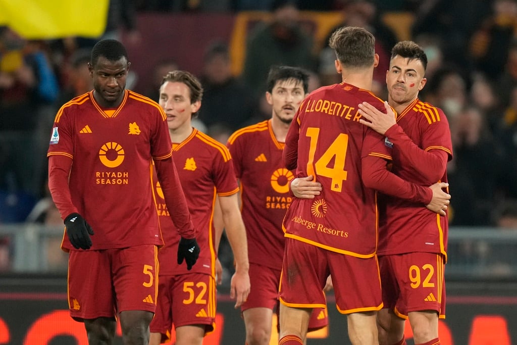 Roma’s Stephan El Shaarawy, right, celebrates with teammates after scoring his sides third goal during the Italian Serie A soccer match between Roma and Udinese at Rome’s Olympic Stadium, Italy, Sunday, Nov. 26, 2023. (AP Photo/Alessandra Tarantino)