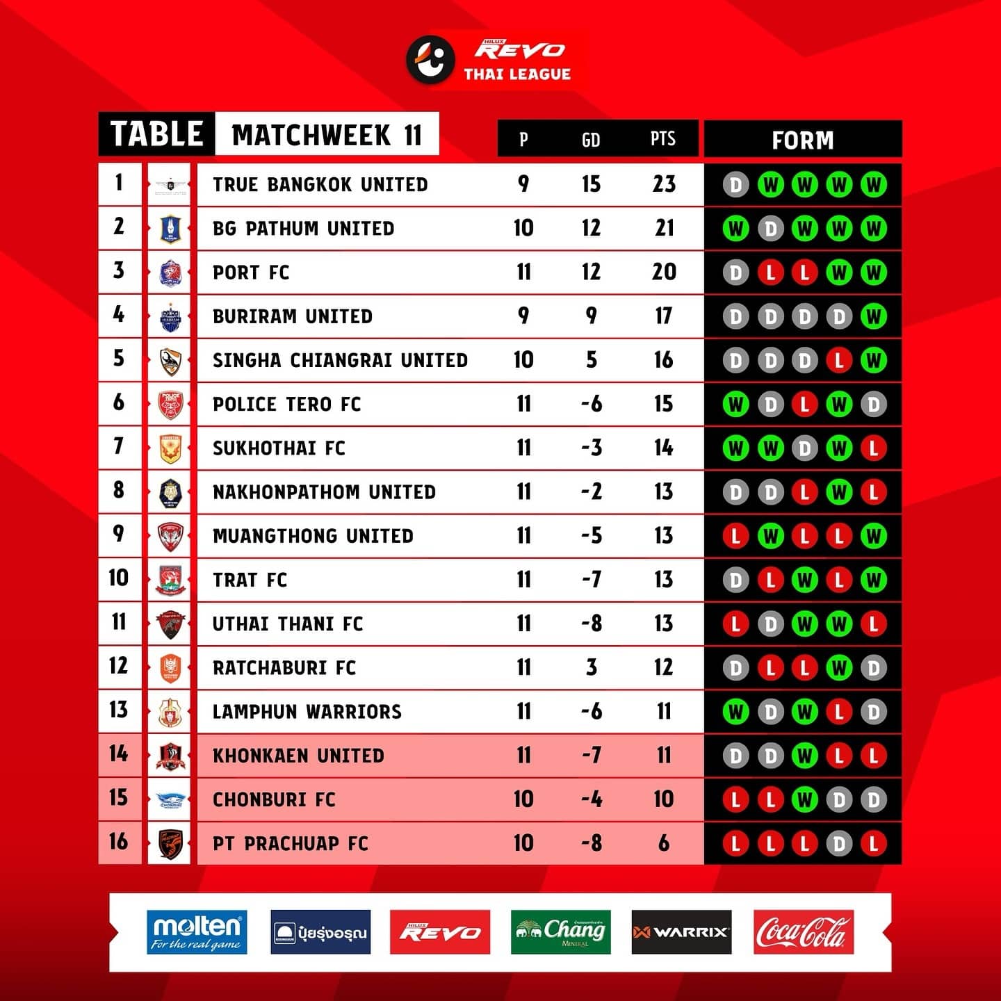 สรุปผลการแข่งขัน รีโว่ ไทยลีก 2023/24 หลังจบนัดที่ 11