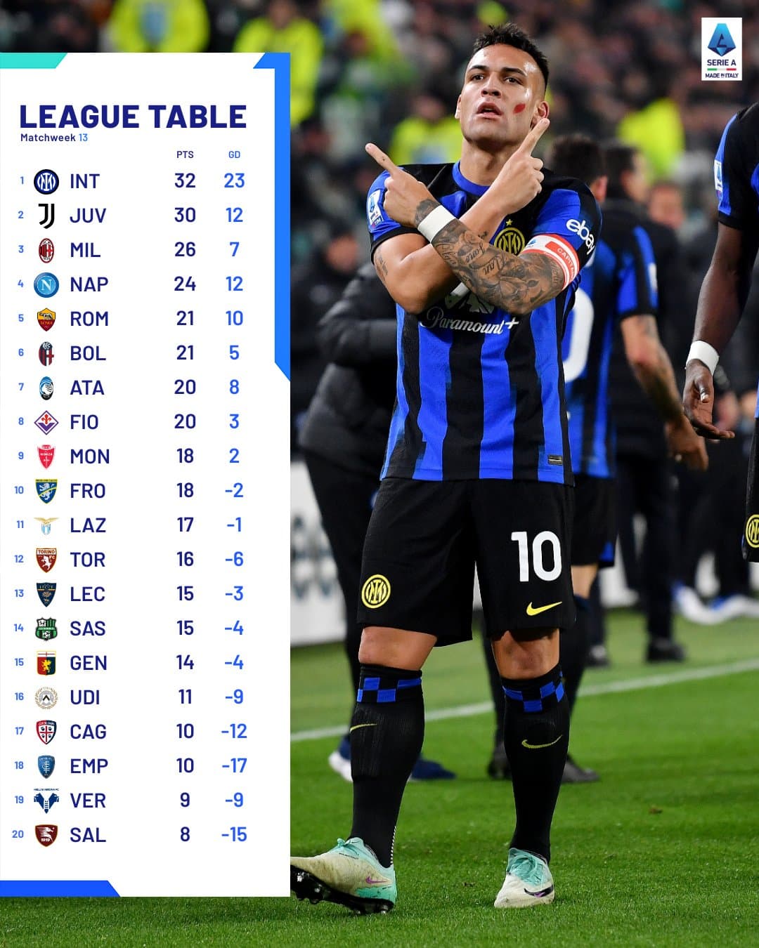 1. อินเตอร์ มิลาน แข่ง 13 นัด มี 32 แต้ม