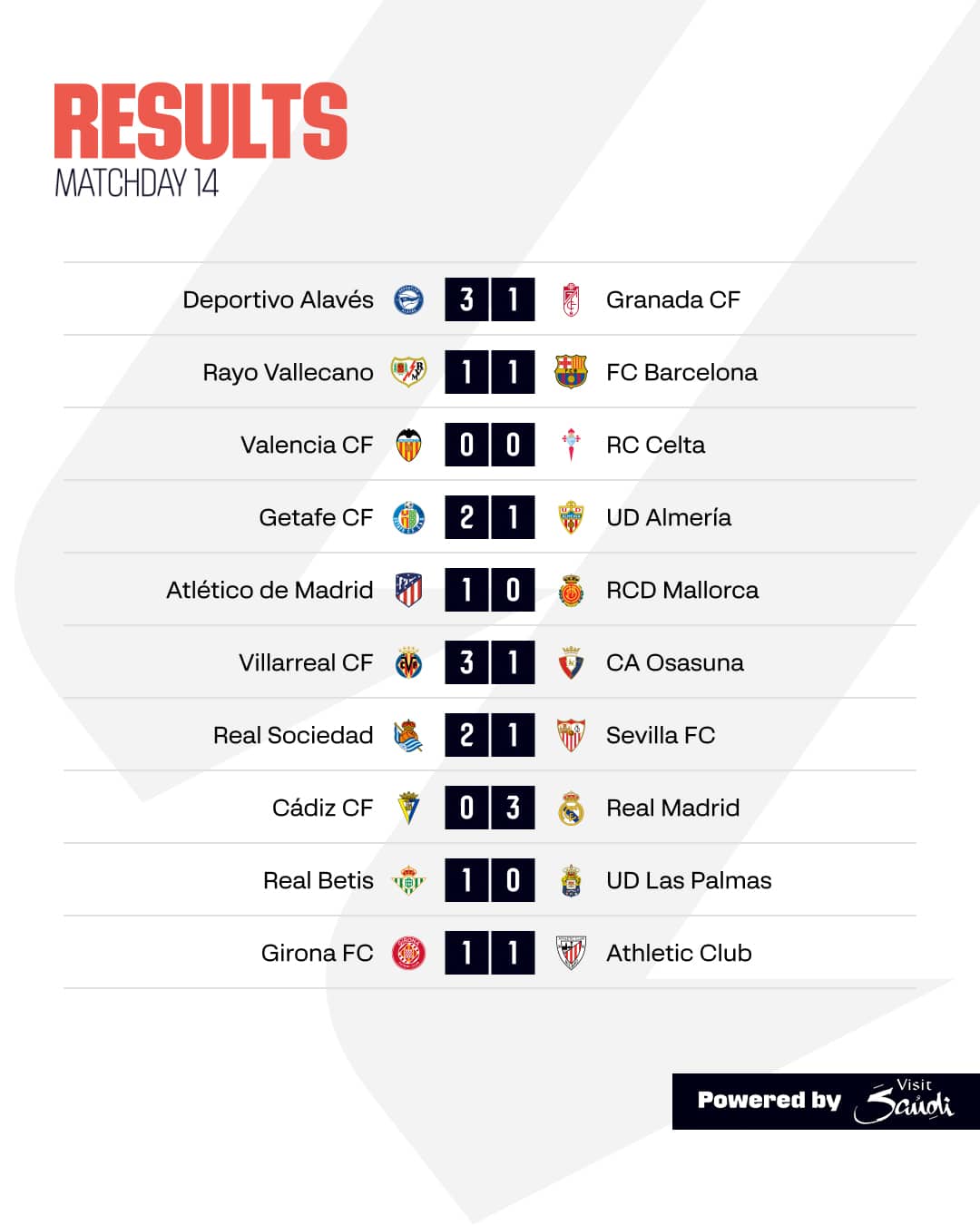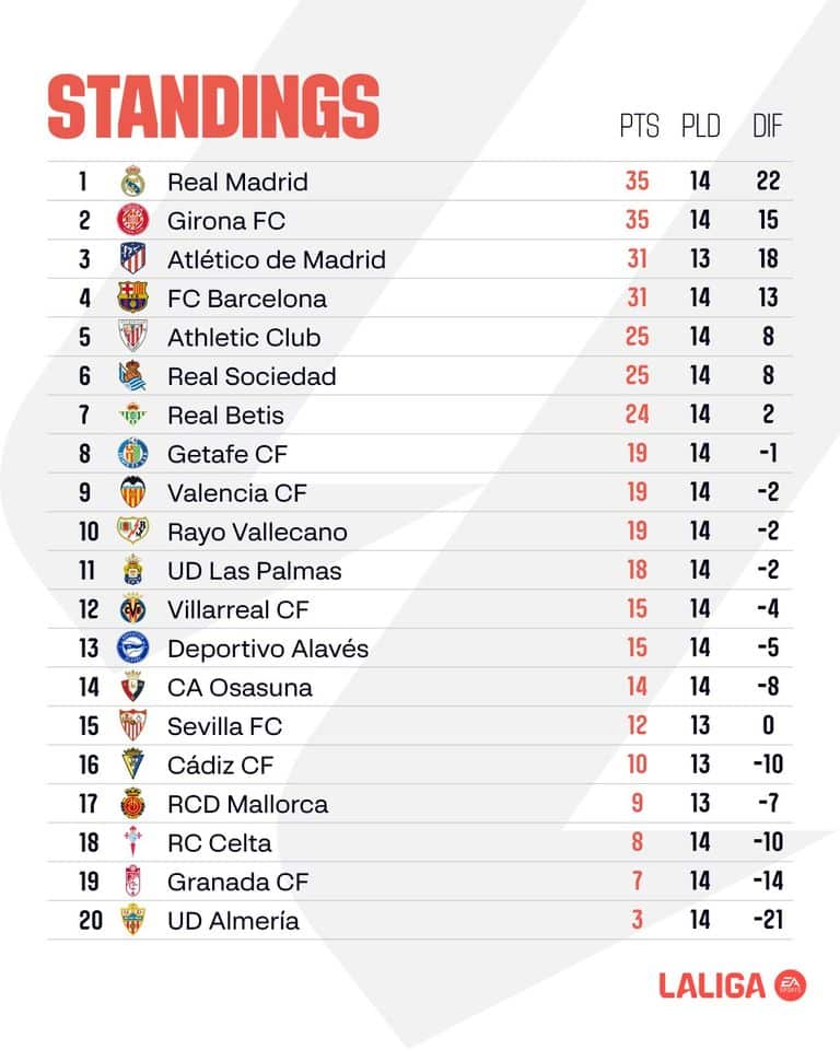 สรุปผล การแข่งขัน ลาลีกา สเปน 2023/24 หลังจบนัดที่ 14
