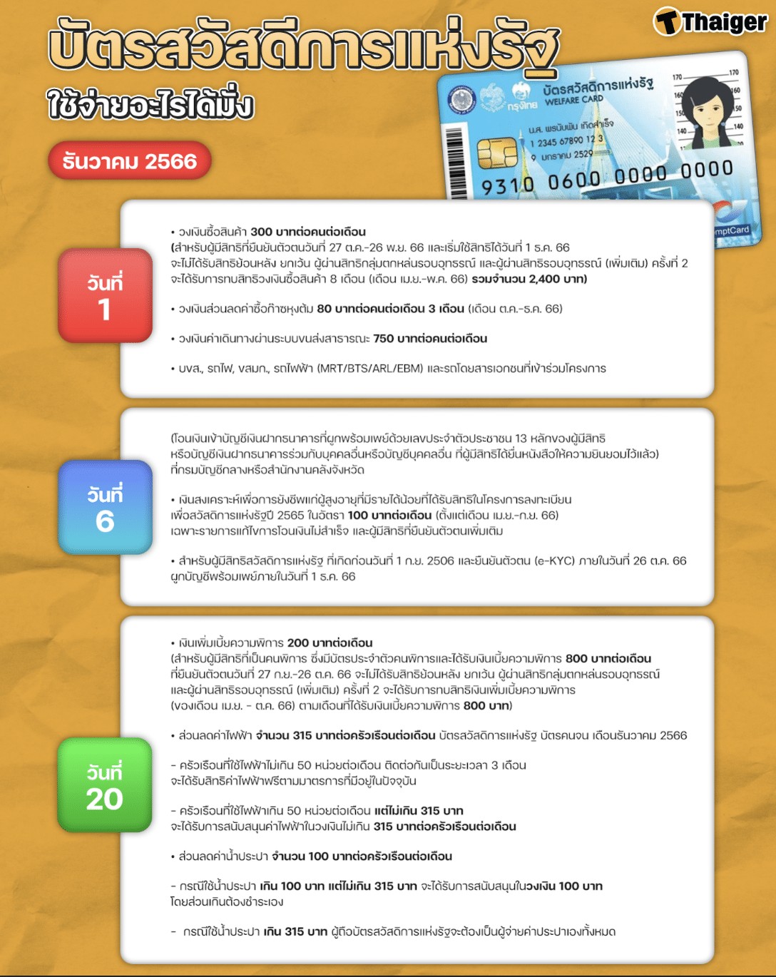 บัตรสวัสดิการแห่งรัฐ หรือ บัตรคนจน ในเดือนธันวาคม 2566 นี้ นอกจากจะได้รับวงเงินค่าใช้จ่าย 300 บาทประจำเดือนแล้ว ยังมีค่าใช้จ่ายอื่น ๆ เพิ่มเติมภายในบัตรด้วย ทั้งนี้สำหรับผู้ที่ผ่านอุทธรณ์ รอบเก็บตก ในการยืนยันตนช่วง 27 ตุลาคม – 26 พฤศจิกายน 2566 จะได้รับวงเงินเข้าในวันที่ 1 ธันวาคม และได้รับวงเงินย้อนหลังอีก 8 เดือน (เมษายน – พฤศจิกายน 2566) รวมเป็นเงิน 2,400 บาท โดยวงเงินที่ผู้ถือบัตรสวัสดิการรัฐจะได้รับ มีดังนี้