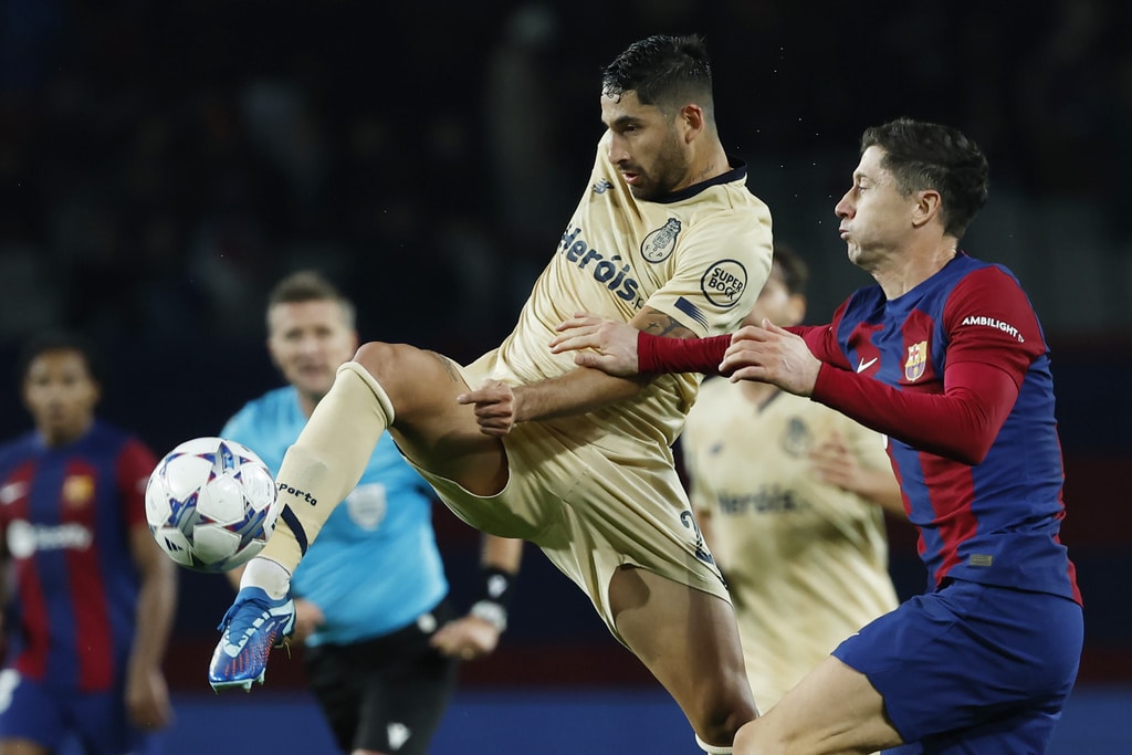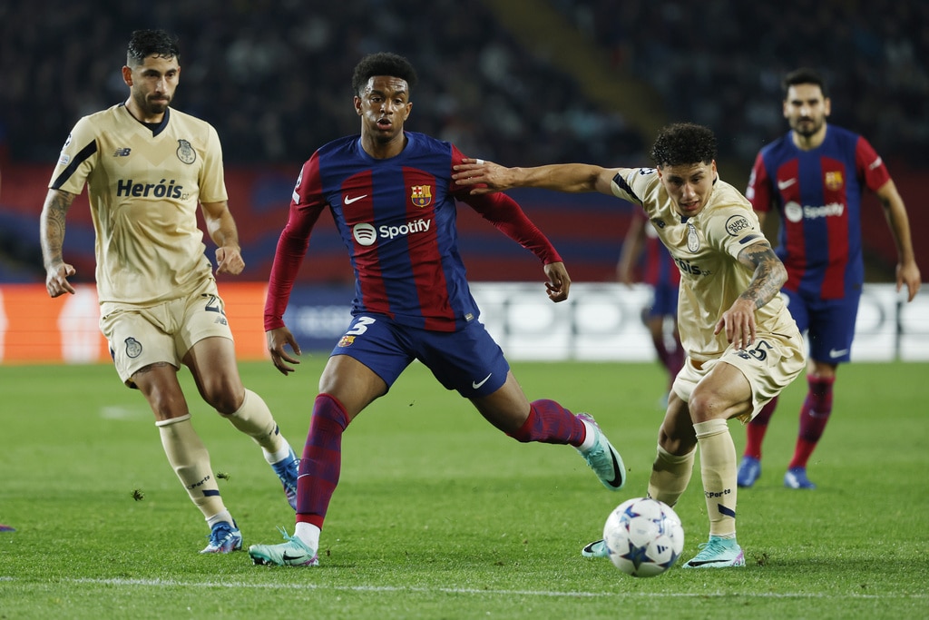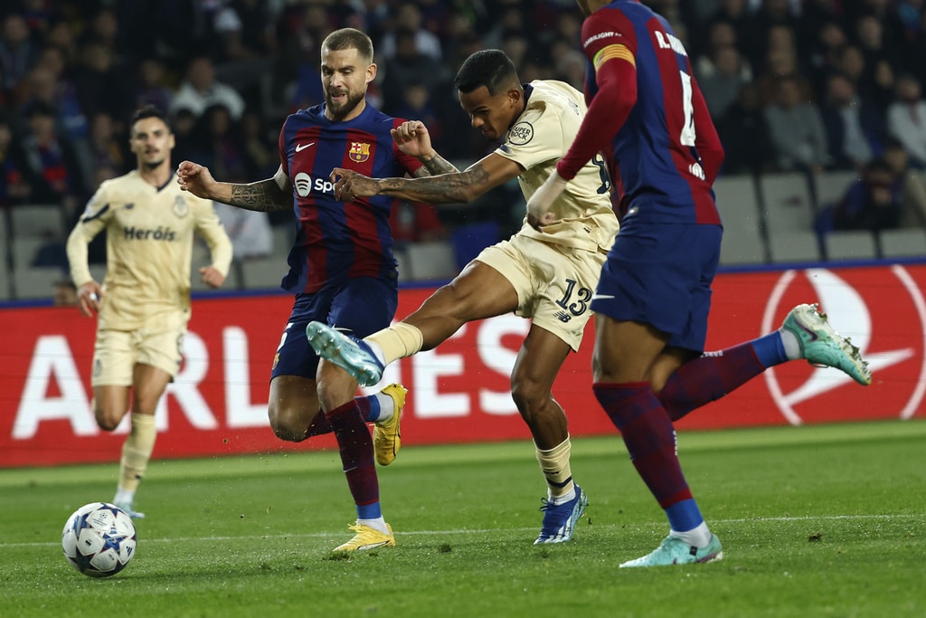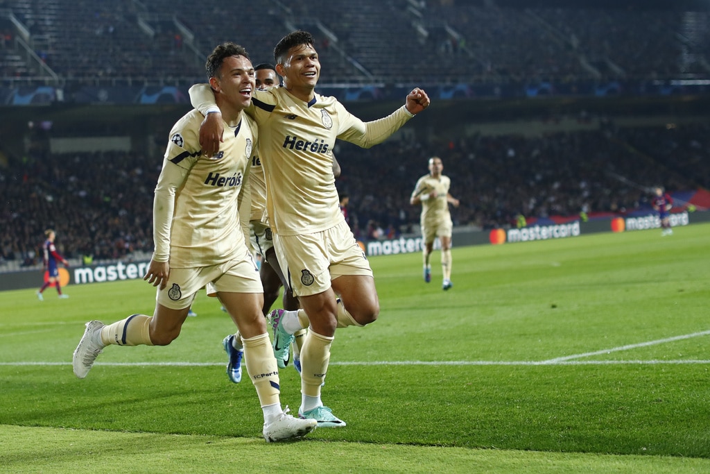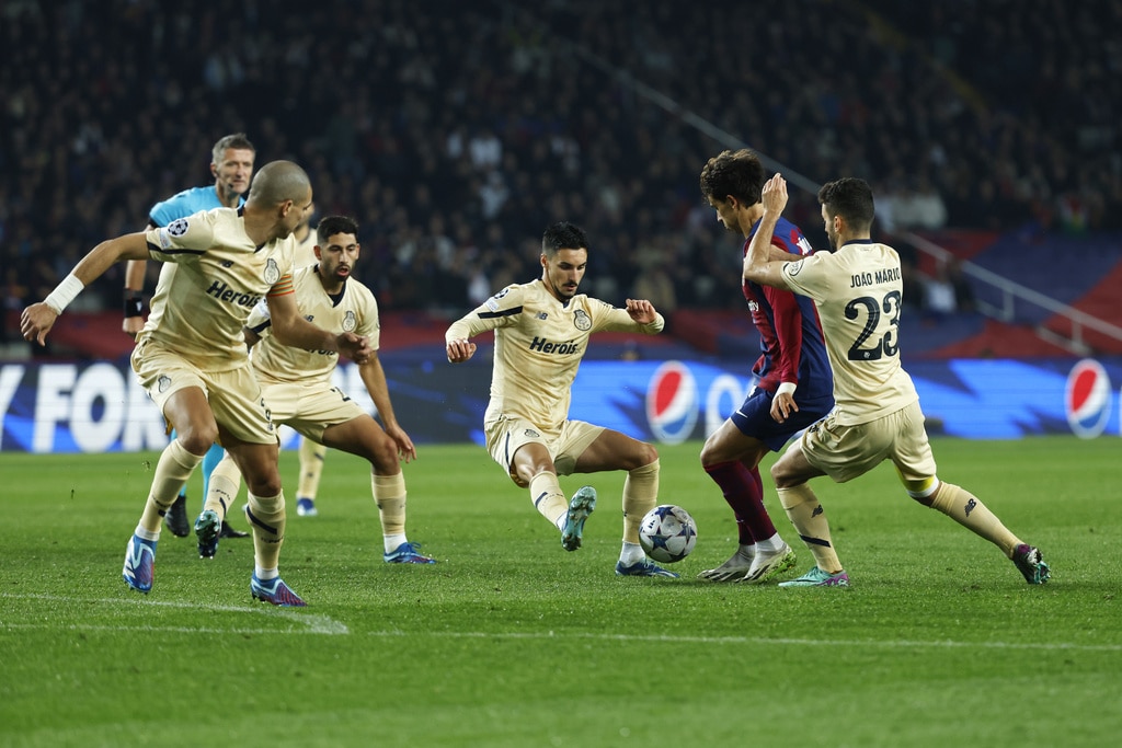 Barcelona’s Frenkie de Jong, left, and Porto’s Alan Varela challenge for the ball during the Champions League Group H soccer match between Barcelona and Porto at the Olympic Stadium in Barcelona, Spain, Tuesday, Nov. 28, 2023. (AP Photo/Joan Monfort)Barcelona’s Alejandro Balde, centre left, and Porto’s Jorge Sanchez challenge for the ball the Champions League Group H soccer match between Barcelona and Porto at the Olympic Stadium in Barcelona, Spain, Tuesday, Nov. 28, 2023. (AP Photo/Joan Monfort)Porto’s Alan Varela, centre, and Barcelona’s Robert Lewandowski challenge for the ball the Champions League Group H soccer match between Barcelona and Porto at the Olympic Stadium in Barcelona, Spain, Tuesday, Nov. 28, 2023. (AP Photo/Joan Monfort)Porto’s Alan Varela, centre, and Barcelona’s Robert Lewandowski challenge for the ball the Champions League Group H soccer match between Barcelona and Porto at the Olympic Stadium in Barcelona, Spain, Tuesday, Nov. 28, 2023. (AP Photo/Joan Monfort)Barcelona’s Joao Felix celebrates after scoring his side’s second goal during the Champions League Group H soccer match between Barcelona and Porto at the Olympic Stadium in Barcelona, Spain, Tuesday, Nov. 28, 2023. (AP Photo/Joan Monfort)Barcelona’s Joao Felix, centre, celebrates with teammates after scoring his side’s second goal during the Champions League Group H soccer match between Barcelona and Porto at the Olympic Stadium in Barcelona, Spain, Tuesday, Nov. 28, 2023. (AP Photo/Joan Monfort)Barcelona’s Joao Felix, second from right, challenges for the ball with Porto’s Stephen Eustaquio, centre, and Joao Mario, right, during the Champions League Group H soccer match between Barcelona and Porto at the Olympic Stadium in Barcelona, Spain, Tuesday, Nov. 28, 2023. (AP Photo/Joan Monfort)Barcelona’s Frenkie de Jong, left, and Porto’s Alan Varela challenge for the ball during the Champions League Group H soccer match between Barcelona and Porto at the Olympic Stadium in Barcelona, Spain, Tuesday, Nov. 28, 2023. (AP Photo/Joan Monfort)Barcelona’s goalkeeper Inaki Pena, centre left, clears the ball as Porto’s Fabio Cardoso challenges during the Champions League Group H soccer match between Barcelona and Porto at the Olympic Stadium in Barcelona, Spain, Tuesday, Nov. 28, 2023. (AP Photo/Joan Monfort)Porto’s Galeno, centre, shoots on target as Barcelona’s Ronald Araujo, right, and Inigo Martinez challenge for the ball during the Champions League Group H soccer match between Barcelona and Porto at the Olympic Stadium in Barcelona, Spain, Tuesday, Nov. 28, 2023. (AP Photo/Joan Monfort)Barcelona’s head coach Xavi Hernandez reacts during the Champions League Group H soccer match between Barcelona and Porto at the Olympic Stadium in Barcelona, Spain, Tuesday, Nov. 28, 2023. (AP Photo/Joan Monfort)Porto’s head coach Sergio Conceicao reacts during the Champions League Group H soccer match between Barcelona and Porto at the Olympic Stadium in Barcelona, Spain, Tuesday, Nov. 28, 2023. (AP Photo/Joan Monfort)Porto’s Pepe, left, celebrates after scoring the opening goal with Evanilson during the Champions League Group H soccer match between Barcelona and Porto at the Olympic Stadium in Barcelona, Spain, Tuesday, Nov. 28, 2023. (AP Photo/Joan Monfort)Barcelona’s Raphinha, right, and Porto’s Andre Franco challenge for the ball during the Champions League Group H soccer match between Barcelona and Porto at the Olympic Stadium in Barcelona, Spain, Tuesday, Nov. 28, 2023. (AP Photo/Joan Monfort)
