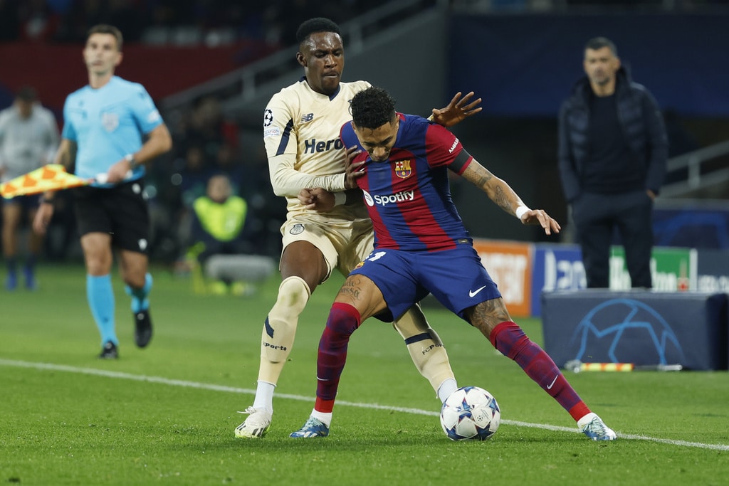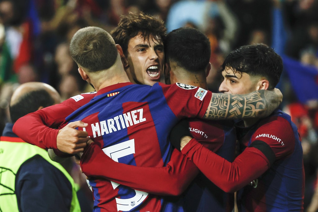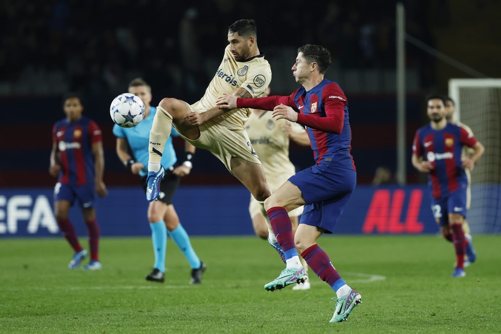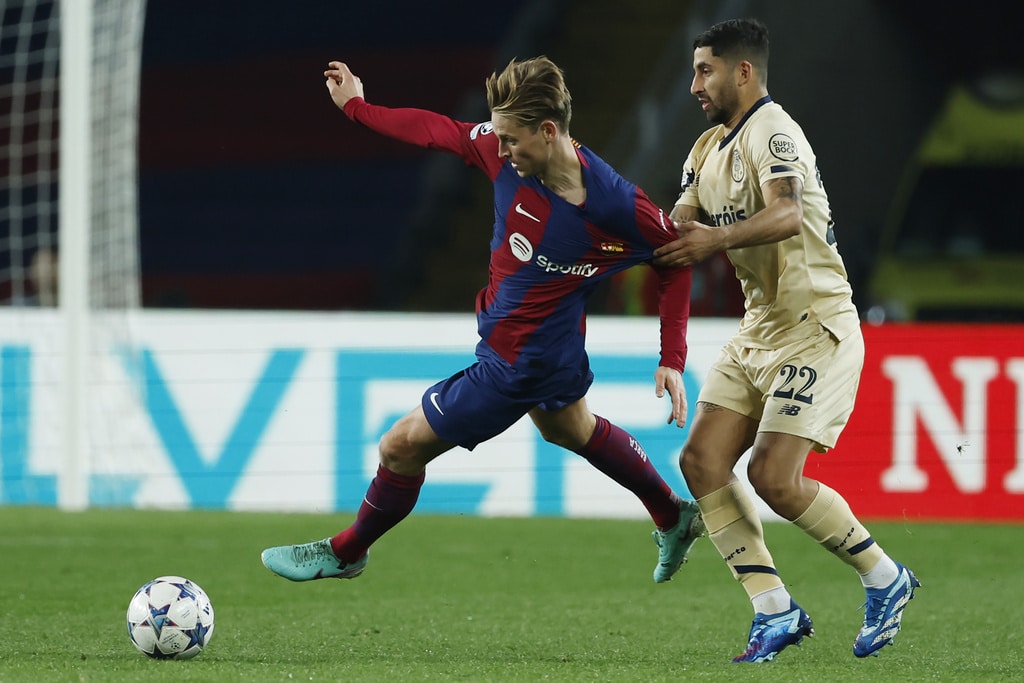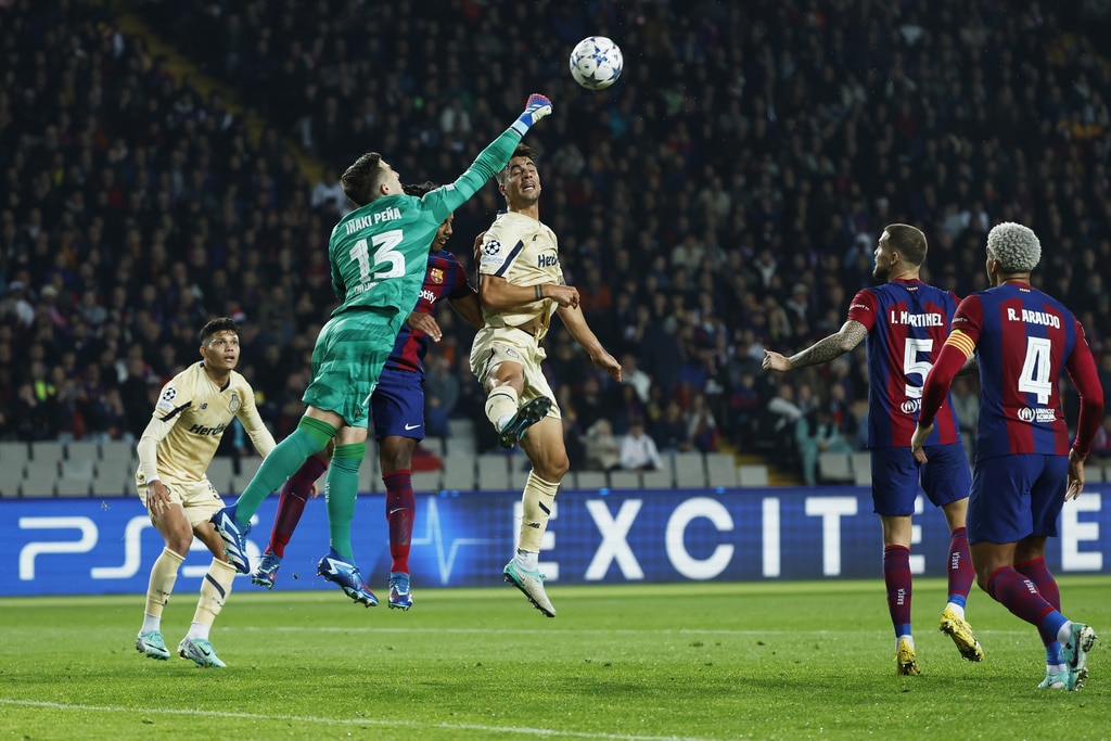 Barcelona’s Frenkie de Jong, left, and Porto’s Alan Varela challenge for the ball during the Champions League Group H soccer match between Barcelona and Porto at the Olympic Stadium in Barcelona, Spain, Tuesday, Nov. 28, 2023. (AP Photo/Joan Monfort)Barcelona’s Alejandro Balde, centre left, and Porto’s Jorge Sanchez challenge for the ball the Champions League Group H soccer match between Barcelona and Porto at the Olympic Stadium in Barcelona, Spain, Tuesday, Nov. 28, 2023. (AP Photo/Joan Monfort)Porto’s Alan Varela, centre, and Barcelona’s Robert Lewandowski challenge for the ball the Champions League Group H soccer match between Barcelona and Porto at the Olympic Stadium in Barcelona, Spain, Tuesday, Nov. 28, 2023. (AP Photo/Joan Monfort)Porto’s Alan Varela, centre, and Barcelona’s Robert Lewandowski challenge for the ball the Champions League Group H soccer match between Barcelona and Porto at the Olympic Stadium in Barcelona, Spain, Tuesday, Nov. 28, 2023. (AP Photo/Joan Monfort)Barcelona’s Joao Felix celebrates after scoring his side’s second goal during the Champions League Group H soccer match between Barcelona and Porto at the Olympic Stadium in Barcelona, Spain, Tuesday, Nov. 28, 2023. (AP Photo/Joan Monfort)Barcelona’s Joao Felix, centre, celebrates with teammates after scoring his side’s second goal during the Champions League Group H soccer match between Barcelona and Porto at the Olympic Stadium in Barcelona, Spain, Tuesday, Nov. 28, 2023. (AP Photo/Joan Monfort)Barcelona’s Joao Felix, second from right, challenges for the ball with Porto’s Stephen Eustaquio, centre, and Joao Mario, right, during the Champions League Group H soccer match between Barcelona and Porto at the Olympic Stadium in Barcelona, Spain, Tuesday, Nov. 28, 2023. (AP Photo/Joan Monfort)Barcelona’s Frenkie de Jong, left, and Porto’s Alan Varela challenge for the ball during the Champions League Group H soccer match between Barcelona and Porto at the Olympic Stadium in Barcelona, Spain, Tuesday, Nov. 28, 2023. (AP Photo/Joan Monfort)Barcelona’s goalkeeper Inaki Pena, centre left, clears the ball as Porto’s Fabio Cardoso challenges during the Champions League Group H soccer match between Barcelona and Porto at the Olympic Stadium in Barcelona, Spain, Tuesday, Nov. 28, 2023. (AP Photo/Joan Monfort)Porto’s Galeno, centre, shoots on target as Barcelona’s Ronald Araujo, right, and Inigo Martinez challenge for the ball during the Champions League Group H soccer match between Barcelona and Porto at the Olympic Stadium in Barcelona, Spain, Tuesday, Nov. 28, 2023. (AP Photo/Joan Monfort)Barcelona’s head coach Xavi Hernandez reacts during the Champions League Group H soccer match between Barcelona and Porto at the Olympic Stadium in Barcelona, Spain, Tuesday, Nov. 28, 2023. (AP Photo/Joan Monfort)Porto’s head coach Sergio Conceicao reacts during the Champions League Group H soccer match between Barcelona and Porto at the Olympic Stadium in Barcelona, Spain, Tuesday, Nov. 28, 2023. (AP Photo/Joan Monfort)Porto’s Pepe, left, celebrates after scoring the opening goal with Evanilson during the Champions League Group H soccer match between Barcelona and Porto at the Olympic Stadium in Barcelona, Spain, Tuesday, Nov. 28, 2023. (AP Photo/Joan Monfort)Barcelona’s Raphinha, right, and Porto’s Andre Franco challenge for the ball during the Champions League Group H soccer match between Barcelona and Porto at the Olympic Stadium in Barcelona, Spain, Tuesday, Nov. 28, 2023. (AP Photo/Joan Monfort)