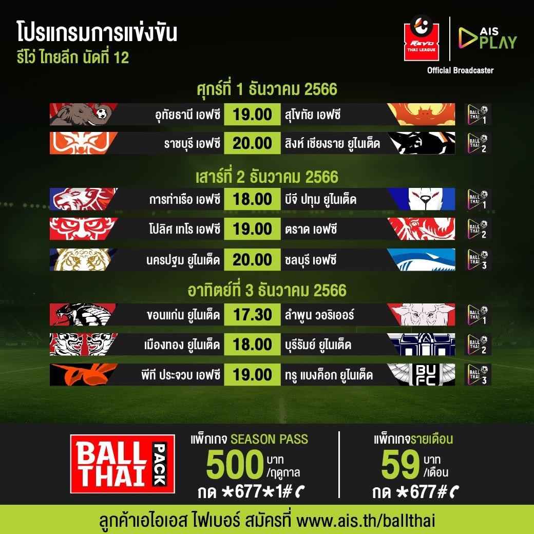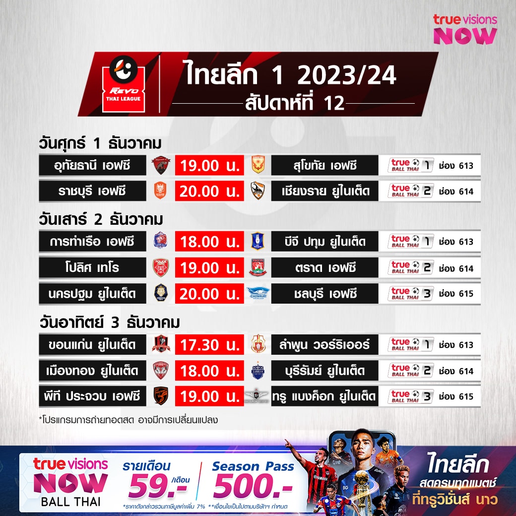 ตารางแข่งขัน รีโว่ 2023/24 ไทยลีก โปรแกรมฟุตบอลไทยลีก สัปดาห์ที่ 12 ทุกคู่ถ่ายทอดสดทาง AIS Play และ True Ball Thai
