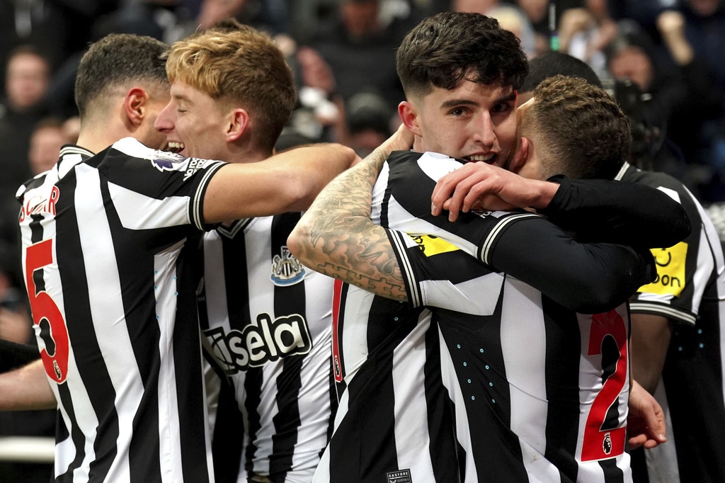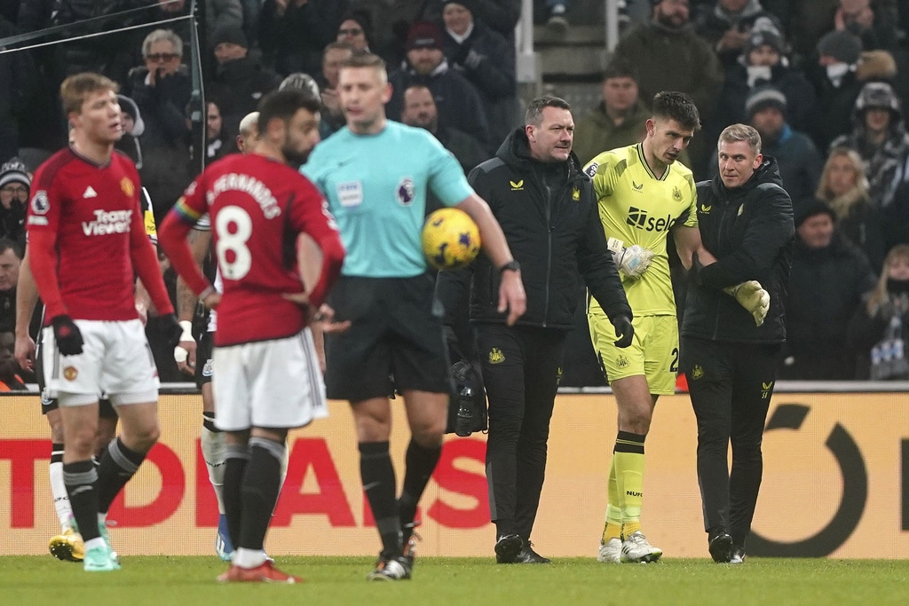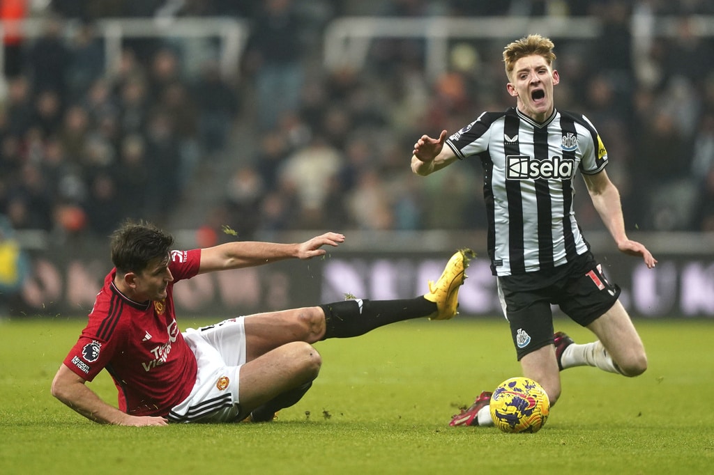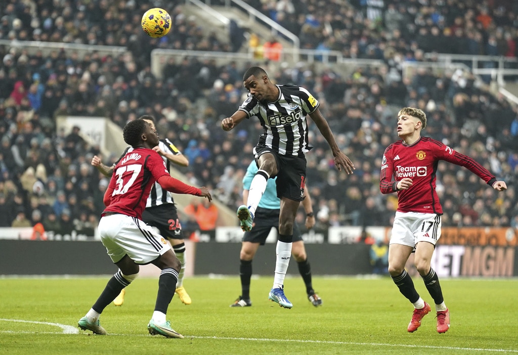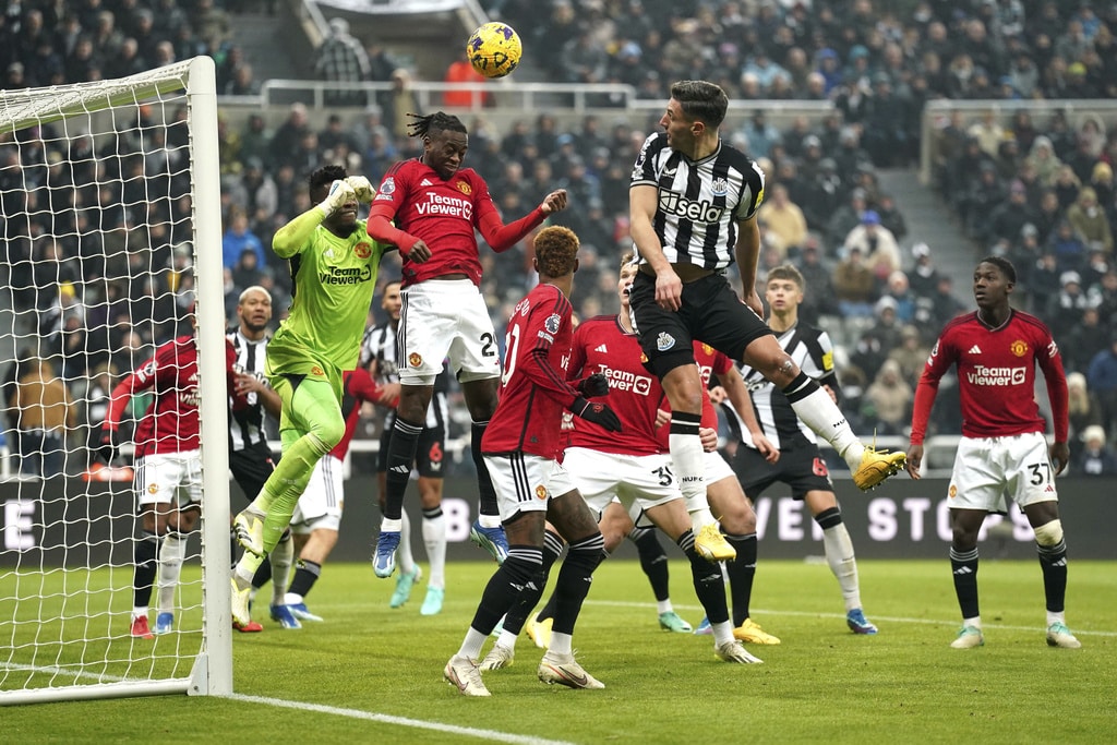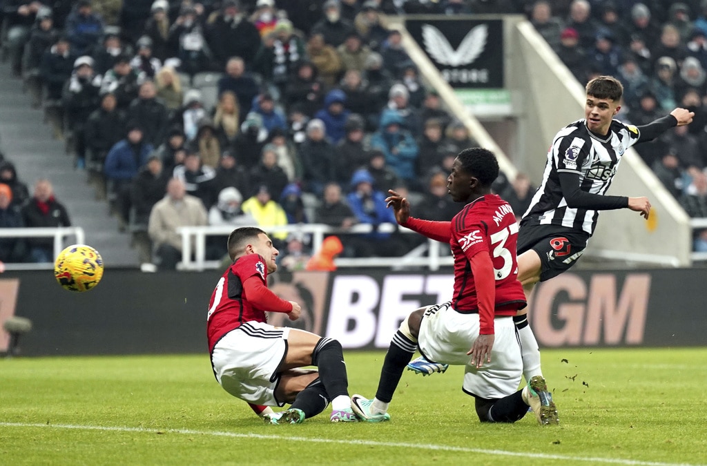 Newcastle United’s Kieran Trippier and Manchester United’s Alejandro Garnacho vie for the ball, during the English Premier League soccer match between Newcastle United and Manchester United at St. James’ Park, Newcastle, England, Saturday, Dec. 2, 2023. (Owen Humphreys/PA via AP)Newcastle United’s Anthony Gordon, center, is congratulated by manager Eddie Howe and staff following the team’s victory after the final whistle of the English Premier League soccer match between Newcastle United and Manchester United at St. James’ Park, Newcastle, England, Saturday, Dec. 2, 2023. (Owen Humphreys/PA via AP)Newcastle United’s Anthony Gordon, right, celebrates with teammate Matt Ritchie following the team’s victory after the final whistle of the English Premier League soccer match between Newcastle United and Manchester United at St. James’ Park, Newcastle, England, Saturday, Dec. 2, 2023. (Owen Humphreys/PA via AP)Newcastle United’s Lewis Miley, right, attempts a shot on goal during the English Premier League soccer match between Newcastle United and Manchester United at St. James’ Park, Newcastle, England, Saturday, Dec. 2, 2023. (Owen Humphreys/PA via AP)Newcastle United goalkeeper Nick Pope, second from right, is helped off the field by medical staff after picking up an injury during the English Premier League soccer match between Newcastle United and Manchester United at St. James’ Park, Newcastle, England, Saturday, Dec. 2, 2023. (Owen Humphreys/PA via AP)Referee Robert Jones, right, shows a yellow card to Manchester United’s Harry Maguire, center, for a foul on Newcastle United’s Anthony Gordon, not pictured, during the English Premier League soccer match between Newcastle United and Manchester United at St. James’ Park, Newcastle, England, Saturday, Dec. 2, 2023. (Owen Humphreys/PA via AP)Manchester United’s Harry Maguire, left, commits a foul on Newcastle United’s Anthony Gordon, right, which results in a yellow card, during the English Premier League soccer match between Newcastle United and Manchester United at St. James’ Park, Newcastle, England, Saturday, Dec. 2, 2023. (Owen Humphreys/PA via AP)Newcastle United’s Tino Livramento, right, and Manchester United’s Marcus Rashford battle for the ball during the English Premier League soccer match between Newcastle United and Manchester United at St. James’ Park, Newcastle, England, Saturday, Dec. 2, 2023. (Owen Humphreys/PA via AP)Newcastle United’s Anthony Gordon, second from left, celebrates scoring a goal with teammates during the English Premier League soccer match between Newcastle United and Manchester United at St. James’ Park, Newcastle, England, Saturday, Dec. 2, 2023. (Owen Humphreys/PA via AP)Newcastle United’s Anthony Gordon, right, scores a goal during the English Premier League soccer match between Newcastle United and Manchester United at St. James’ Park, Newcastle, England, Saturday, Dec. 2, 2023. (Owen Humphreys/PA via AP)Newcastle United’s Anthony Gordon celebrates scoring a goal during the English Premier League soccer match between Newcastle United and Manchester United at St. James’ Park, Newcastle, England, Saturday, Dec. 2, 2023. (Owen Humphreys/PA via AP)Manchester United goalkeeper Andre Onana, left, attempts to clear the ball from danger during the English Premier League soccer match between Newcastle United and Manchester United at St. James’ Park, Newcastle, England, Saturday, Dec. 2, 2023. (Owen Humphreys/PA via AP)Newcastle United’s Alexander Isak, center, heads the ball toward the goal during the English Premier League soccer match between Newcastle United and Manchester United at St. James’ Park, Newcastle, England, Saturday, Dec. 2, 2023. (Owen Humphreys/PA via AP)Newcastle United’s Kieran Trippier, right, and Manchester United’s Anthony Martial during the English Premier League soccer match between Newcastle United and Manchester United at St. James’ Park, Newcastle, England, Saturday, Dec. 2, 2023. (Owen Humphreys/PA via AP)Newcastle United’s Kieran Trippier, center and Manchester United’s Alejandro Garnacho vie for the ball, during the English Premier League soccer match between Newcastle United and Manchester United at St. James’ Park, Newcastle, England, Saturday, Dec. 2, 2023. (Owen Humphreys/PA via AP)