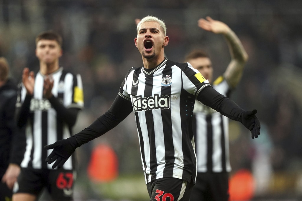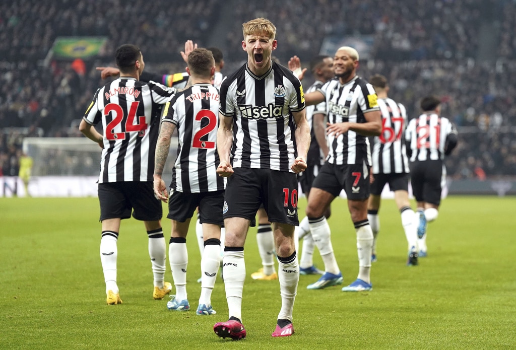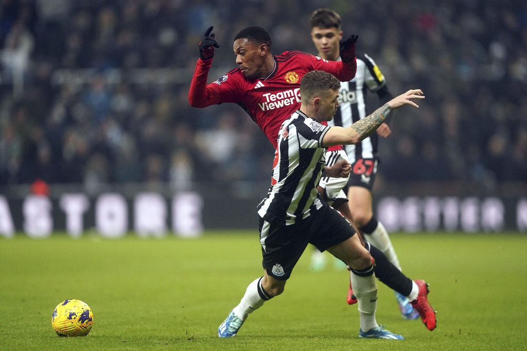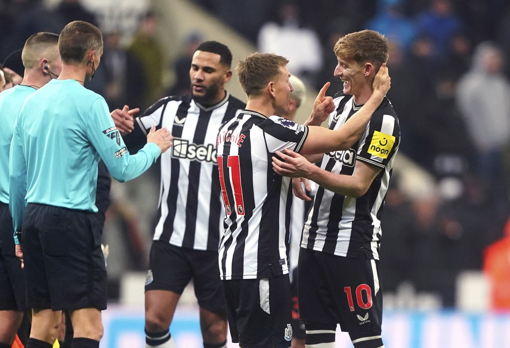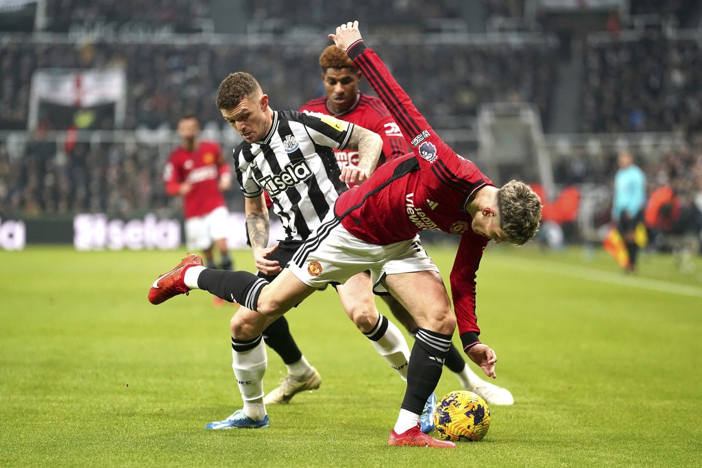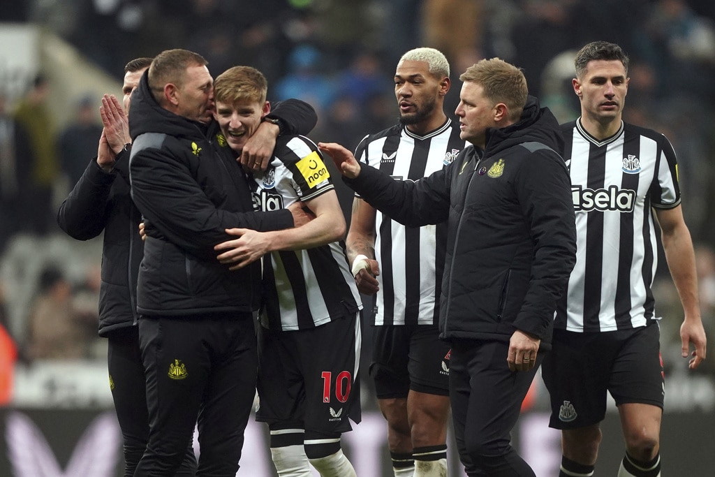 Newcastle United’s Kieran Trippier and Manchester United’s Alejandro Garnacho vie for the ball, during the English Premier League soccer match between Newcastle United and Manchester United at St. James’ Park, Newcastle, England, Saturday, Dec. 2, 2023. (Owen Humphreys/PA via AP)Newcastle United’s Anthony Gordon, center, is congratulated by manager Eddie Howe and staff following the team’s victory after the final whistle of the English Premier League soccer match between Newcastle United and Manchester United at St. James’ Park, Newcastle, England, Saturday, Dec. 2, 2023. (Owen Humphreys/PA via AP)Newcastle United’s Anthony Gordon, right, celebrates with teammate Matt Ritchie following the team’s victory after the final whistle of the English Premier League soccer match between Newcastle United and Manchester United at St. James’ Park, Newcastle, England, Saturday, Dec. 2, 2023. (Owen Humphreys/PA via AP)Newcastle United’s Lewis Miley, right, attempts a shot on goal during the English Premier League soccer match between Newcastle United and Manchester United at St. James’ Park, Newcastle, England, Saturday, Dec. 2, 2023. (Owen Humphreys/PA via AP)Newcastle United goalkeeper Nick Pope, second from right, is helped off the field by medical staff after picking up an injury during the English Premier League soccer match between Newcastle United and Manchester United at St. James’ Park, Newcastle, England, Saturday, Dec. 2, 2023. (Owen Humphreys/PA via AP)Referee Robert Jones, right, shows a yellow card to Manchester United’s Harry Maguire, center, for a foul on Newcastle United’s Anthony Gordon, not pictured, during the English Premier League soccer match between Newcastle United and Manchester United at St. James’ Park, Newcastle, England, Saturday, Dec. 2, 2023. (Owen Humphreys/PA via AP)Manchester United’s Harry Maguire, left, commits a foul on Newcastle United’s Anthony Gordon, right, which results in a yellow card, during the English Premier League soccer match between Newcastle United and Manchester United at St. James’ Park, Newcastle, England, Saturday, Dec. 2, 2023. (Owen Humphreys/PA via AP)Newcastle United’s Tino Livramento, right, and Manchester United’s Marcus Rashford battle for the ball during the English Premier League soccer match between Newcastle United and Manchester United at St. James’ Park, Newcastle, England, Saturday, Dec. 2, 2023. (Owen Humphreys/PA via AP)Newcastle United’s Anthony Gordon, second from left, celebrates scoring a goal with teammates during the English Premier League soccer match between Newcastle United and Manchester United at St. James’ Park, Newcastle, England, Saturday, Dec. 2, 2023. (Owen Humphreys/PA via AP)Newcastle United’s Anthony Gordon, right, scores a goal during the English Premier League soccer match between Newcastle United and Manchester United at St. James’ Park, Newcastle, England, Saturday, Dec. 2, 2023. (Owen Humphreys/PA via AP)Newcastle United’s Anthony Gordon celebrates scoring a goal during the English Premier League soccer match between Newcastle United and Manchester United at St. James’ Park, Newcastle, England, Saturday, Dec. 2, 2023. (Owen Humphreys/PA via AP)Manchester United goalkeeper Andre Onana, left, attempts to clear the ball from danger during the English Premier League soccer match between Newcastle United and Manchester United at St. James’ Park, Newcastle, England, Saturday, Dec. 2, 2023. (Owen Humphreys/PA via AP)Newcastle United’s Alexander Isak, center, heads the ball toward the goal during the English Premier League soccer match between Newcastle United and Manchester United at St. James’ Park, Newcastle, England, Saturday, Dec. 2, 2023. (Owen Humphreys/PA via AP)Newcastle United’s Kieran Trippier, right, and Manchester United’s Anthony Martial during the English Premier League soccer match between Newcastle United and Manchester United at St. James’ Park, Newcastle, England, Saturday, Dec. 2, 2023. (Owen Humphreys/PA via AP)Newcastle United’s Kieran Trippier, center and Manchester United’s Alejandro Garnacho vie for the ball, during the English Premier League soccer match between Newcastle United and Manchester United at St. James’ Park, Newcastle, England, Saturday, Dec. 2, 2023. (Owen Humphreys/PA via AP)