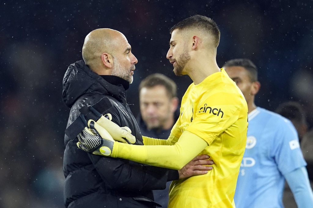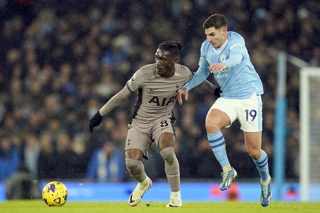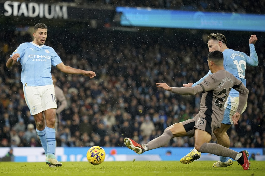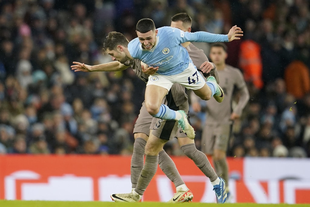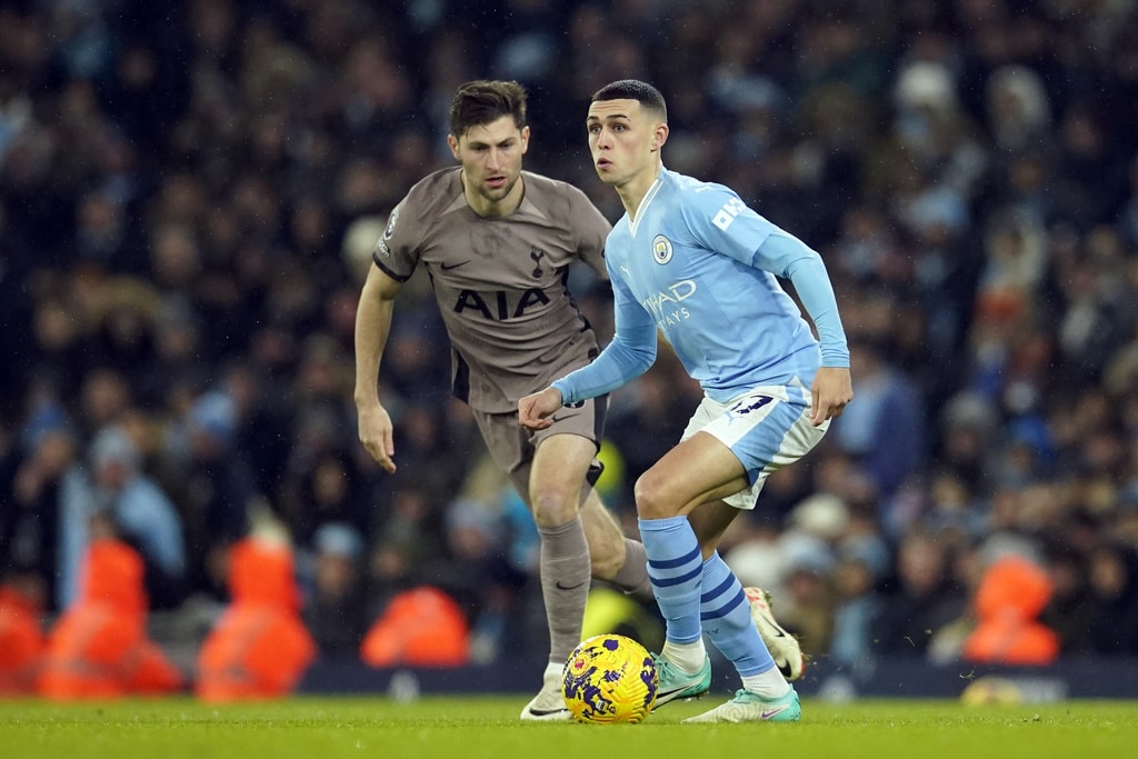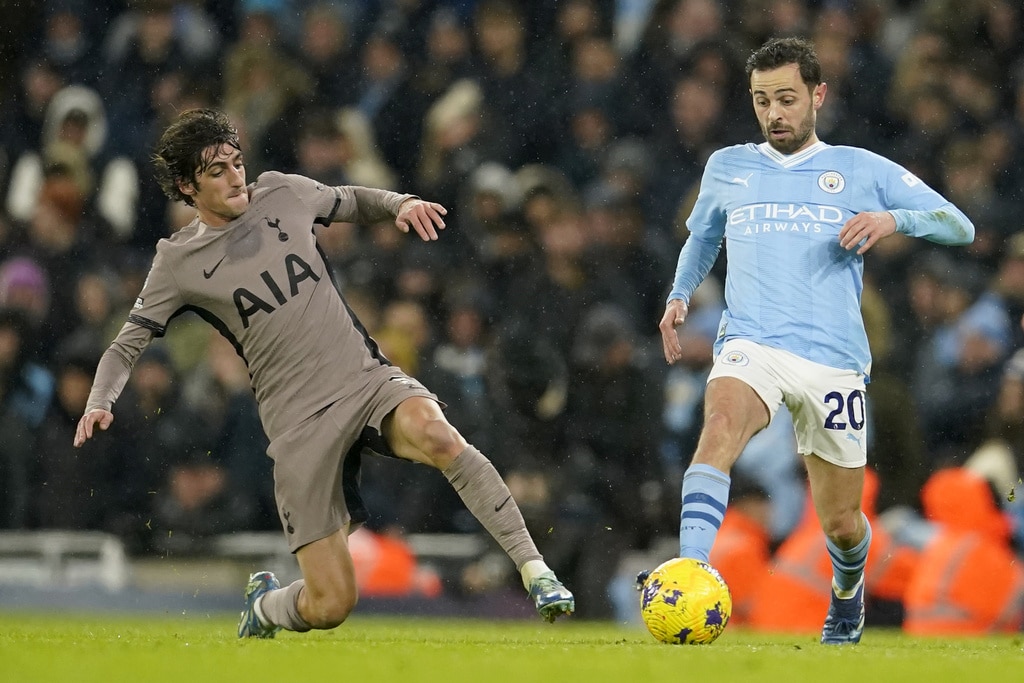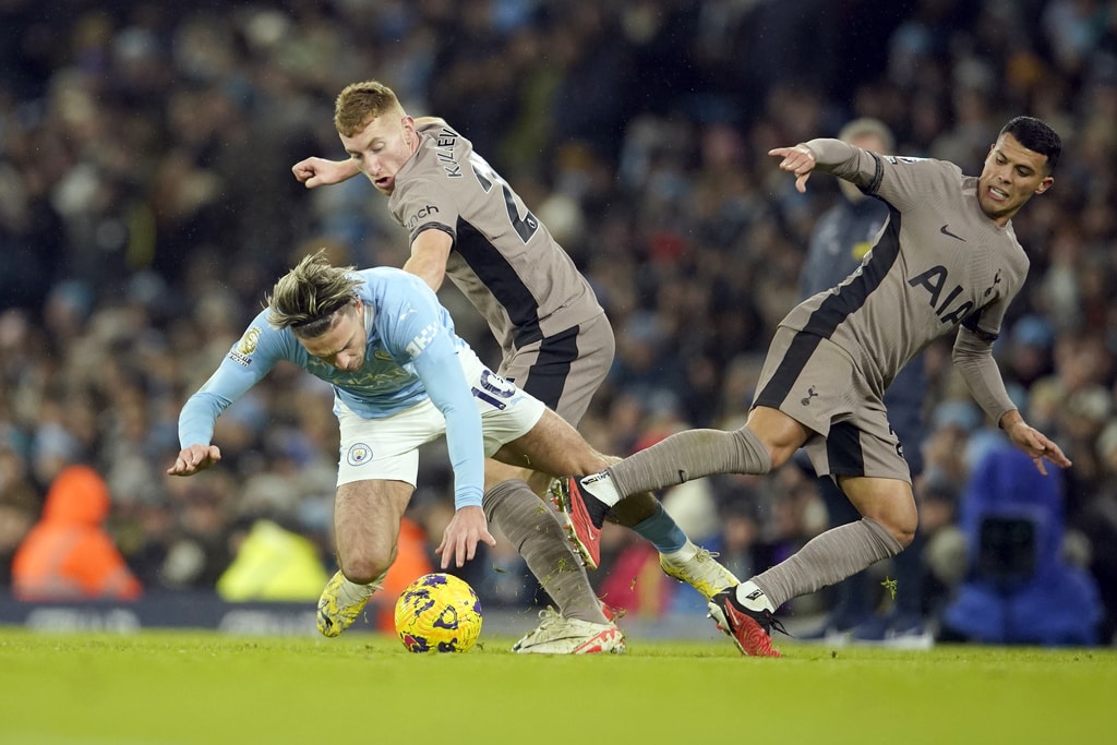 Manchester City’s Phil Foden controls the ball next to Tottenham’s Ben Davies, left, during the English Premier League soccer match between Manchester City and Tottenham Hotspur at Etihad stadium in Manchester, England, Sunday, Dec. 3, 2023. (AP Photo/Dave Thompson)Manchester City’s head coach Pep Guardiola speaks with Tottenham’s goalkeeper Guglielmo Vicario at the end of the English Premier League soccer match between Manchester City and Tottenham Hotspur at Etihad stadium in Manchester, England, Sunday, Dec. 3, 2023. The game ended in a 3-3 draw. (AP Photo/Dave Thompson)Manchester City’s head coach Pep Guardiola, 3rd left, speaks with Tottenham team staff while Manchester City’s Erling Haaland, right, argues with Tottenham players, at the end of the English Premier League soccer match between Manchester City and Tottenham Hotspur at Etihad stadium in Manchester, England, Sunday, Dec. 3, 2023. The game ended in a 3-3 draw. (AP Photo/Dave Thompson)Manchester City players surround Referee Simon Hooper in the last minutes of the English Premier League soccer match between Manchester City and Tottenham Hotspur at Etihad stadium in Manchester, England, Sunday, Dec. 3, 2023. (AP Photo/Dave Thompson)Manchester City’s Jack Grealish, right, scores his side’s third goal during the English Premier League soccer match between Manchester City and Tottenham Hotspur at Etihad stadium in Manchester, England, Sunday, Dec. 3, 2023. (AP Photo/Dave Thompson)Manchester City’s Jack Grealish celebrates with Bernardo Silva, right, after scoring his side’s third goal during the English Premier League soccer match between Manchester City and Tottenham Hotspur at Etihad stadium in Manchester, England, Sunday, Dec. 3, 2023. (AP Photo/Dave Thompson)Manchester City’s Jack Grealish celebrates after scoring his side’s third goal during the English Premier League soccer match between Manchester City and Tottenham Hotspur at Etihad stadium in Manchester, England, Sunday, Dec. 3, 2023. (AP Photo/Dave Thompson)Manchester City’s Erling Haaland reacts during the English Premier League soccer match between Manchester City and Tottenham Hotspur at Etihad stadium in Manchester, England, Sunday, Dec. 3, 2023. (AP Photo/Dave Thompson)Manchester City’s Julian Alvarez vies for the ball with Tottenham’s Yves Bissouma, left, during the English Premier League soccer match between Manchester City and Tottenham Hotspur at Etihad stadium in Manchester, England, Sunday, Dec. 3, 2023. (AP Photo/Dave Thompson)Manchester City’s Jack Grealish falls to the ground in a clash with Tottenham’s Dejan Kulusevski, background, and Pedro Porro, right, during the English Premier League soccer match between Manchester City and Tottenham Hotspur at Etihad stadium in Manchester, England, Sunday, Dec. 3, 2023. (AP Photo/Dave Thompson)Manchester City’s Phil Foden, foreground, falls down in a clash with Tottenham’s Ben Davies during the English Premier League soccer match between Manchester City and Tottenham Hotspur at Etihad stadium in Manchester, England, Sunday, Dec. 3, 2023. (AP Photo/Dave Thompson)Tottenham’s head coach Ange Postecoglou stands by the touchline before the English Premier League soccer match between Manchester City and Tottenham Hotspur at Etihad stadium in Manchester, England, Sunday, Dec. 3, 2023. (AP Photo/Dave Thompson)Manchester City’s Manuel Akanji passes the ball next to Tottenham’s Giovani Lo Celso, left, during the English Premier League soccer match between Manchester City and Tottenham Hotspur at Etihad stadium in Manchester, England, Sunday, Dec. 3, 2023. (AP Photo/Dave Thompson)Manchester City’s head coach Pep Guardiola reacts after Manchester City’s Erling Haaland missed a chance to score during the English Premier League soccer match between Manchester City and Tottenham Hotspur at Etihad stadium in Manchester, England, Sunday, Dec. 3, 2023. (AP Photo/Dave Thompson)Tottenham’s Bryan Gil tries to tackle Manchester City’s Bernardo Silva, right, during the English Premier League soccer match between Manchester City and Tottenham Hotspur at Etihad stadium in Manchester, England, Sunday, Dec. 3, 2023. (AP Photo/Dave Thompson)Tottenham’s Son Heung-min vies for the ball with Manchester City’s Jeremy Doku, right, during the English Premier League soccer match between Manchester City and Tottenham Hotspur at Etihad stadium in Manchester, England, Sunday, Dec. 3, 2023. (AP Photo/Dave Thompson)