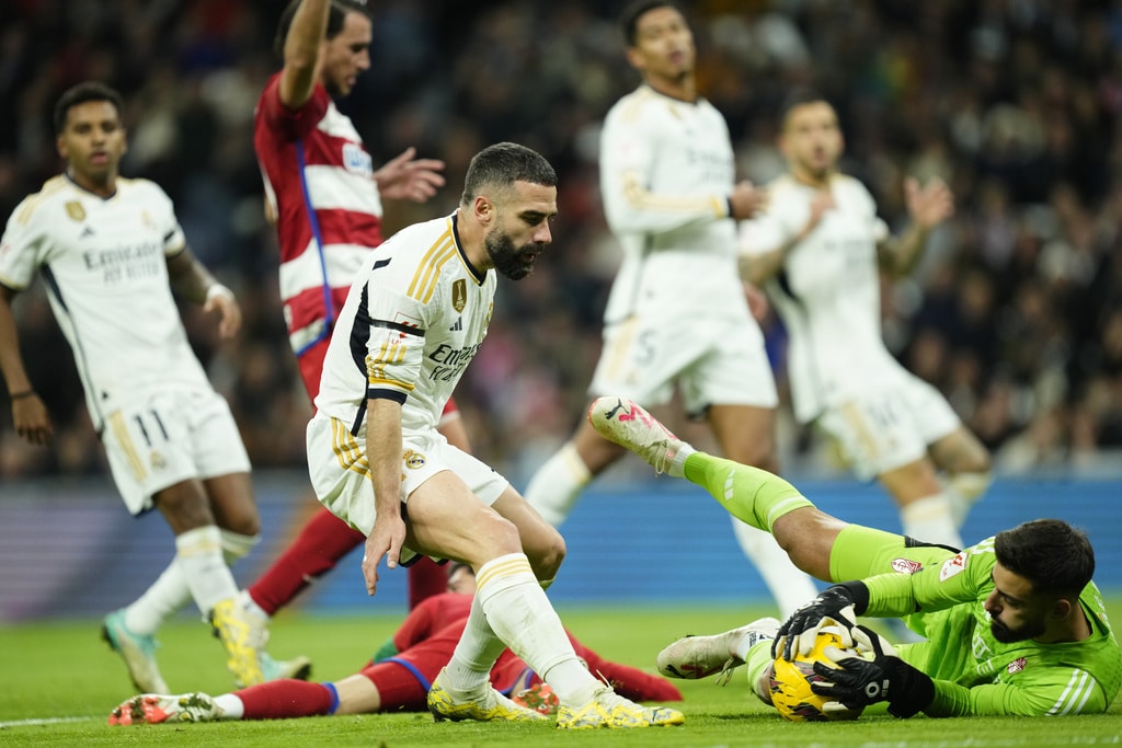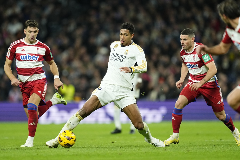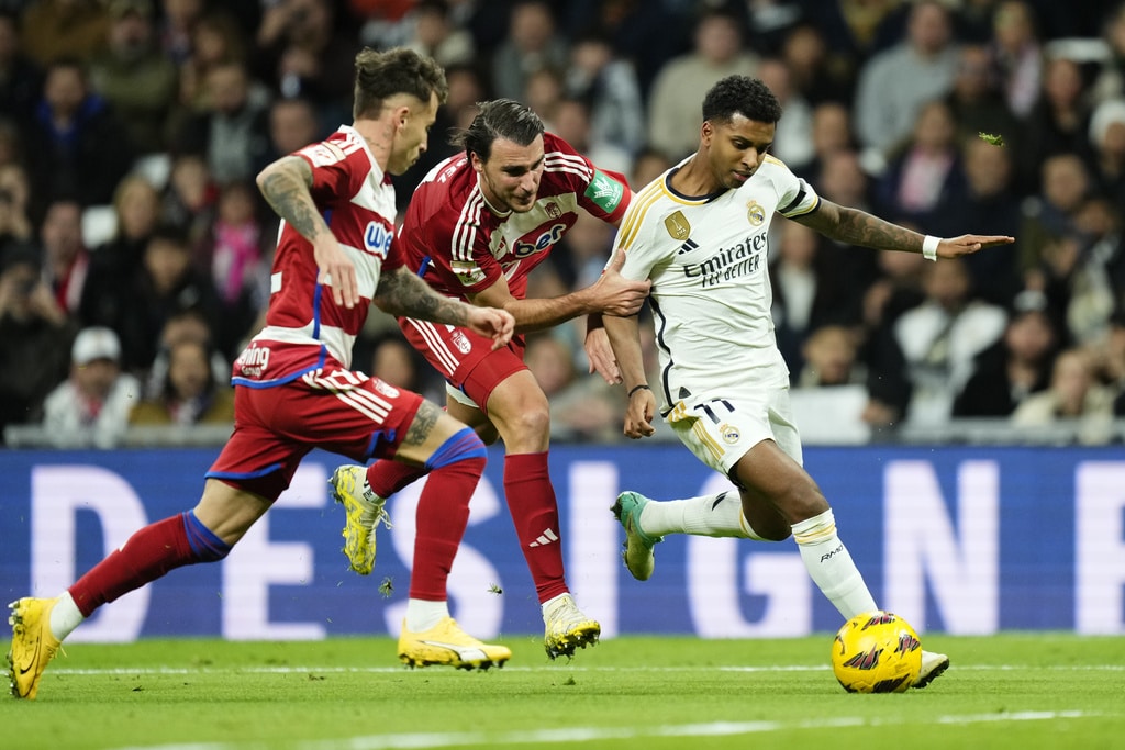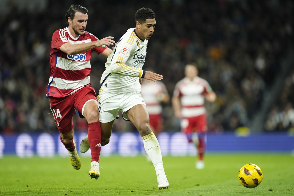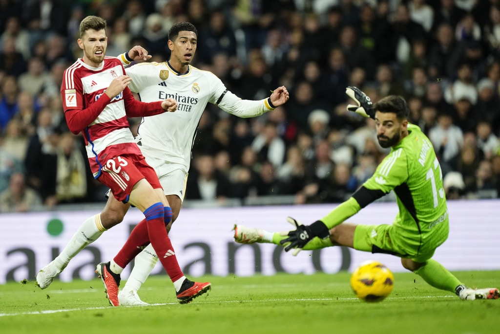 Real Madrid starting players pose for a team photo at the beginning of the Spanish La Liga soccer match between Real Madrid and Granada at the Santiago Bernabeu stadium in Madrid, Spain, Saturday, Dec. 2, 2023. (AP Photo/Jose Breton)Real Madrid’s Nico Paz, right, challenges for the ball with Granada’s Alvaro Fernandez during the Spanish La Liga soccer match between Real Madrid and Granada at the Santiago Bernabeu stadium in Madrid, Spain, Saturday, Dec. 2, 2023. (AP Photo/Jose Breton)Granada’s Ignasi Miquel, left, challenges for the ball with Real Madrid’s Jude Bellingham during the Spanish La Liga soccer match between Real Madrid and Granada at the Santiago Bernabeu stadium in Madrid, Spain, Saturday, Dec. 2, 2023. (AP Photo/Jose Breton)Real Madrid’s Rodrygo celebrates after scoring his side’s second goal during the Spanish La Liga soccer match between Real Madrid and Granada at the Santiago Bernabeu stadium in Madrid, Spain, Saturday, Dec. 2, 2023. (AP Photo/Jose Breton)Real Madrid’s Rodrygo, left, celebrates after scoring his side’s second goal during the Spanish La Liga soccer match between Real Madrid and Granada at the Santiago Bernabeu stadium in Madrid, Spain, Saturday, Dec. 2, 2023. (AP Photo/Jose Breton)Real Madrid’s Jude Bellingham, centre, in action during the Spanish La Liga soccer match between Real Madrid and Granada at the Santiago Bernabeu stadium in Madrid, Spain, Saturday, Dec. 2, 2023. (AP Photo/Jose Breton)Real Madrid’s David Alaba, right, challenges for the ball with Granada’s Lucas Boye during the Spanish La Liga soccer match between Real Madrid and Granada at the Santiago Bernabeu stadium in Madrid, Spain, Saturday, Dec. 2, 2023. (AP Photo/Jose Breton)Real Madrid’s Antonio Rudiger, left, challenges for the ball with Granada’s Lucas Boye during the Spanish La Liga soccer match between Real Madrid and Granada at the Santiago Bernabeu stadium in Madrid, Spain, Saturday, Dec. 2, 2023. (AP Photo/Jose Breton)Real Madrid’s Jude Bellingham, centre, in action against Granada’s Gerard Gumbau, left, and Granada’s goalkeeper Andre Ferreira during the Spanish La Liga soccer match between Real Madrid and Granada at the Santiago Bernabeu stadium in Madrid, Spain, Saturday, Dec. 2, 2023. (AP Photo/Jose Breton)Real Madrid’s Dani Carvajal, left, challenges for the ball with Granada’s Lucas Boye during the Spanish La Liga soccer match between Real Madrid and Granada at the Santiago Bernabeu stadium in Madrid, Spain, Saturday, Dec. 2, 2023. (AP Photo/Jose Breton)Granada’s goalkeeper Andre Ferreira, right, makes a save ahead Real Madrid’s Dani Carvajal during the Spanish La Liga soccer match between Real Madrid and Granada at the Santiago Bernabeu stadium in Madrid, Spain, Saturday, Dec. 2, 2023. (AP Photo/Jose Breton)Granada’s Carlos Neva, left, challenges for the ball with Real Madrid’s Brahim Diaz during the Spanish La Liga soccer match between Real Madrid and Granada at the Santiago Bernabeu stadium in Madrid, Spain, Saturday, Dec. 2, 2023. (AP Photo/Jose Breton)Real Madrid’s Rodrygo, right, challenges for the ball with Granada’s Ignasi Miquel during the Spanish La Liga soccer match between Real Madrid and Granada at the Santiago Bernabeu stadium in Madrid, Spain, Saturday, Dec. 2, 2023. (AP Photo/Jose Breton)Real Madrid’s Rodrygo in action during the Spanish La Liga soccer match between Real Madrid and Granada at the Santiago Bernabeu stadium in Madrid, Spain, Saturday, Dec. 2, 2023. (AP Photo/Jose Breton)