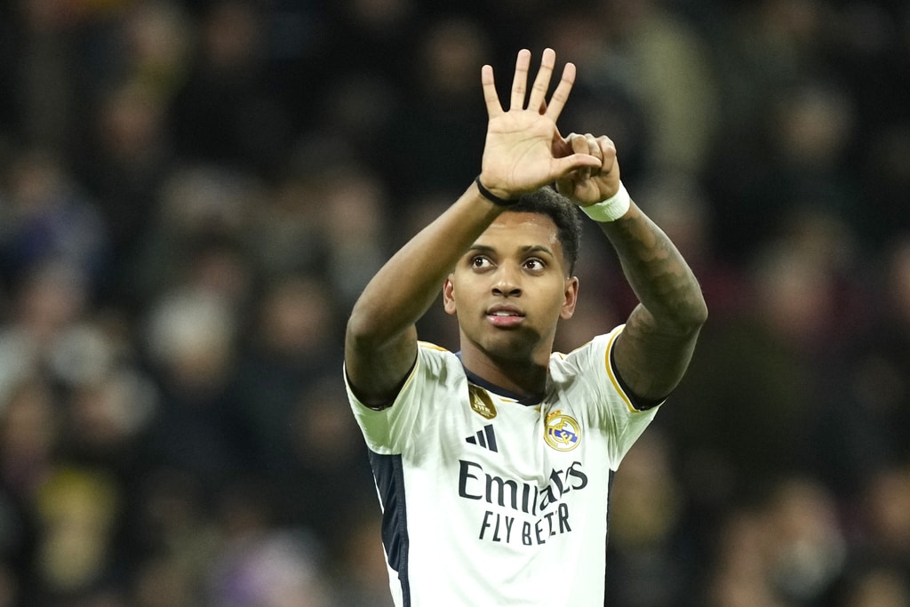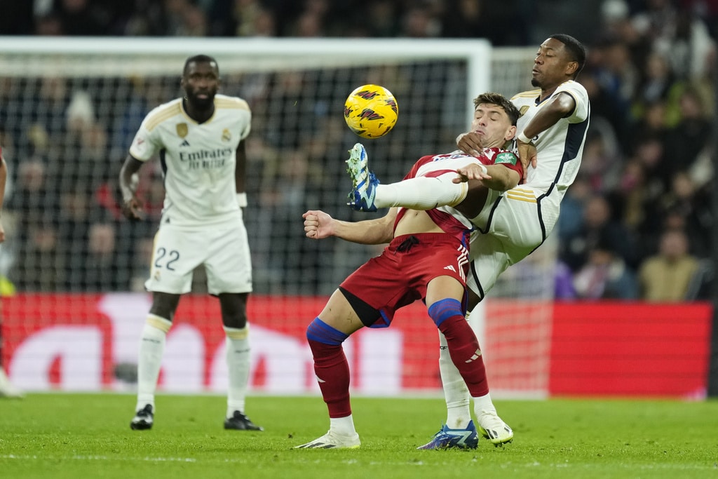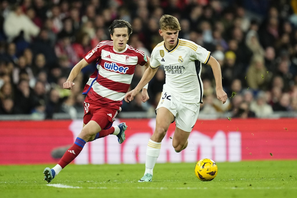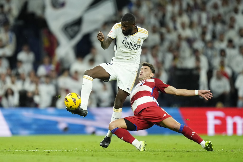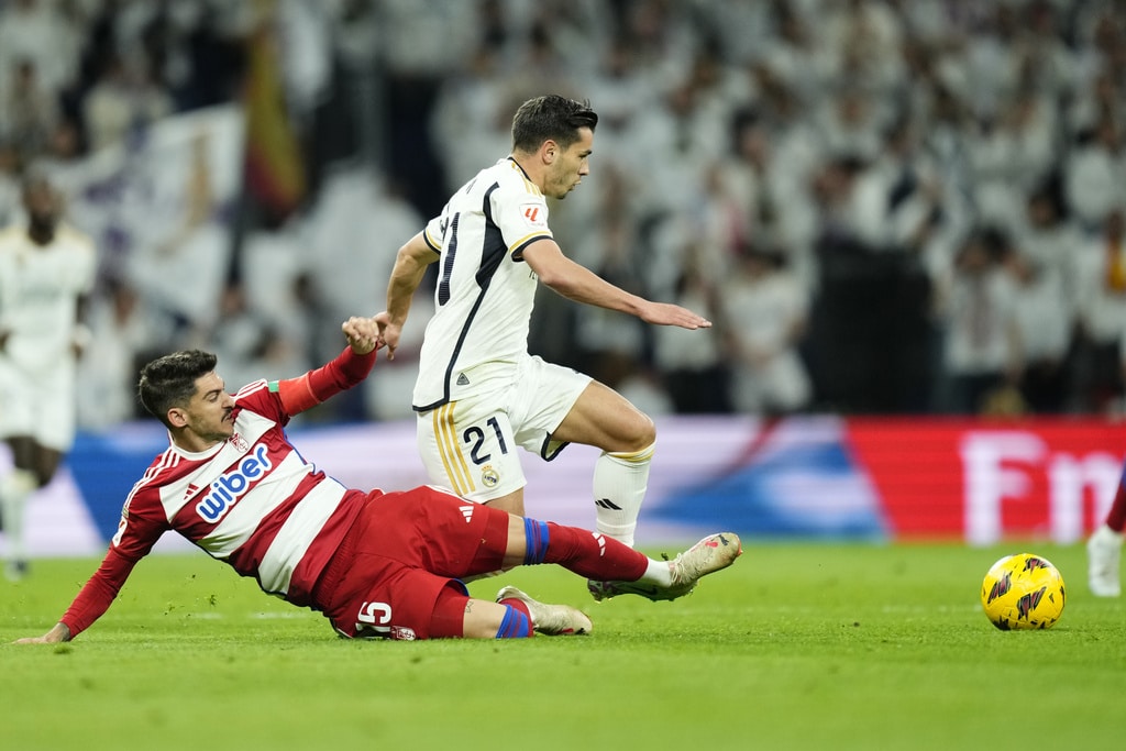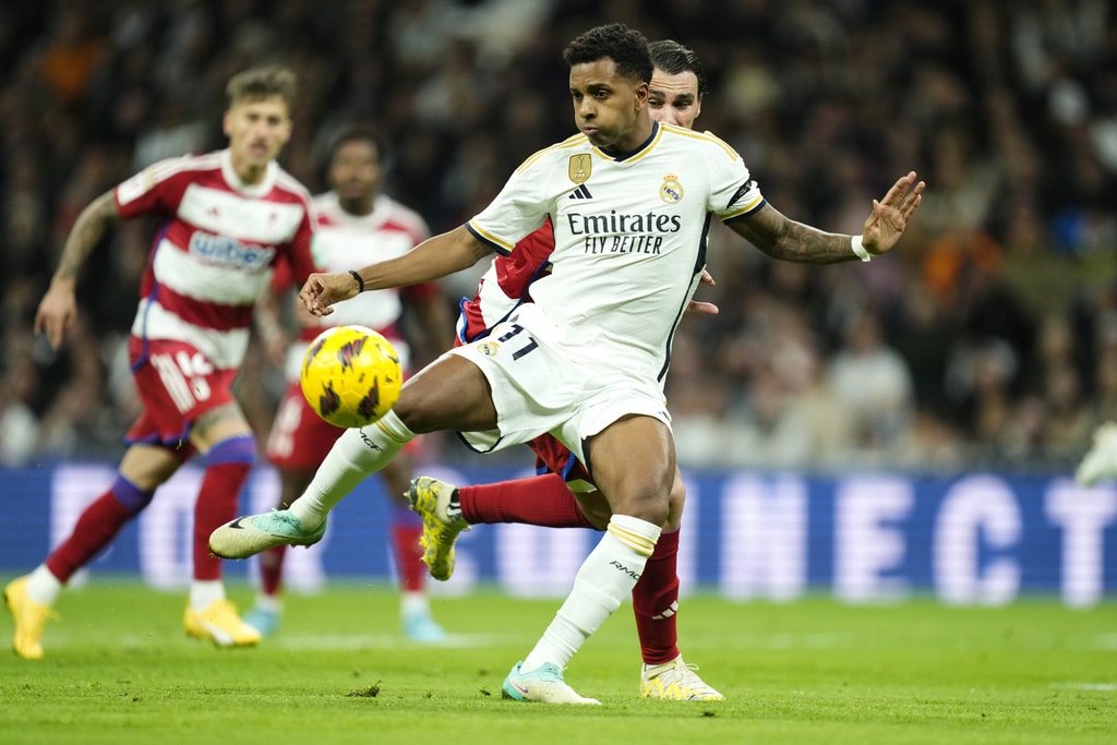 Real Madrid starting players pose for a team photo at the beginning of the Spanish La Liga soccer match between Real Madrid and Granada at the Santiago Bernabeu stadium in Madrid, Spain, Saturday, Dec. 2, 2023. (AP Photo/Jose Breton)Real Madrid’s Nico Paz, right, challenges for the ball with Granada’s Alvaro Fernandez during the Spanish La Liga soccer match between Real Madrid and Granada at the Santiago Bernabeu stadium in Madrid, Spain, Saturday, Dec. 2, 2023. (AP Photo/Jose Breton)Granada’s Ignasi Miquel, left, challenges for the ball with Real Madrid’s Jude Bellingham during the Spanish La Liga soccer match between Real Madrid and Granada at the Santiago Bernabeu stadium in Madrid, Spain, Saturday, Dec. 2, 2023. (AP Photo/Jose Breton)Real Madrid’s Rodrygo celebrates after scoring his side’s second goal during the Spanish La Liga soccer match between Real Madrid and Granada at the Santiago Bernabeu stadium in Madrid, Spain, Saturday, Dec. 2, 2023. (AP Photo/Jose Breton)Real Madrid’s Rodrygo, left, celebrates after scoring his side’s second goal during the Spanish La Liga soccer match between Real Madrid and Granada at the Santiago Bernabeu stadium in Madrid, Spain, Saturday, Dec. 2, 2023. (AP Photo/Jose Breton)Real Madrid’s Jude Bellingham, centre, in action during the Spanish La Liga soccer match between Real Madrid and Granada at the Santiago Bernabeu stadium in Madrid, Spain, Saturday, Dec. 2, 2023. (AP Photo/Jose Breton)Real Madrid’s David Alaba, right, challenges for the ball with Granada’s Lucas Boye during the Spanish La Liga soccer match between Real Madrid and Granada at the Santiago Bernabeu stadium in Madrid, Spain, Saturday, Dec. 2, 2023. (AP Photo/Jose Breton)Real Madrid’s Antonio Rudiger, left, challenges for the ball with Granada’s Lucas Boye during the Spanish La Liga soccer match between Real Madrid and Granada at the Santiago Bernabeu stadium in Madrid, Spain, Saturday, Dec. 2, 2023. (AP Photo/Jose Breton)Real Madrid’s Jude Bellingham, centre, in action against Granada’s Gerard Gumbau, left, and Granada’s goalkeeper Andre Ferreira during the Spanish La Liga soccer match between Real Madrid and Granada at the Santiago Bernabeu stadium in Madrid, Spain, Saturday, Dec. 2, 2023. (AP Photo/Jose Breton)Real Madrid’s Dani Carvajal, left, challenges for the ball with Granada’s Lucas Boye during the Spanish La Liga soccer match between Real Madrid and Granada at the Santiago Bernabeu stadium in Madrid, Spain, Saturday, Dec. 2, 2023. (AP Photo/Jose Breton)Granada’s goalkeeper Andre Ferreira, right, makes a save ahead Real Madrid’s Dani Carvajal during the Spanish La Liga soccer match between Real Madrid and Granada at the Santiago Bernabeu stadium in Madrid, Spain, Saturday, Dec. 2, 2023. (AP Photo/Jose Breton)Granada’s Carlos Neva, left, challenges for the ball with Real Madrid’s Brahim Diaz during the Spanish La Liga soccer match between Real Madrid and Granada at the Santiago Bernabeu stadium in Madrid, Spain, Saturday, Dec. 2, 2023. (AP Photo/Jose Breton)Real Madrid’s Rodrygo, right, challenges for the ball with Granada’s Ignasi Miquel during the Spanish La Liga soccer match between Real Madrid and Granada at the Santiago Bernabeu stadium in Madrid, Spain, Saturday, Dec. 2, 2023. (AP Photo/Jose Breton)Real Madrid’s Rodrygo in action during the Spanish La Liga soccer match between Real Madrid and Granada at the Santiago Bernabeu stadium in Madrid, Spain, Saturday, Dec. 2, 2023. (AP Photo/Jose Breton)