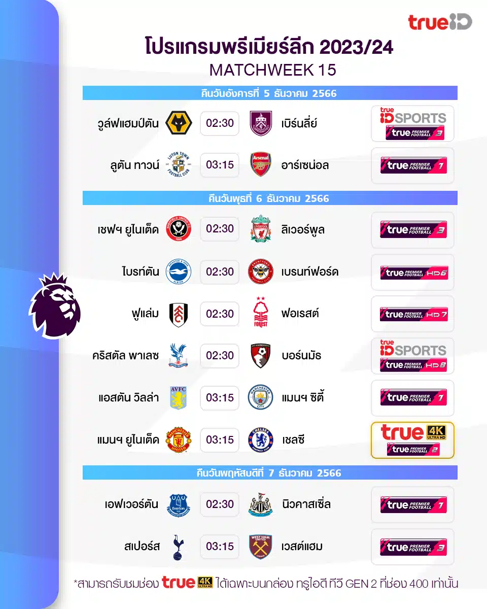 โปรแกรมพรีเมียร์ลีก 2023/24 สัปดาห์ที่ 15 แข่งวันที่ 5-7 ธ.ค. นี้ เช็คตารางแข่งพร้อมช่องดูบอลสด