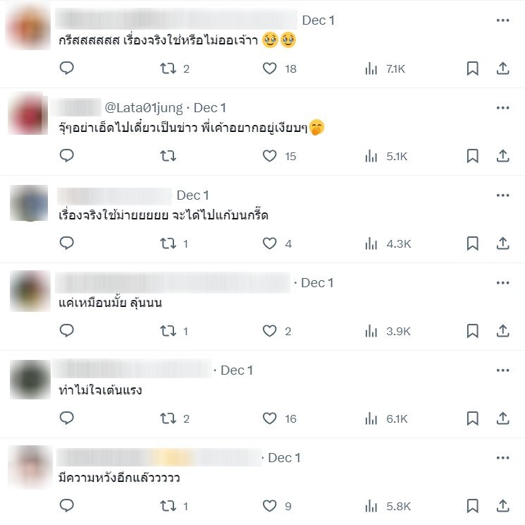 มีความหวังอีกแล๊ววววว, กรีสสสสสส เรื่องจริงใช่หรือไม่ออเจ้าา, แค่เหมือนมั้ย ลุ้นนน, ขอให้เป็นจริง แอบลุ้นอยู่, ก็ว่าลงรูปแปลกๆ จะบังเอิญไปไหม, ดีใจรอเลยค่ะ เชียร์ทั้งคู่มากๆๆๆๆ ศีลเสมอกัน รอวันที่ฝันเป็นจริงค่ะ