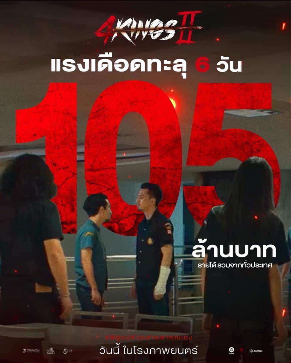 เรียกได้ว่าแรงไม่หยุด ฉุดไม่อยู่ สำหรับภาพยนตร์ 4 KINGS 2 ที่ล่าสุด สร้างปรากฎการณ์กวาดรายได้ไปแล้ว 105 ล้านบาทจากทั่วประเทศ แม้จะพึ่งเข้าฉายได้วันที่ 6 เท่านั้น และยังไม่มีทีท่าว่าจะหยุดสร้างรายได้เพียงเท่านี้