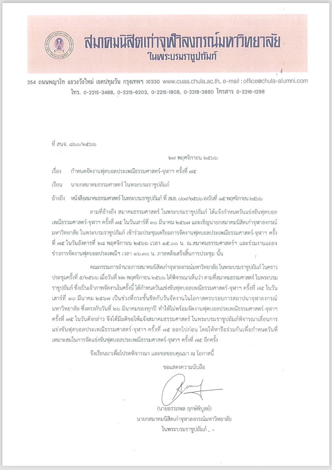 ตามที่ชุมนุมเชียร์ มหาวิทยาลัยธรรมศาสตร์ และองค์การบริหารสโมสรนิสิต จุฬาลงกรณ์มหาวิทยาลัย ได้มีการประชาสัมพันธ์เรื่องการกลับมาจัดการแข่งขันงานฟุตบอลประเพณีธรรมศาสตร์-จุฬาฯ ครั้งที่ 75 ในช่องทางสื่อสังคมออนไลน์ในวันศุกร์ที่ 17 พฤศจิกายน พ.ศ. 2566 ที่ผ่านมานั้น