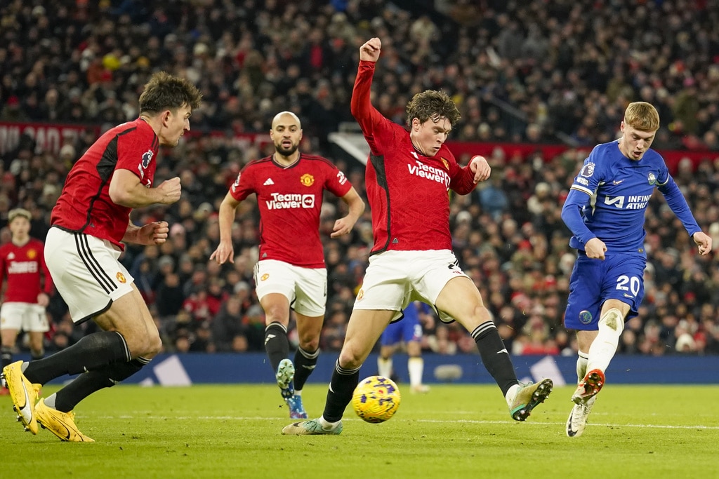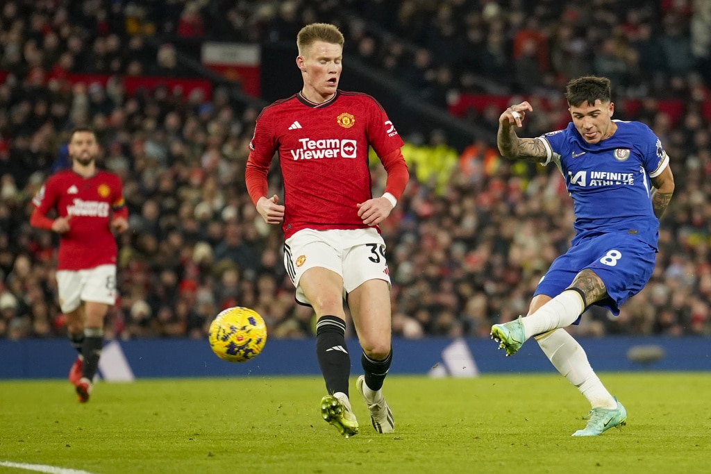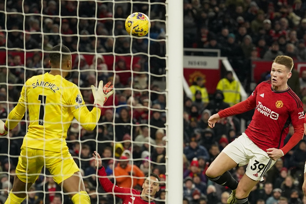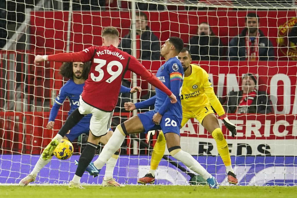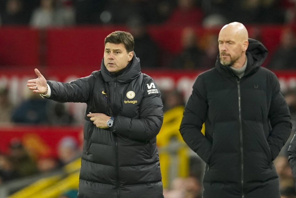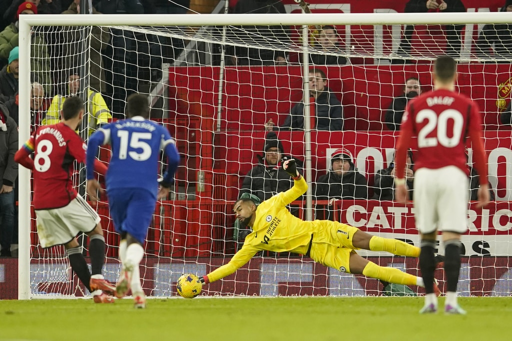 Manchester United’s head coach Erik ten Hag, right, and Chelsea’s head coach Mauricio Pochettino react during the English Premier League soccer match between Manchester United and Chelsea at Old Trafford stadium in Manchester, England, Wednesday, Dec. 6, 2023. (AP Photo/Dave Thompson)Manchester United’s Bruno Fernandes applauds at the end of the English Premier League soccer match between Manchester United and Chelsea at Old Trafford stadium in Manchester, England, Wednesday, Dec. 6, 2023. (AP Photo/Dave Thompson)Manchester United players celebrate at the end of the English Premier League soccer match between Manchester United and Chelsea at Old Trafford stadium in Manchester, England, Wednesday, Dec. 6, 2023. (AP Photo/Dave Thompson)Manchester United’s Alejandro Garnacho reacts after missing a chance to score during the English Premier League soccer match between Manchester United and Chelsea at Old Trafford stadium in Manchester, England, Wednesday, Dec. 6, 2023. (AP Photo/Dave Thompson)Manchester United’s Scott McTominay, center, celebrates after scoring his side’s second goal during the English Premier League soccer match between Manchester United and Chelsea at Old Trafford stadium in Manchester, England, Wednesday, Dec. 6, 2023. (AP Photo/Dave Thompson)Manchester United’s Scott McTominay, right, scores his side’s second goal during the English Premier League soccer match between Manchester United and Chelsea at Old Trafford stadium in Manchester, England, Wednesday, Dec. 6, 2023. (AP Photo/Dave Thompson)Manchester United’s Scott McTominay, center, scores his side’s second goal during the English Premier League soccer match between Manchester United and Chelsea at Old Trafford stadium in Manchester, England, Wednesday, Dec. 6, 2023. (AP Photo/Dave Thompson)Manchester United’s Rasmus Hojlund, left, duels for the ball with Chelsea’s Moises Caicedo during the English Premier League soccer match between Manchester United and Chelsea at Old Trafford stadium in Manchester, England, Wednesday, Dec. 6, 2023. (AP Photo/Dave Thompson)Manchester United’s Alejandro Garnacho, right, duels for the ball with Chelsea’s Raheem Sterling during the English Premier League soccer match between Manchester United and Chelsea at Old Trafford stadium in Manchester, England, Wednesday, Dec. 6, 2023. (AP Photo/Dave Thompson)Manchester United’s Scott McTominay, front left, duels for the ball with Chelsea’s Nicolas Jackson during the English Premier League soccer match between Manchester United and Chelsea at Old Trafford stadium in Manchester, England, Wednesday, Dec. 6, 2023. (AP Photo/Dave Thompson)Manchester United’s Scott McTominay, front right, duels for the ball with Chelsea’s Nicolas Jackson during the English Premier League soccer match between Manchester United and Chelsea at Old Trafford stadium in Manchester, England, Wednesday, Dec. 6, 2023. (AP Photo/Dave Thompson)Chelsea’s Cole Palmer, right, celebrates with teammates after scoring his side’s opening goal during the English Premier League soccer match between Manchester United and Chelsea at Old Trafford stadium in Manchester, England, Wednesday, Dec. 6, 2023. (AP Photo/Dave Thompson)Chelsea’s Cole Palmer, right, scores his side’s opening goal during the English Premier League soccer match between Manchester United and Chelsea at Old Trafford stadium in Manchester, England, Wednesday, Dec. 6, 2023. (AP Photo/Dave Thompson)Manchester United’s Scott McTominay, left, tries to block a shot from Chelsea’s Enzo Fernandez during the English Premier League soccer match between Manchester United and Chelsea at Old Trafford stadium in Manchester, England, Wednesday, Dec. 6, 2023. (AP Photo/Dave Thompson)Manchester United’s Scott McTominay, front, scores his side’s opening goal during the English Premier League soccer match between Manchester United and Chelsea at Old Trafford stadium in Manchester, England, Wednesday, Dec. 6, 2023. (AP Photo/Dave Thompson)Chelsea’s goalkeeper Robert Sanchez makes a save penalty shoot in front of Manchester United’s Bruno Fernandes, left, during the English Premier League soccer match between Manchester United and Chelsea at Old Trafford stadium in Manchester, England, Wednesday, Dec. 6, 2023. (AP Photo/Dave Thompson)Manchester United’s Antony, front right, duels for the ball with Chelsea’s Thiago Silva, second right, and Chelsea’s Enzo Fernandez during the English Premier League soccer match between Manchester United and Chelsea at Old Trafford stadium in Manchester, England, Wednesday, Dec. 6, 2023. (AP Photo/Dave Thompson)
