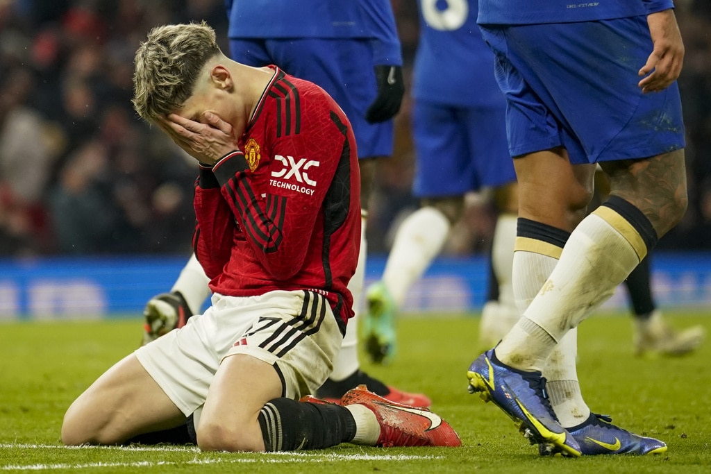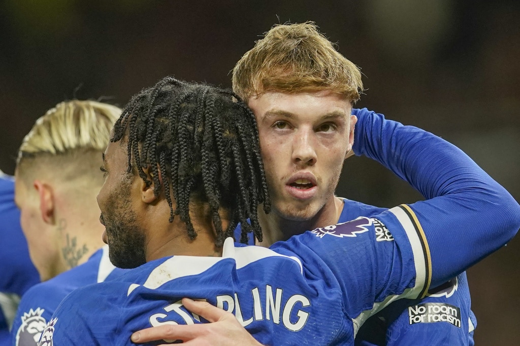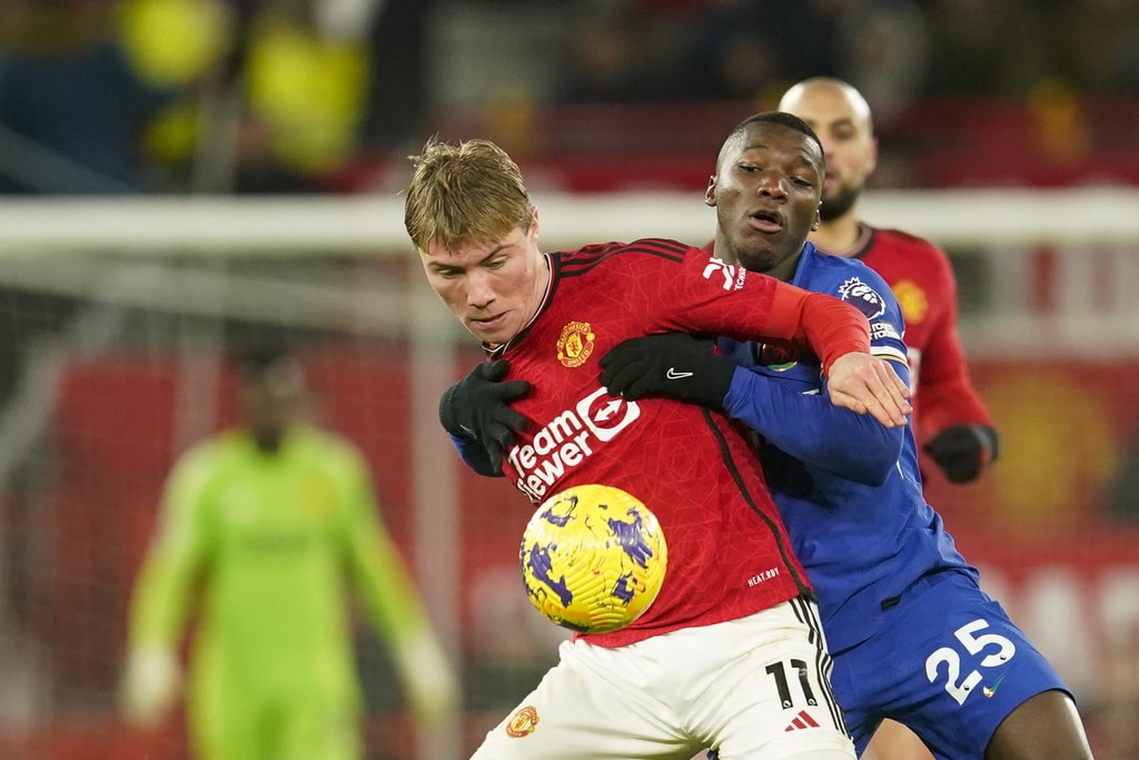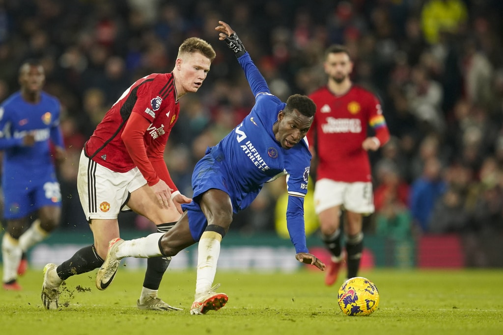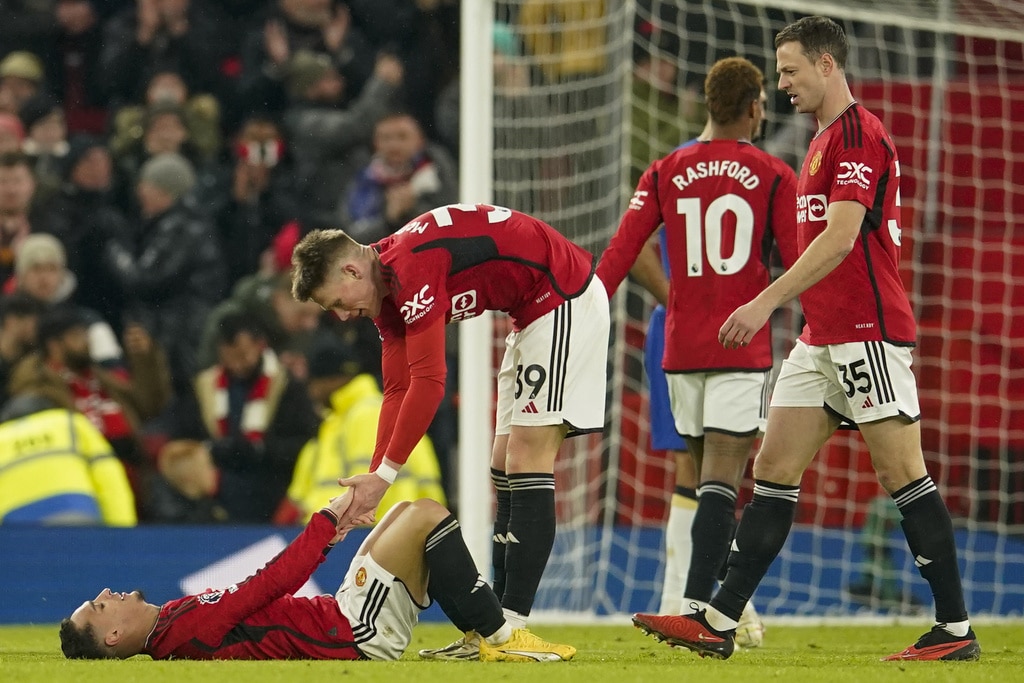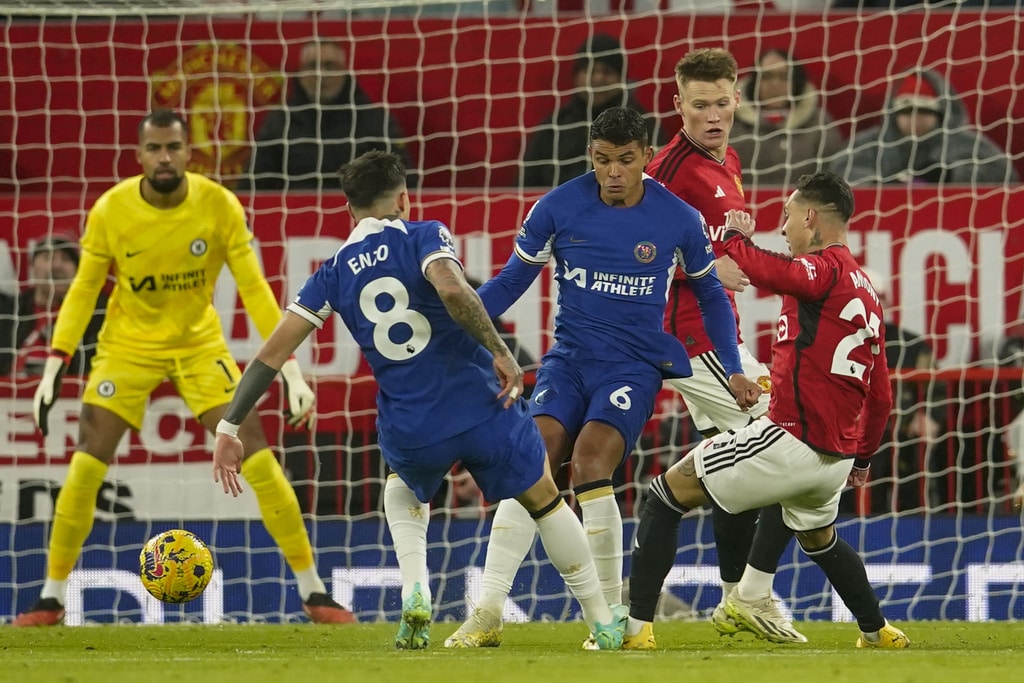 Manchester United’s head coach Erik ten Hag, right, and Chelsea’s head coach Mauricio Pochettino react during the English Premier League soccer match between Manchester United and Chelsea at Old Trafford stadium in Manchester, England, Wednesday, Dec. 6, 2023. (AP Photo/Dave Thompson)Manchester United’s Bruno Fernandes applauds at the end of the English Premier League soccer match between Manchester United and Chelsea at Old Trafford stadium in Manchester, England, Wednesday, Dec. 6, 2023. (AP Photo/Dave Thompson)Manchester United players celebrate at the end of the English Premier League soccer match between Manchester United and Chelsea at Old Trafford stadium in Manchester, England, Wednesday, Dec. 6, 2023. (AP Photo/Dave Thompson)Manchester United’s Alejandro Garnacho reacts after missing a chance to score during the English Premier League soccer match between Manchester United and Chelsea at Old Trafford stadium in Manchester, England, Wednesday, Dec. 6, 2023. (AP Photo/Dave Thompson)Manchester United’s Scott McTominay, center, celebrates after scoring his side’s second goal during the English Premier League soccer match between Manchester United and Chelsea at Old Trafford stadium in Manchester, England, Wednesday, Dec. 6, 2023. (AP Photo/Dave Thompson)Manchester United’s Scott McTominay, right, scores his side’s second goal during the English Premier League soccer match between Manchester United and Chelsea at Old Trafford stadium in Manchester, England, Wednesday, Dec. 6, 2023. (AP Photo/Dave Thompson)Manchester United’s Scott McTominay, center, scores his side’s second goal during the English Premier League soccer match between Manchester United and Chelsea at Old Trafford stadium in Manchester, England, Wednesday, Dec. 6, 2023. (AP Photo/Dave Thompson)Manchester United’s Rasmus Hojlund, left, duels for the ball with Chelsea’s Moises Caicedo during the English Premier League soccer match between Manchester United and Chelsea at Old Trafford stadium in Manchester, England, Wednesday, Dec. 6, 2023. (AP Photo/Dave Thompson)Manchester United’s Alejandro Garnacho, right, duels for the ball with Chelsea’s Raheem Sterling during the English Premier League soccer match between Manchester United and Chelsea at Old Trafford stadium in Manchester, England, Wednesday, Dec. 6, 2023. (AP Photo/Dave Thompson)Manchester United’s Scott McTominay, front left, duels for the ball with Chelsea’s Nicolas Jackson during the English Premier League soccer match between Manchester United and Chelsea at Old Trafford stadium in Manchester, England, Wednesday, Dec. 6, 2023. (AP Photo/Dave Thompson)Manchester United’s Scott McTominay, front right, duels for the ball with Chelsea’s Nicolas Jackson during the English Premier League soccer match between Manchester United and Chelsea at Old Trafford stadium in Manchester, England, Wednesday, Dec. 6, 2023. (AP Photo/Dave Thompson)Chelsea’s Cole Palmer, right, celebrates with teammates after scoring his side’s opening goal during the English Premier League soccer match between Manchester United and Chelsea at Old Trafford stadium in Manchester, England, Wednesday, Dec. 6, 2023. (AP Photo/Dave Thompson)Chelsea’s Cole Palmer, right, scores his side’s opening goal during the English Premier League soccer match between Manchester United and Chelsea at Old Trafford stadium in Manchester, England, Wednesday, Dec. 6, 2023. (AP Photo/Dave Thompson)Manchester United’s Scott McTominay, left, tries to block a shot from Chelsea’s Enzo Fernandez during the English Premier League soccer match between Manchester United and Chelsea at Old Trafford stadium in Manchester, England, Wednesday, Dec. 6, 2023. (AP Photo/Dave Thompson)Manchester United’s Scott McTominay, front, scores his side’s opening goal during the English Premier League soccer match between Manchester United and Chelsea at Old Trafford stadium in Manchester, England, Wednesday, Dec. 6, 2023. (AP Photo/Dave Thompson)Chelsea’s goalkeeper Robert Sanchez makes a save penalty shoot in front of Manchester United’s Bruno Fernandes, left, during the English Premier League soccer match between Manchester United and Chelsea at Old Trafford stadium in Manchester, England, Wednesday, Dec. 6, 2023. (AP Photo/Dave Thompson)Manchester United’s Antony, front right, duels for the ball with Chelsea’s Thiago Silva, second right, and Chelsea’s Enzo Fernandez during the English Premier League soccer match between Manchester United and Chelsea at Old Trafford stadium in Manchester, England, Wednesday, Dec. 6, 2023. (AP Photo/Dave Thompson)