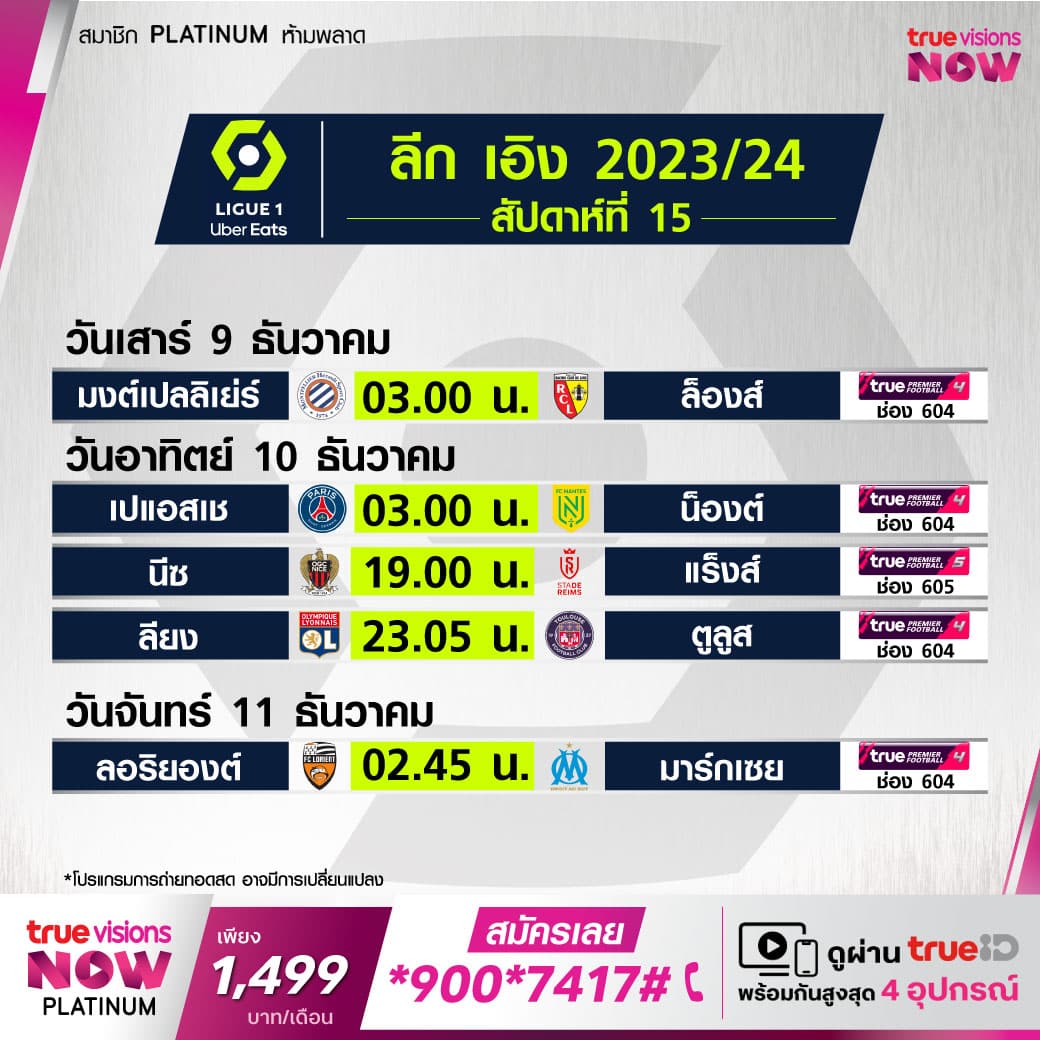 ตารางแข่งขัน ลีกเอิง ฝรั่งเศส โปรแกรมฟุตบอล ลีกเอิง 2023/24 สัปดาห์ที่ 15 ถ่ายทอดสดทาง beIN Sports และ True Sports