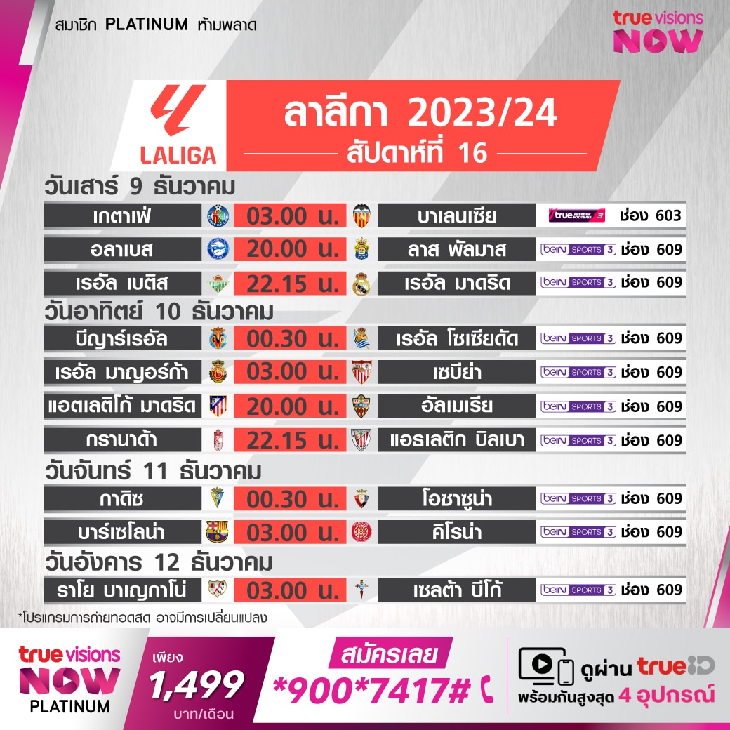 โปรแกรม ลาลีกา สเปน ประจำฤดูกาล 2023/24 สัปดาห์ที่ 16 ถ่ายทอดสดทางช่อง beIN Sport