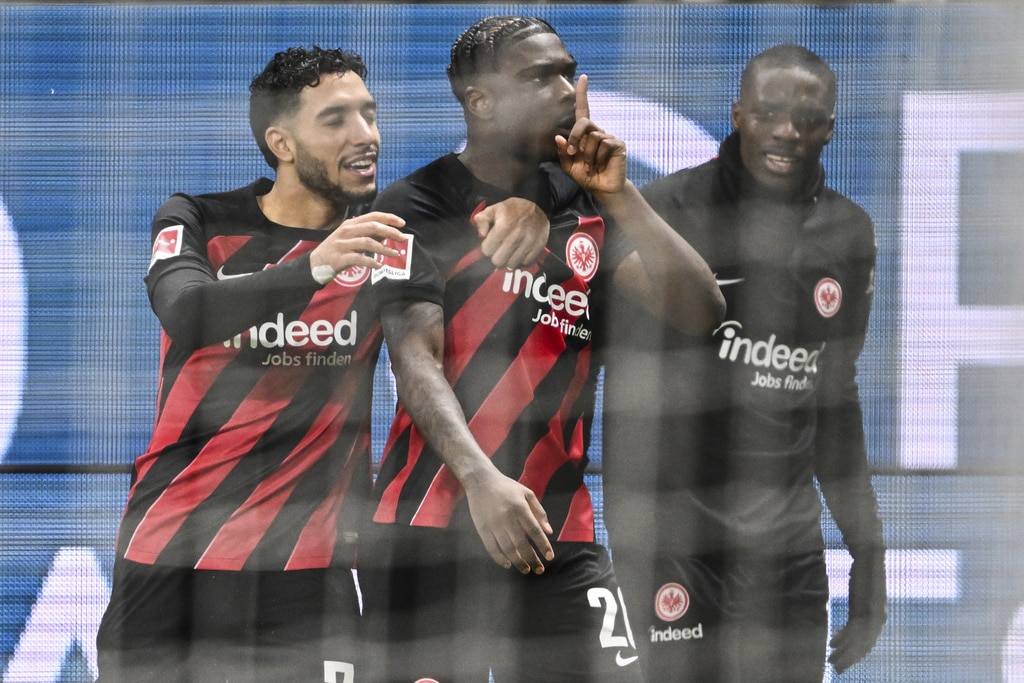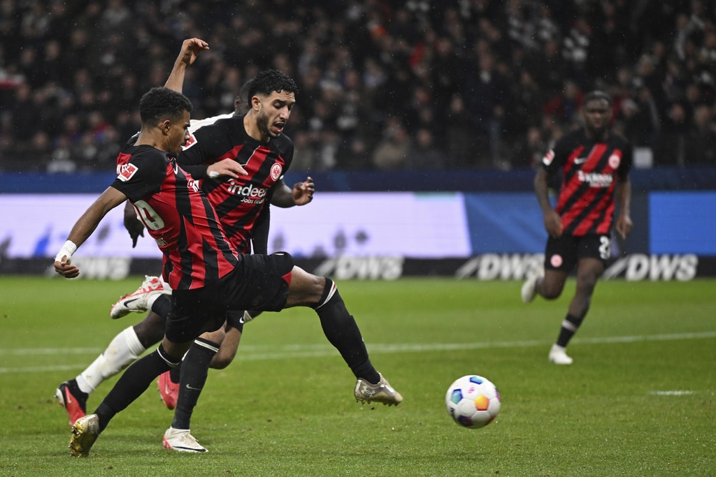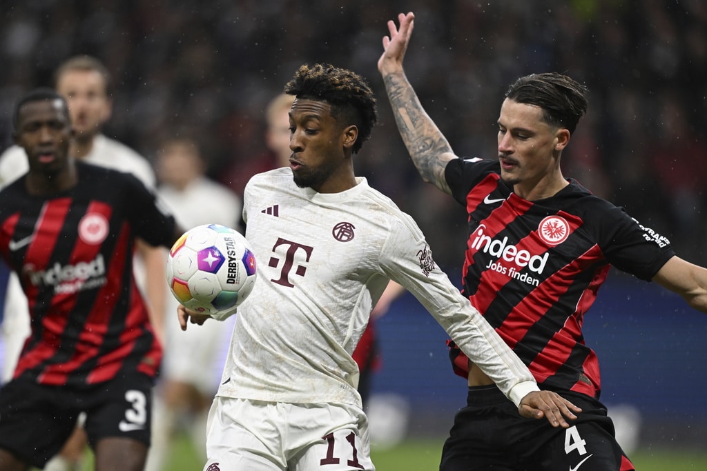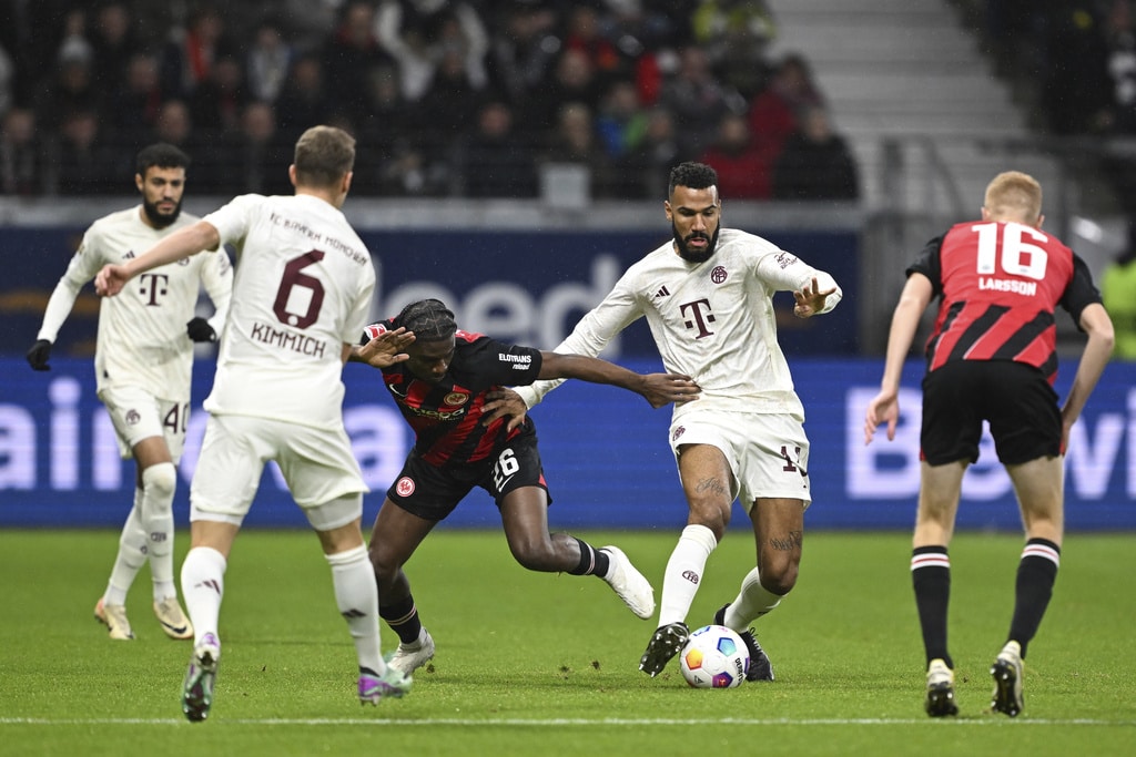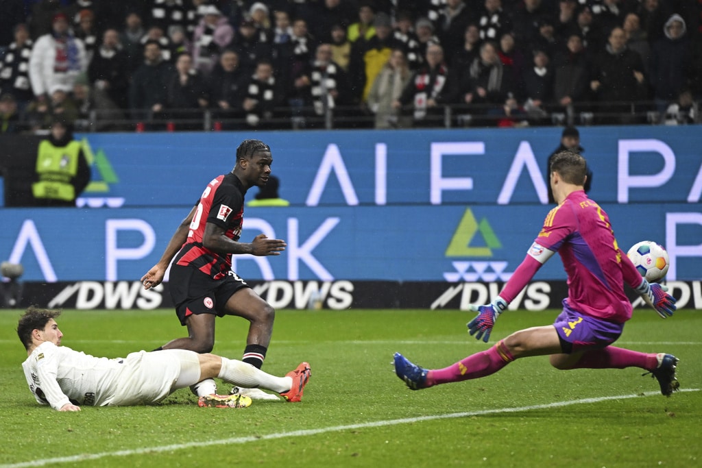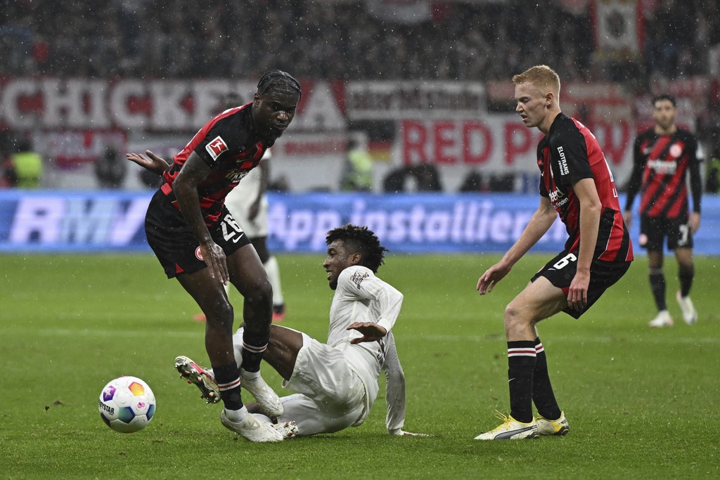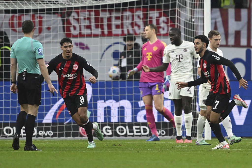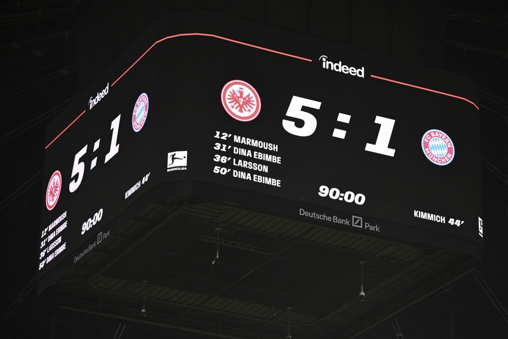 Munich’s Kingsley Coman and Frankfurt’s Robin Koch, right, fight for the ball during the German Bundesliga soccer match between Eintracht Frankfurt and Bayern Munich at Deutsche Bank Park in Frankfurt, Germany, Saturday, Dec. 9, 2023. (Arne Dedert/dpa via AP)Frankfurt’s Ansgar Knauff, left, scores his side’s fifth goal of the game during the German Bundesliga soccer match between Eintracht Frankfurt and Bayern Munich at Deutsche Bank Park in Frankfurt, Germany, Saturday, Dec. 9, 2023. (Arne Dedert/dpa via AP)Frankfurt’s Eric Junior Dina Ebimbe, center, celebrates scoring his side’s fourth goal of the game with teammate Omar Marmoush during the German Bundesliga soccer match between Eintracht Frankfurt and Bayern Munich at Deutsche Bank Park in Frankfurt, Germany, Saturday, Dec. 9, 2023. (Arne Dedert/dpa via AP)Frankfurt’s Eric Junior Dina Ebimbe, center, scores his side’s fourth goal of the game past Munich goalkeeper Manuel Neuer during the German Bundesliga soccer match between Eintracht Frankfurt and Bayern Munich at Deutsche Bank Park in Frankfurt, Germany, Saturday, Dec. 9, 2023. (Arne Dedert/dpa via AP)Frankfurt’s Hugo Larsson, center, celebrates with teammates Omar Marmoush, left, and Eric Junior Dina Ebimbe after scoring his side’s third goal of the game during the German Bundesliga soccer match between Eintracht Frankfurt and Bayern Munich at Deutsche Bank Park in Frankfurt, Germany, Saturday, Dec. 9, 2023. (Arne Dedert/dpa via AP)Frankfurt’s Eric Junior Dina Ebimbe, left, in action against Munich’s Kingsley Coman during the German Bundesliga soccer match between Eintracht Frankfurt and Bayern Munich at Deutsche Bank Park in Frankfurt, Germany, Saturday, Dec. 9, 2023. (Arne Dedert/dpa via AP)Frankfurt’s Omar Marmoush, right, celebrates scoring the first goal of the game during the German Bundesliga soccer match between Eintracht Frankfurt and Bayern Munich at Deutsche Bank Park in Frankfurt, Germany, Saturday, Dec. 9, 2023. (Arne Dedert/dpa via AP)Munich’s Eric Maxim Choupo-Moting, center right, and Frankfurt’s Eric Junior Dina Ebimbe fight for the ball during the German Bundesliga soccer match between Eintracht Frankfurt and Bayern Munich at Deutsche Bank Park in Frankfurt, Germany, Saturday, Dec. 9, 2023. (Arne Dedert/dpa via AP)Frankfurt’s Willian Pacho, right, and Munich’s Harry Kane fight for the ball during the German Bundesliga soccer match between Eintracht Frankfurt and Bayern Munich at Deutsche Bank Park in Frankfurt, Germany, Saturday, Dec. 9, 2023. (Arne Dedert/dpa via AP)The scoreboard shows the final score after the German Bundesliga soccer match between Eintracht Frankfurt and Bayern Munich at Deutsche Bank Park in Frankfurt, Germany, Saturday, Dec. 9, 2023. (Arne Dedert/dpa via AP)