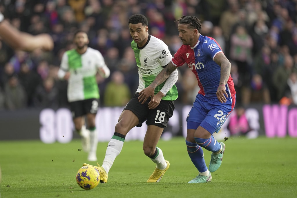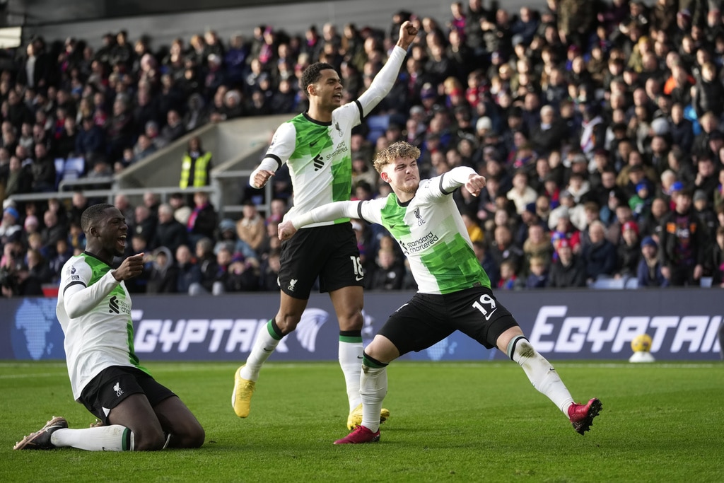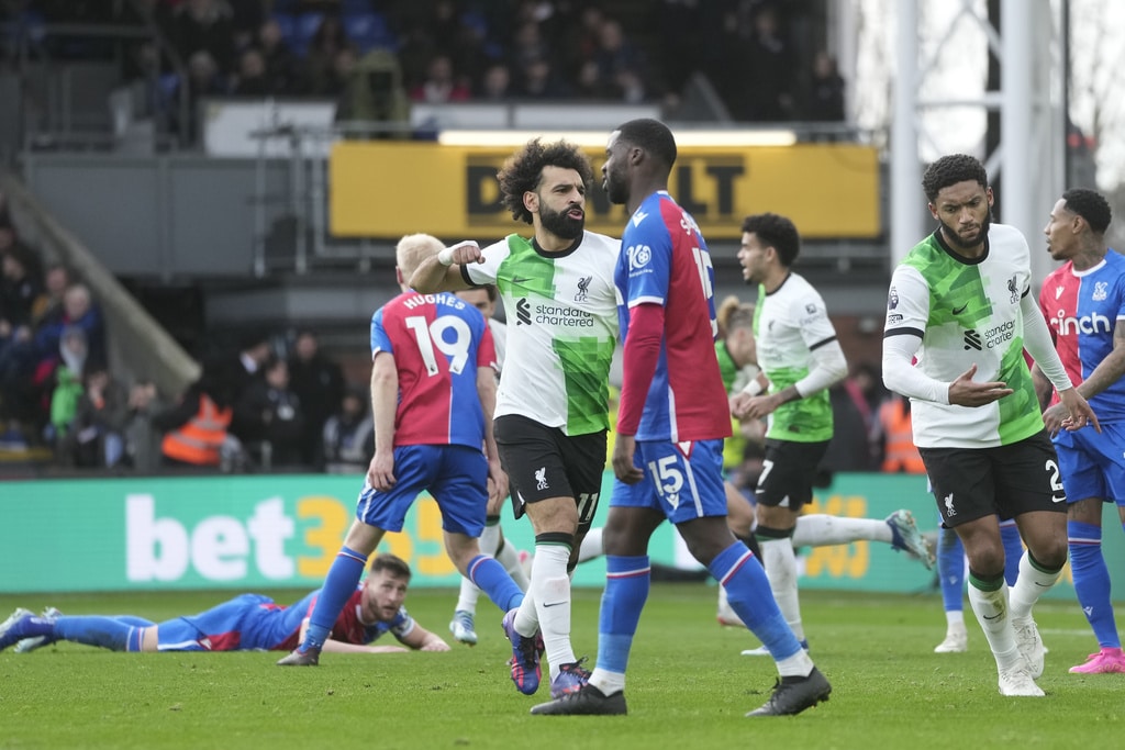 Liverpool’s Virgil van Dijk, right, challenges for the ball with Crystal Palace’s Odsonne Edouard during the Premier League soccer match between Crystal Palace and Liverpool at Selhurst Park, in London, England, Saturday, Dec. 9, 2023. (AP Photo/Kin Cheung)Crystal Palace’s Jordan Ayew leaves after receiving a red card during the Premier League soccer match between Crystal Palace and Liverpool at Selhurst Park, in London, England, Saturday, Dec. 9, 2023. (AP Photo/Kin Cheung)Liverpool’s Harvey Elliott celebrates after scoring his side’s second goal during the Premier League soccer match between Crystal Palace and Liverpool at Selhurst Park, in London, England, Saturday, Dec. 9, 2023. (AP Photo/Kin Cheung)Liverpool’s Harvey Elliott, right, celebrates after scoring his side’s second goal during the Premier League soccer match between Crystal Palace and Liverpool at Selhurst Park, in London, England, Saturday, Dec. 9, 2023. (AP Photo/Kin Cheung)Liverpool’s Harvey Elliott, right, celebrates after scoring his side’s second goal during the Premier League soccer match between Crystal Palace and Liverpool at Selhurst Park, in London, England, Saturday, Dec. 9, 2023. (AP Photo/Kin Cheung)Liverpool’s Mohamed Salah celebrates with Liverpool’s Virgil van Dijk, right, after scoring his side’s opening goal during the Premier League soccer match between Crystal Palace and Liverpool at Selhurst Park, in London, England, Saturday, Dec. 9, 2023. (AP Photo/Kin Cheung)Liverpool’s Mohamed Salah, centre, celebrates after scoring his side’s opening goal during the Premier League soccer match between Crystal Palace and Liverpool at Selhurst Park, in London, England, Saturday, Dec. 9, 2023. (AP Photo/Kin Cheung)Liverpool’s Mohamed Salah, centre, celebrates after scoring his side’s opening goal during the Premier League soccer match between Crystal Palace and Liverpool at Selhurst Park, in London, England, Saturday, Dec. 9, 2023. (AP Photo/Kin Cheung)Liverpool’s Harvey Elliott, left, challenges for the ball with Crystal Palace’s Jordan Ayew during the Premier League soccer match between Crystal Palace and Liverpool at Selhurst Park, in London, England, Saturday, Dec. 9, 2023. (AP Photo/Kin Cheung)Crystal Palace’s Chris Richards, right, challenges for the ball with Liverpool’s Cody Gakpo during the Premier League soccer match between Crystal Palace and Liverpool at Selhurst Park, in London, England, Saturday, Dec. 9, 2023. (AP Photo/Kin Cheung)Liverpool’s Luis Diaz, left, challenges for the ball with Crystal Palace’s Joachim Andersen during the Premier League soccer match between Crystal Palace and Liverpool at Selhurst Park, in London, England, Saturday, Dec. 9, 2023. (AP Photo/Kin Cheung)Crystal Palace’s Jean-Philippe Mateta, second left, celebrates with teammates after scoring his side’s opening goal during the Premier League soccer match between Crystal Palace and Liverpool at Selhurst Park, in London, England, Saturday, Dec. 9, 2023. (AP Photo/Kin Cheung)Liverpool’s Jarell Quansah, right, argues with referee Andy Madley during the Premier League soccer match between Crystal Palace and Liverpool at Selhurst Park, in London, England, Saturday, Dec. 9, 2023. (AP Photo/Kin Cheung)Liverpool’s Darwin Nunez, second right, challenges for the ball with Crystal Palace’s Jordan Ayew and Crystal Palace’s Chris Richards during the Premier League soccer match between Crystal Palace and Liverpool at Selhurst Park, in London, England, Saturday, Dec. 9, 2023. (AP Photo/Kin Cheung)Crystal Palace’s Jordan Ayew, right, challenges for the ball with Liverpool’s Wataru Endo during the Premier League soccer match between Crystal Palace and Liverpool at Selhurst Park, in London, England, Saturday, Dec. 9, 2023. (AP Photo/Kin Cheung)