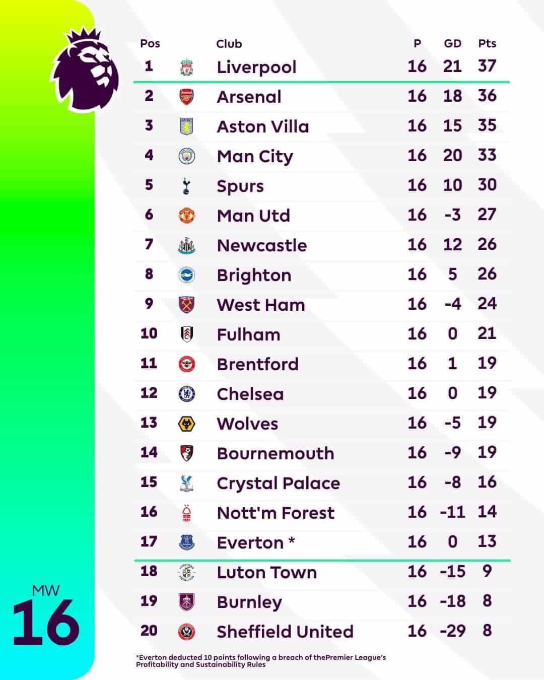 สรุปผลการแข่งขัน พรีเมียร์ลีก อังกฤษ 2023/24 หลังจบนัดที่ 16