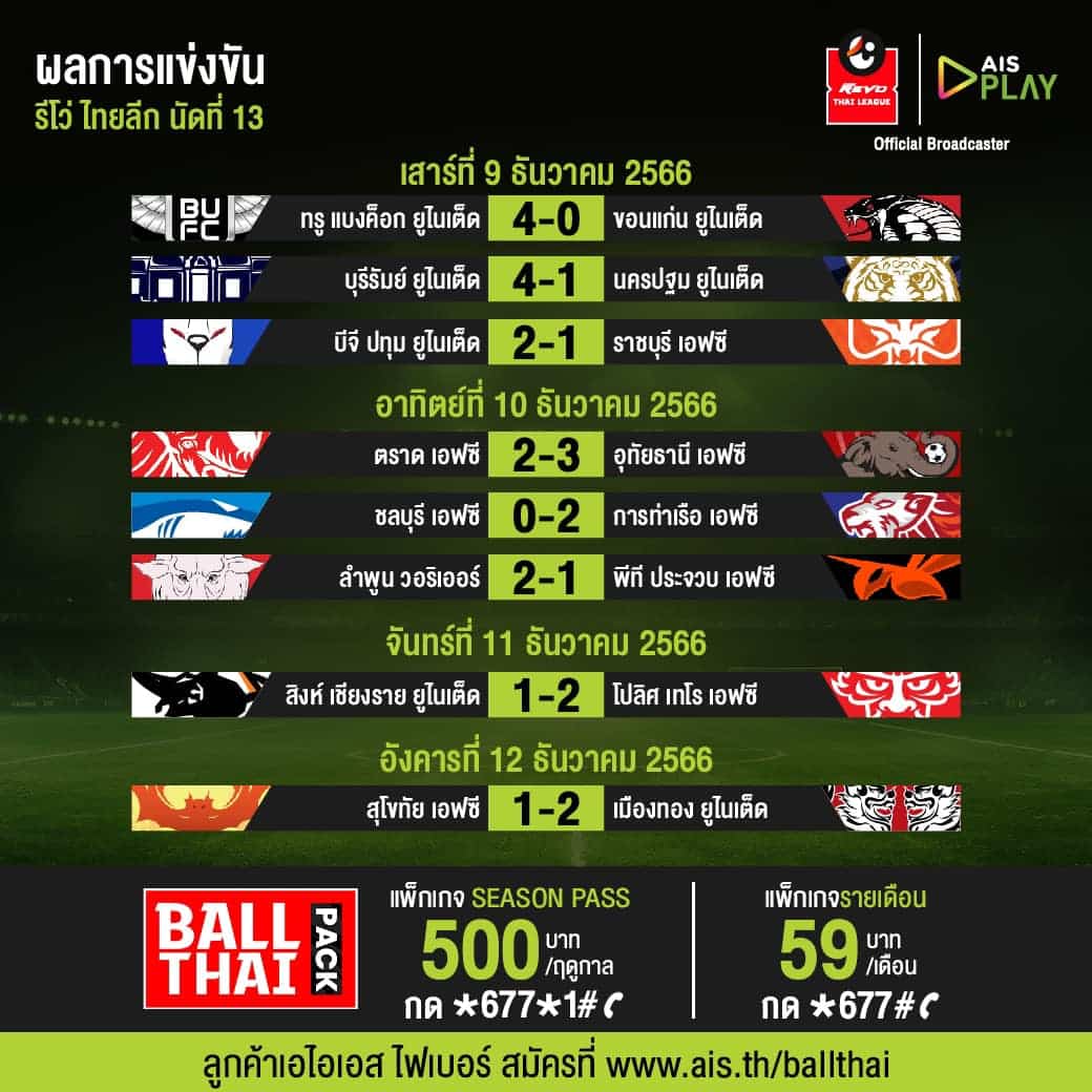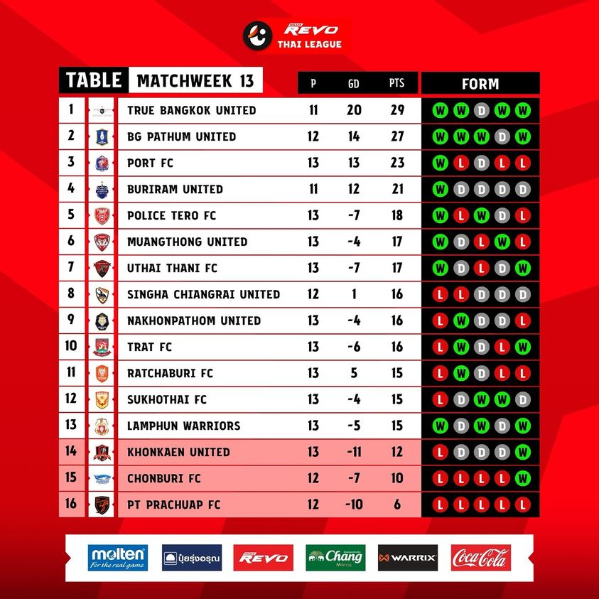 สรุปผลการแข่งขัน รีโว่ ไทยลีก 2023/24 หลังจบนัดที่ 13