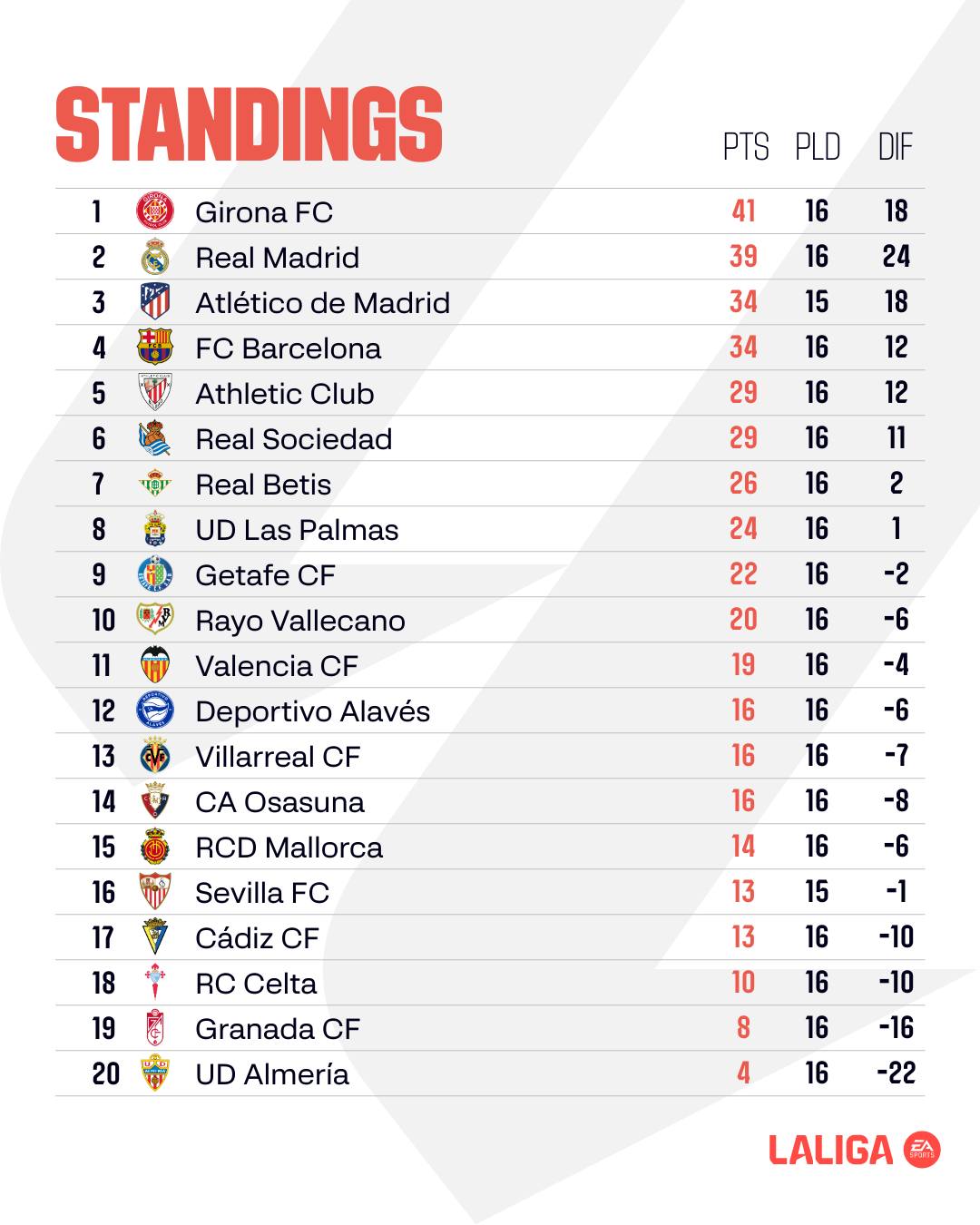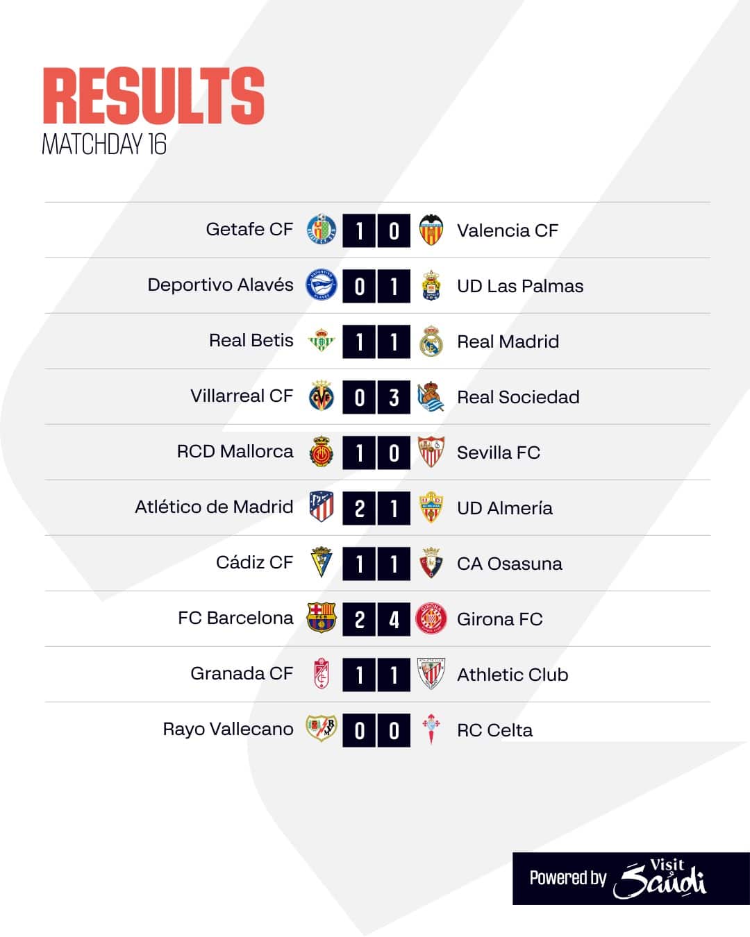 สรุปผล การแข่งขัน ลาลีกา สเปน 2023/24 หลังจบนัดที่ 16