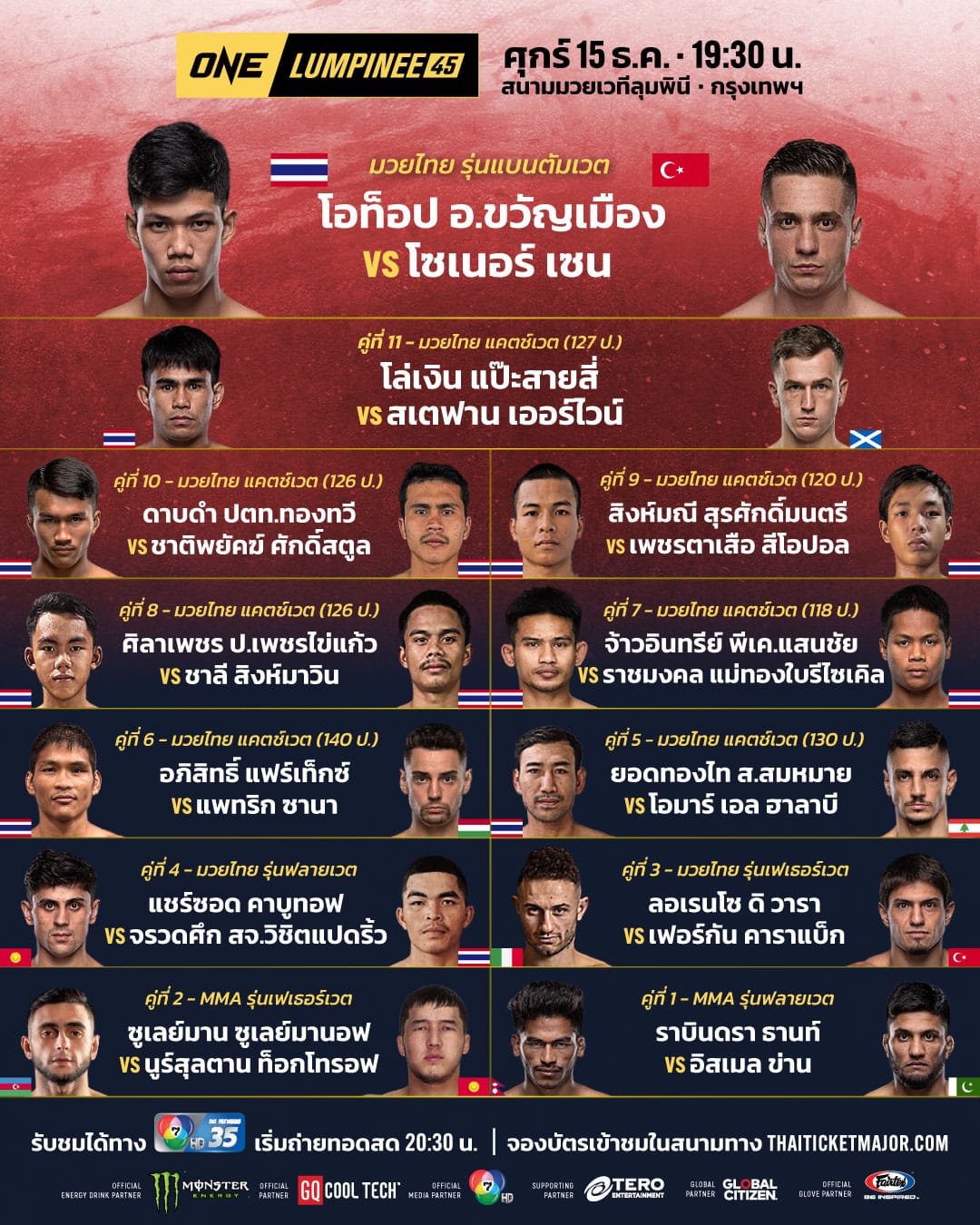 โปรแกรมการแข่งขันทุกคู่ศึก ONE ลุมพินี 45