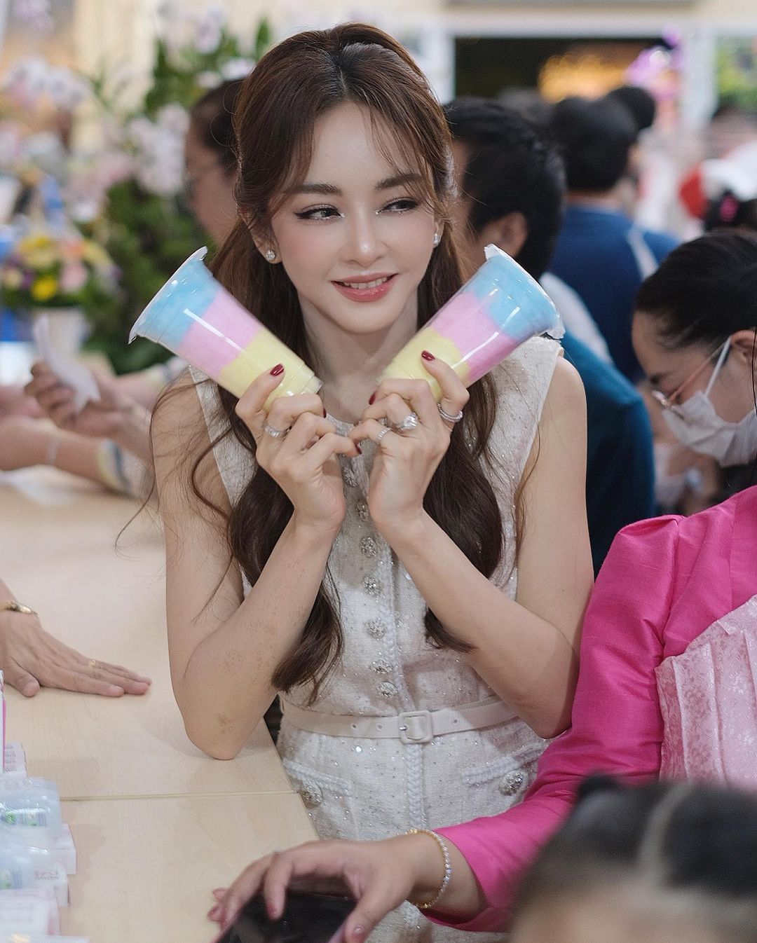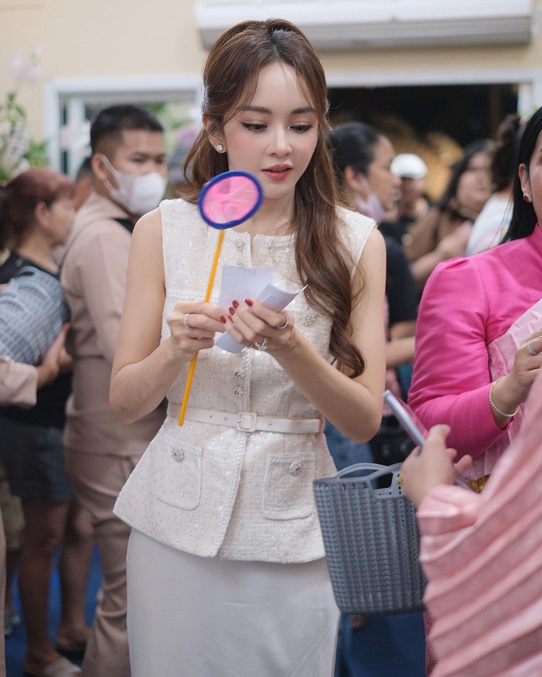 ทั้งนี้ต้องมาสะดุดกับความสวยราวกับนางฟ้าของสาวเป้ยขณะเล่นเกม แจกตั๋ว แจกขนมในซุ้มงานกาชาด มาในลุคชุดขาวทั้งตัว เมคอัพสีชมพูอ่อน กับใบหน้ายิ้มแย้ม สมแล้วที่ได้ฉายานางร้ายนางเด็กตลอดกาล