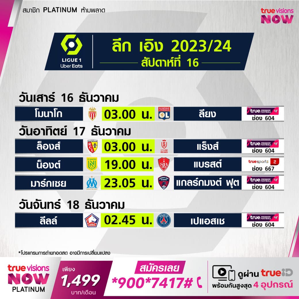 ตารางแข่งขัน ลีกเอิง ฝรั่งเศส โปรแกรมฟุตบอล ลีกเอิง 2023/24 สัปดาห์ที่ 16 ถ่ายทอดสดทาง beIN Sports และ True Sports