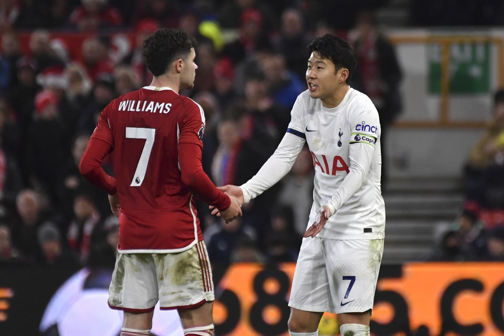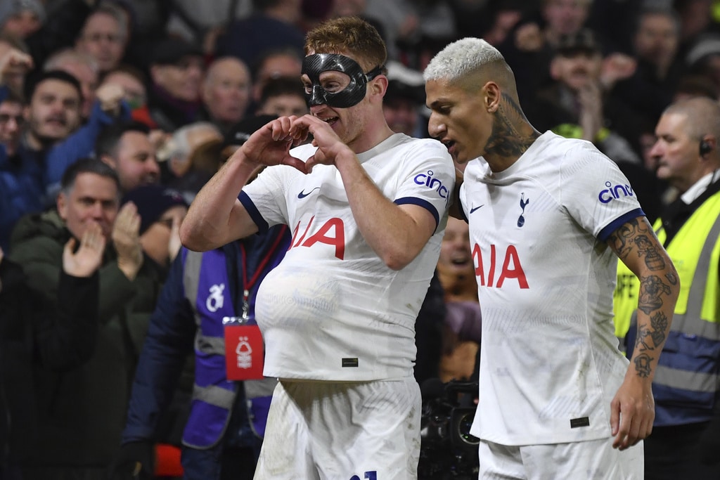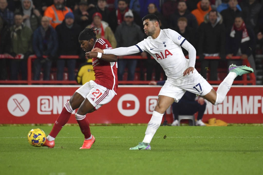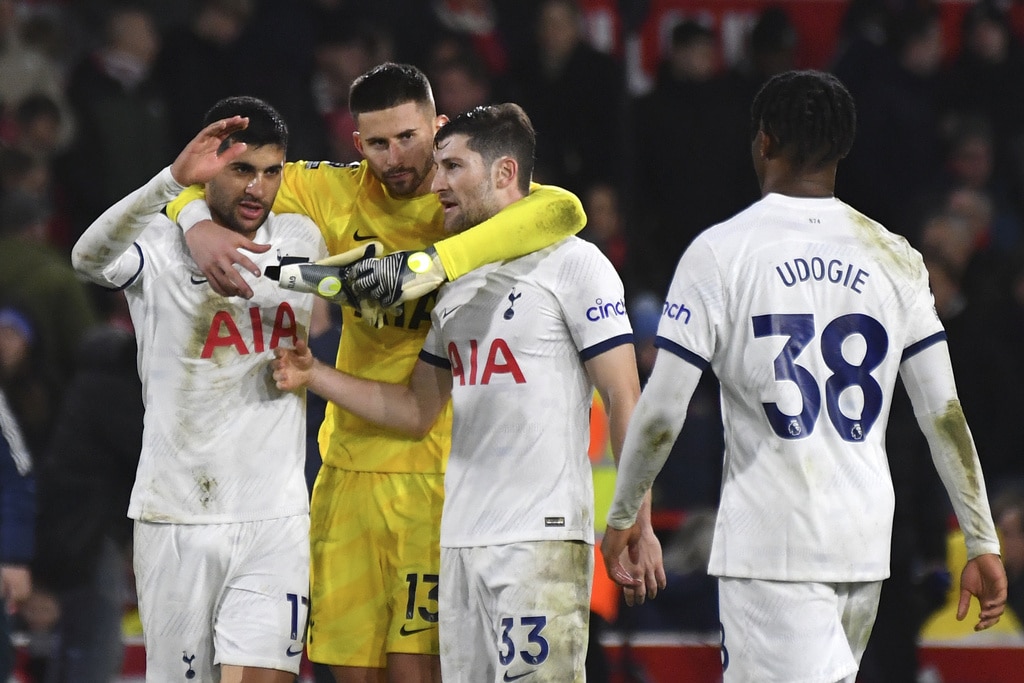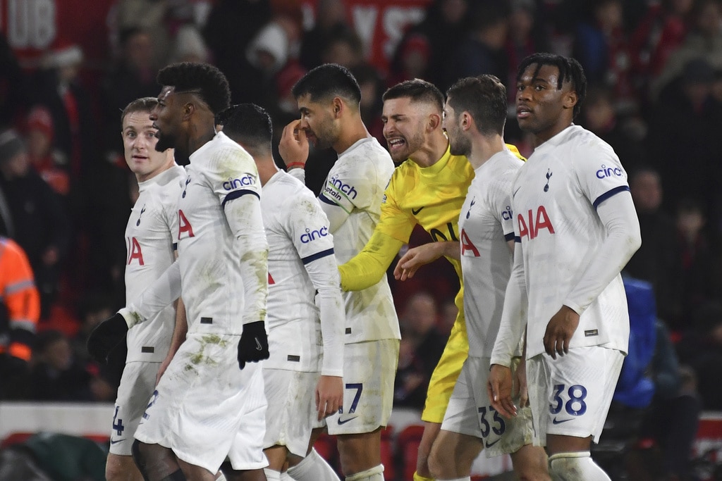 Tottenham’s Cristian Romero, right, challenges for the ball with Nottingham Forest’s Anthony Elanga during the English Premier League soccer match between Nottingham Forest and Tottenham Hotspur at City ground in Nottingham, England, Friday, Dec. 15, 2023. (AP Photo/Rui Vieira)Tottenham’s Cristian Romero, left, Tottenham’s goalkeeper Guglielmo Vicario, Tottenham’s Ben Davies, Tottenham’s Destiny Udogie, right, celebrate their victory at the English Premier League soccer match between Nottingham Forest and Tottenham Hotspur at City ground in Nottingham, England, Friday, Dec. 15, 2023. (AP Photo/Rui Vieira)Tottenham’s head coach Ange Postecoglou applaud supporters at the end of the English Premier League soccer match between Nottingham Forest and Tottenham Hotspur at City ground in Nottingham, England, Friday, Dec. 15, 2023. (AP Photo/Rui Vieira)Tottenham Hotspur players celebrate their victory at the English Premier League soccer match between Nottingham Forest and Tottenham Hotspur at City ground in Nottingham, England, Friday, Dec. 15, 2023. (AP Photo/Rui Vieira)Nottingham Forest’s goalkeeper Matt Turner in action during the English Premier League soccer match between Nottingham Forest and Tottenham Hotspur at City ground in Nottingham, England, Friday, Dec. 15, 2023. (AP Photo/Rui Vieira)Tottenham’s Son Heung-min, right, discusses with Nottingham Forest’s Neco Williams during the English Premier League soccer match between Nottingham Forest and Tottenham Hotspur at City ground in Nottingham, England, Friday, Dec. 15, 2023. (AP Photo/Rui Vieira)Tottenham’s Dejan Kulusevski celebrates after scoring his side’s second goal during the English Premier League soccer match between Nottingham Forest and Tottenham Hotspur at City ground in Nottingham, England, Friday, Dec. 15, 2023. (AP Photo/Rui Vieira)Tottenham’s Dejan Kulusevski, left, celebrates with Tottenham’s Richarlison after scoring his side’s second goal during the English Premier League soccer match between Nottingham Forest and Tottenham Hotspur at City ground in Nottingham, England, Friday, Dec. 15, 2023. (AP Photo/Rui Vieira)Tottenham’s Dejan Kulusevski, left, celebrates with Tottenham’s Richarlison after scoring his side’s opening goal during the English Premier League soccer match between Nottingham Forest and Tottenham Hotspur at City ground in Nottingham, England, Friday, Dec. 15, 2023. (AP Photo/Rui Vieira)Tottenham’s Destiny Udogie challenges for the ball with Nottingham Forest’s Neco Williams, bottom, during the English Premier League soccer match between Nottingham Forest and Tottenham Hotspur at City ground in Nottingham, England, Friday, Dec. 15, 2023. (AP Photo/Rui Vieira)Nottingham Forest’s Ryan Yates, left, Nottingham Forest’s Anthony Elanga, centre, Nottingham Forest’s Neco Williams during the English Premier League soccer match between Nottingham Forest and Tottenham Hotspur at City ground in Nottingham, England, Friday, Dec. 15, 2023. (AP Photo/Rui Vieira)Nottingham Forest’s Harry Toffolo, left, challenges for the ball with Tottenham’s Pedro Porro during the English Premier League soccer match between Nottingham Forest and Tottenham Hotspur at City ground in Nottingham, England, Friday, Dec. 15, 2023. (AP Photo/Rui Vieira)